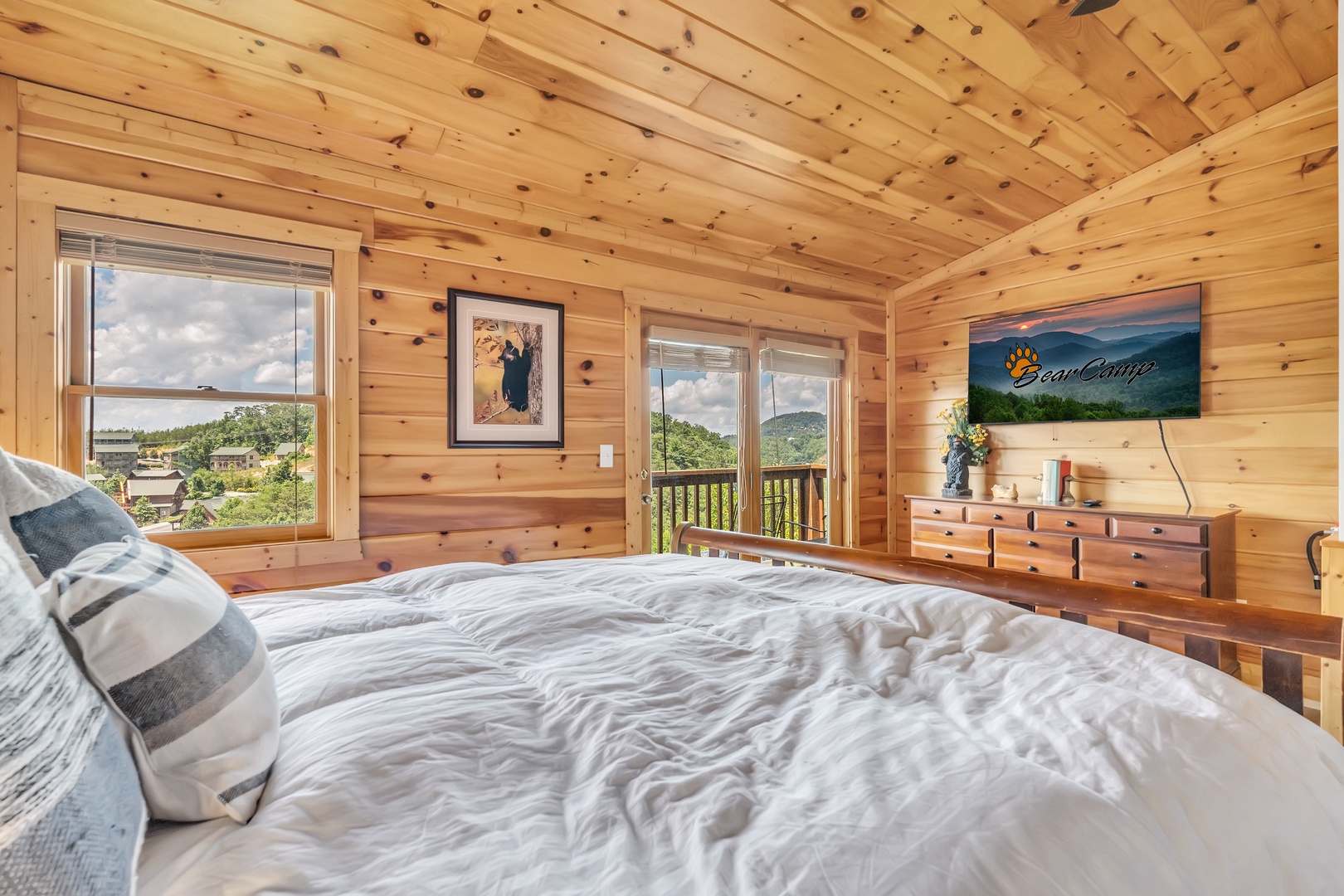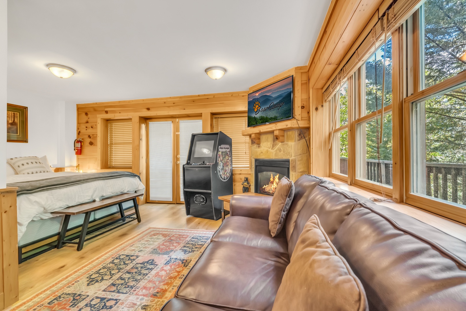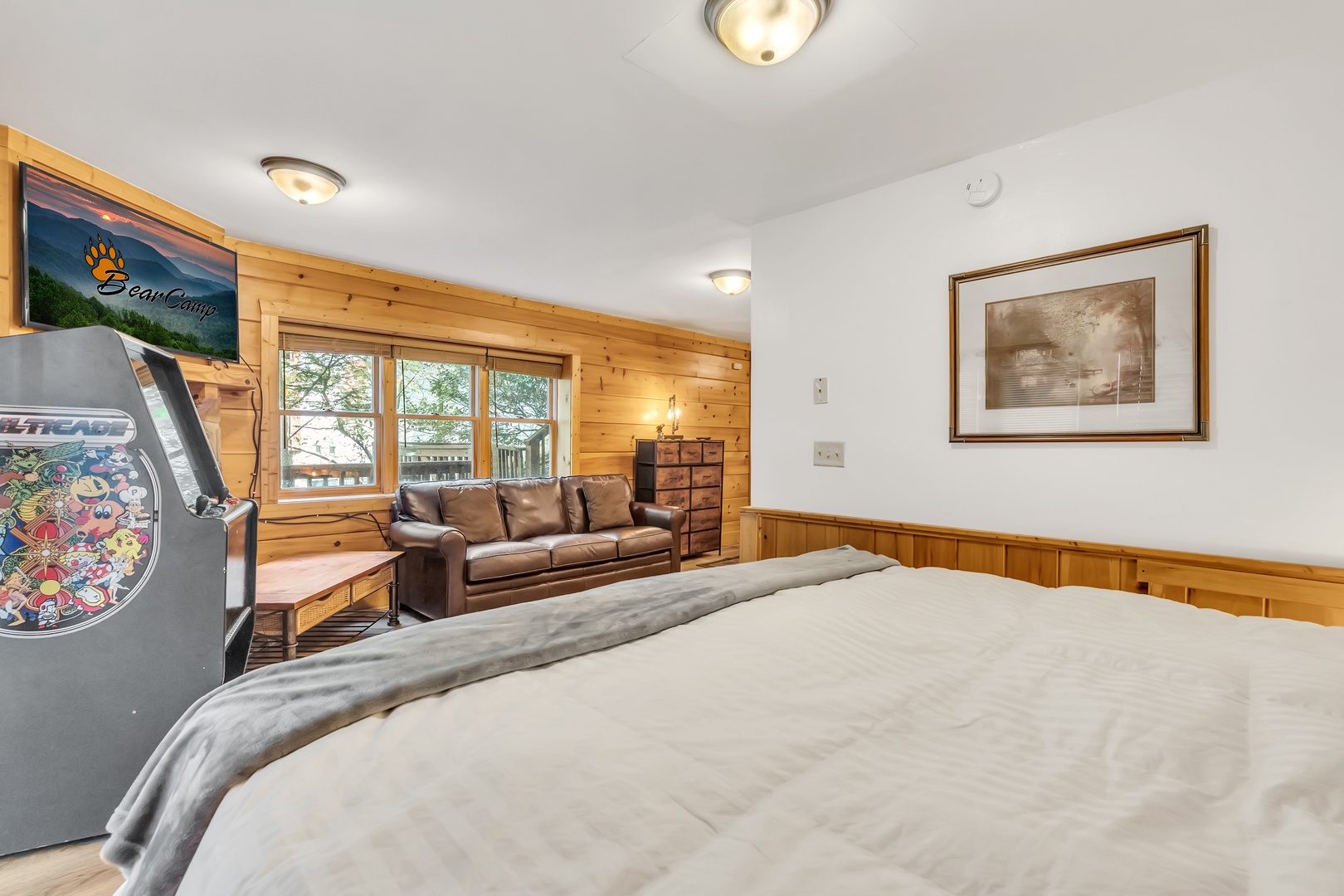 Welcome to the Golf View Resort in Pigeon Forge, where you'll find this charming three-level townhouse cabin, offering a delightful combination of comfort and amenities. Nestled within the resort, this cabin provides a fantastic vacation experience for guests seeking relaxation and entertainment. The main floor greets you with a warm and inviting living room featuring a cozy fireplace, creating the perfect ambiance for gatherings with family and friends. Adjacent to the living area is a dining area, allowing you to enjoy meals together. The fully equipped kitchen provides all the essential appliances and utensils you need to prepare delicious meals. Additionally, a full bathroom with a washer and dryer is available on this floor for your convenience. Step outside onto the deck and discover a hot tub, inviting you to unwind and soak. Ascending to the top floor, you'll find an open loft area with a Twin Daybed ideal for additional sleeping arrangements or a cozy reading nook. This floor also houses a private King Master ensuite, complete with its own deck, offering a tranquil space to enjoy your morning coffee or stargaze at night. The additional 2 twins are rollaways located in the upper bedroom closet Descending to the bottom floor, you'll discover an open studio-style room designed for entertainment and relaxation. It features a kitchenette, allowing you to prepare snacks and beverages easily. The room offers a comfortable King bed and a queen bed, ensuring ample sleeping space for guests. A full bathroom is also available on this level. Entertainment options abound with an arcade game and a fireplace, creating a cozy atmosphere. From this floor, you can access the lower-level deck, providing a peaceful outdoor retreat. The Golf View Resort itself offers an array of amenities for guests to enjoy. Take a dip in the indoor or outdoor pool, perfect for cooling off on warm days. Relax and rejuvenate in the sauna, allowing your cares to melt away. If you prefer to dine al fresco, the community grilling area provides an ideal space for cookouts and picnics. Whether you're seeking relaxation, family bonding, or entertainment, this three-level townhouse cabin in Golf View Resort has everything you need for a memorable vacation experience. Unwind in the hot tub, enjoy the resort amenities, and create lasting memories in the beautiful surroundings of Pigeon Forge.