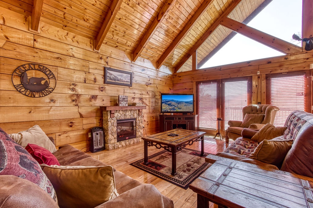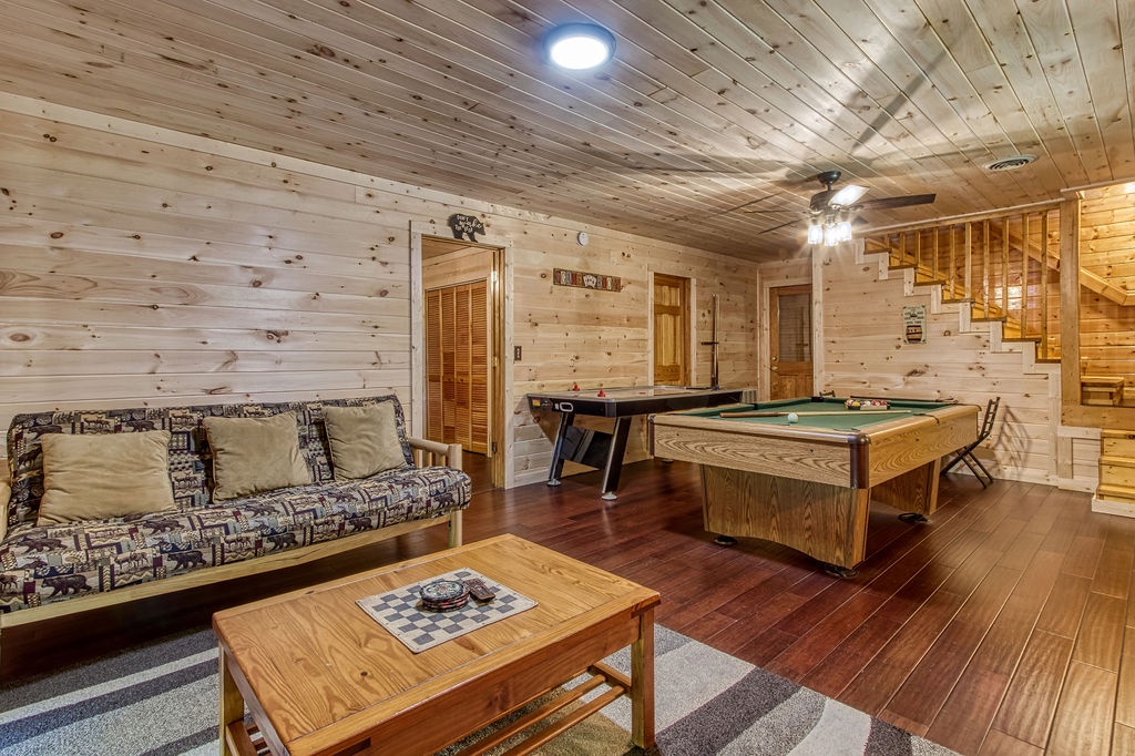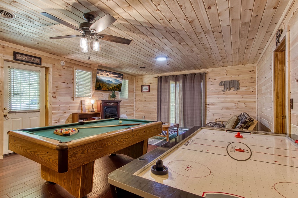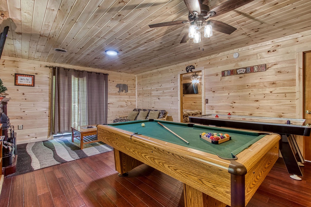 Your family will fall in love with this spacious cabin near Pigeon Forge. "Livin' Lodge" features all the amenities a large group could ask for, including space to sleep up to 16 and plenty of room indoors and out. You have an easy drive with a huge gravel parking area great for someone with bigger vehicles. Be amazed at all the open outdoor space with the sitting area, fire pit, and park grill all to the right of the driveway. Once inside you will be taken away by the openness of the main level with tall windows letting the sunlight in to wash over you. The living area features lots of space to relax and unwind. Curl up by the electric fireplace with a good book or watch your favorite show on the flat screen tv. On the left side of the spacious main floor, you'll find a spacious, fully equipped kitchen that has everything you need for family dinners. With a breakfast bar and stools a few feet away. You'll never run out of space for everyone to gather. On the same level, you will have a King bedroom, with a dresser, a TV, and a full bath. Finish out your day by soaking in the bubbly hot tub that is in a covered room on this level right outside the kitchen. Your cabin also includes WIFI and a washer and dryer for your convenience. The upper-level loft boasts additional sleeping accommodations and seating space, having 2 recliners and a daybed where you can sit with friends. When it's time to turn in, relax on the daybed and pull out the trundle, so everyone has a place to sleep in total comfort. The loft also features a King Suite with a Jacuzzi tub perfect for relaxing before bed. The lower level of your rental features a game room with a TV, pool table, and air hockey. Nearby you'll find a bedroom complete with a king bed, a dresser, a TV, and a full bath. For visitors with large groups or families, the lower level also offers extra sleeping space with an additional futon and two sets of twin bunk beds. This area will be perfect for kids and adults just looking to chill or hang out inside on a rainy day. All in all, there will be nothing, but wonderful memories made, and time spent at this property. If you are looking to book a family vacation or weekend retreat, “Livin’ Lodge” is the perfect cabin for your family. All in all, there will be nothing, but wonderful memories made, and time spent at this property. If you are looking to book a family vacation or weekend retreat, “Livin’ Lodge” is the perfect cabin for your family.