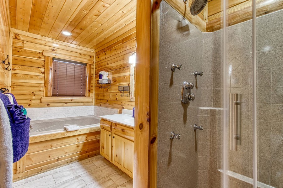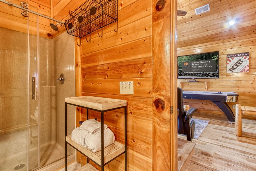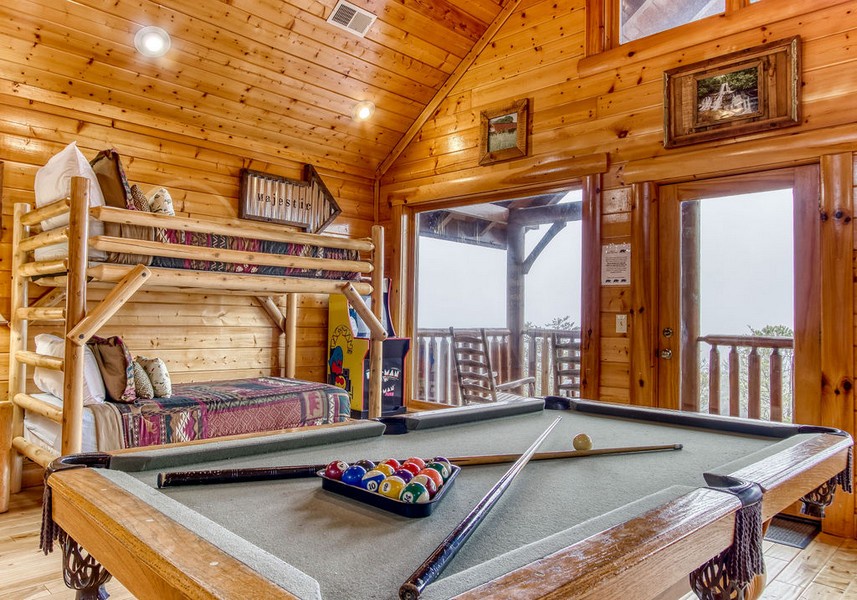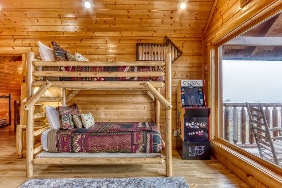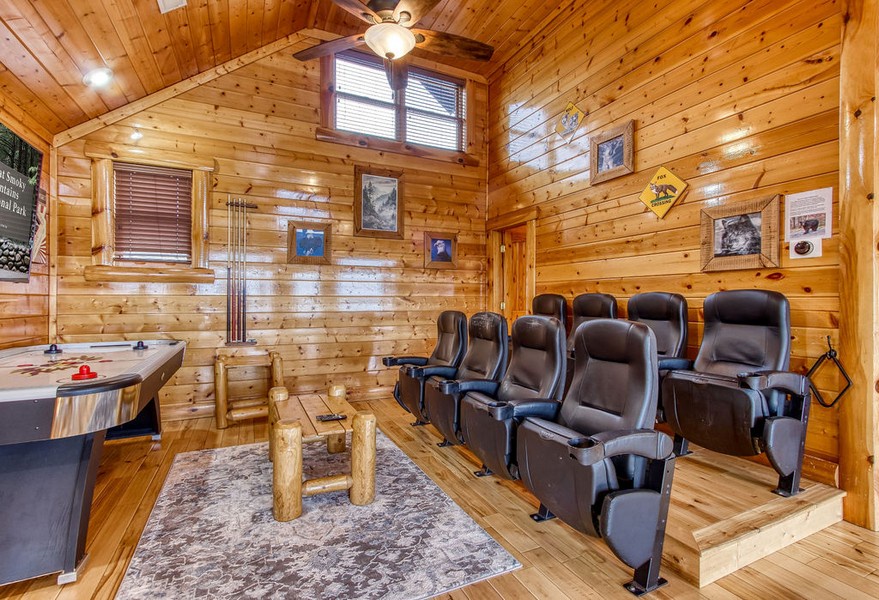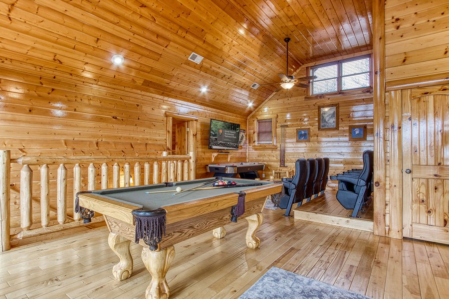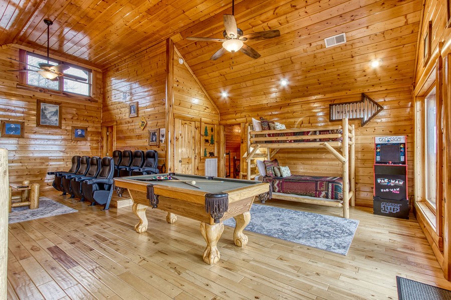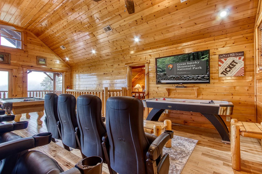"Majestic Highbearnation" is an all-natural wood, modern rustic log cabin, that provides comfort and luxury. With its open floor plan, modern furniture, and large windows bringing the outdoors in, this cabin embraces nature and provides absolutely, stunning views of the Great Smoky Mountains. "Majestic Highbearnation" comfortably sleeps 12 people in this 2-story cabin. This 2800 square foot home features 4-bedrooms and 3-bathrooms, with spacious parking up to 6 vehicles comfortably. The main floors open concept comes with a fully equipped grand kitchen, as well as a standalone island. The island is a great place to set up for a buffet-style meal, either prepared indoors or outside on the charcoal BBQ grill, used as extra seating with 4 high top log stools, a place to enjoy electronic devices, or to simply relax. The dining area includes an extended log-style table, that easily seats 10-12 people. Alongside the kitchen is the main living area, with a large screen television, new sofa sleeper, and a love seat. A great space to embrace a good conversation while enjoying the ambiance of the electric fireplace or look over the night sky. Before heading upstairs, be sure to check out the 2-bedrooms suites on the main level. The bedroom suites provide pure luxury, each bedroom offers a King-size bed and a private bathroom. The bathrooms highlight an independent tub/shower. When retreating to one of the bedroom suite bathrooms, enjoy a soak in a large jetted Jacuzzi tub or enjoy a jetted body shower with rain shower head, and brand-new glass shower doors. Venture upstairs to discover an ultimate game room, featuring a home theater, twin bunk beds, 2-bedrooms with King-size beds, and 1-bathroom. The game room offers a pool table, air hockey, arcade system, board games, and books. Enjoy the newly felted pool table or the tiered theater seating for 8. Nestle up with a blanket and enjoy a movie on the large screen TV, curl up on a bunk bed, or relax in one of the sitting chairs to read or enjoy the view of the amazing sunrises, sunsets, or morning mist rising in the valley giving credence to the name "Smoky Mountains". "Majestic Highbearnation" has decks on the mountainside of the property on both stories, open to the majestic view. Enjoy relaxing in one of the many deck rocking chairs, with a beverage and blanket, and watch the wildlife in the forest below. If you listen closely you can hear the nearby stream. Take time to relax and enjoy the spectacular view right from the comfort of the hot tub on the main level deck. Attractions are just underfoot, just under 10 miles away, on easy to drive-freshly paved roads to Pigeon Forge. There are many activities to enjoy in the Pigeon Forge area to include; Dollywood, Dinner Shows, Mini-Golf, Go-Carts, Restaurants, and so much more. If you are looking to experience nature or want to hike, visit Ripley's Aquarium, then travel down to Gatlinburg and enjoy the Great Smoky Mountains National Park. This cabin also offers free pool access with a catch and release pond at Honeysuckle Meadows Deli and Pool for those days you just want to relax and let the kids play in the water or go fishing in the catch and release pond. If you are wanting a relaxing vacation in luxury, then "Majestic Highbearnation" is the perfect cabin for your next mountain vacation. W