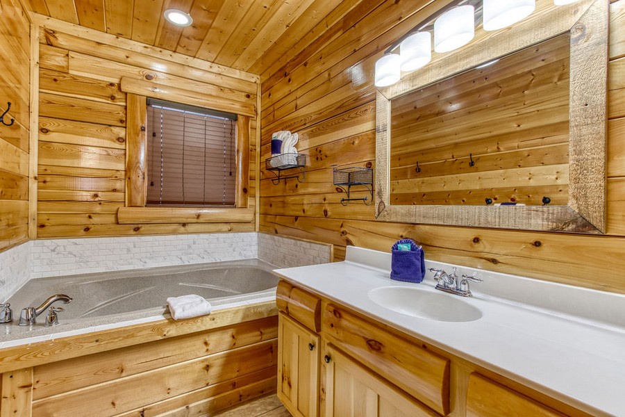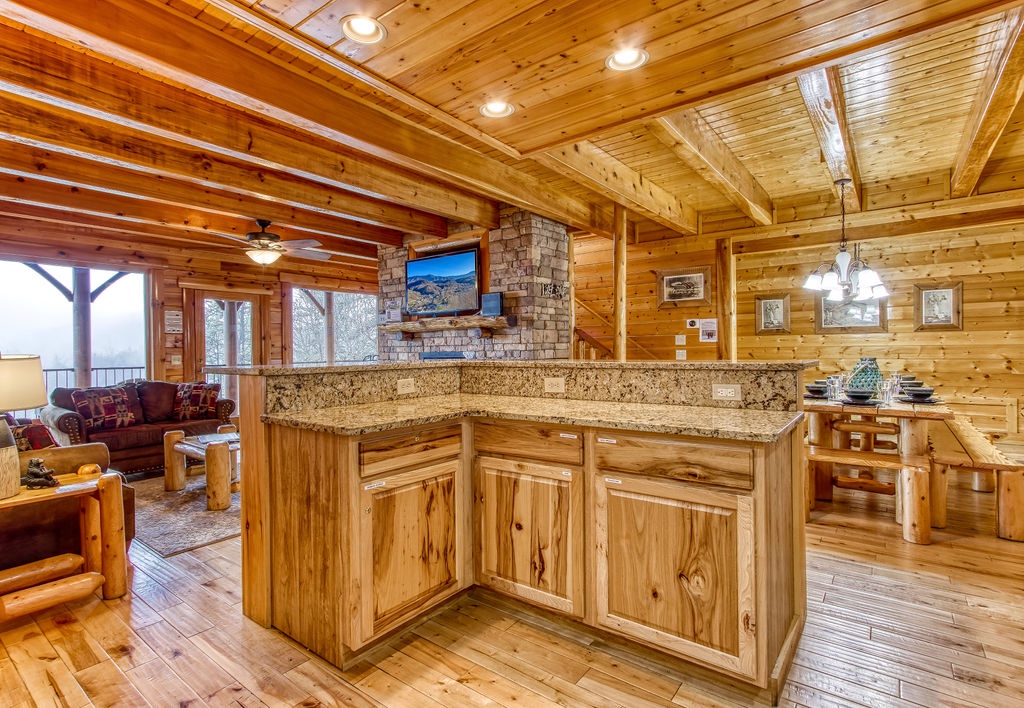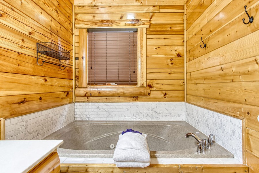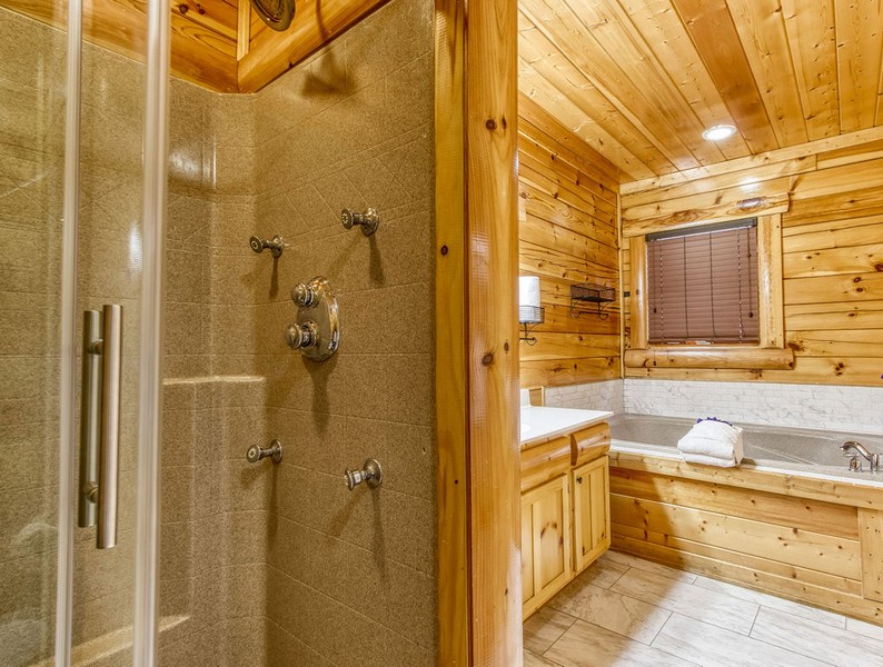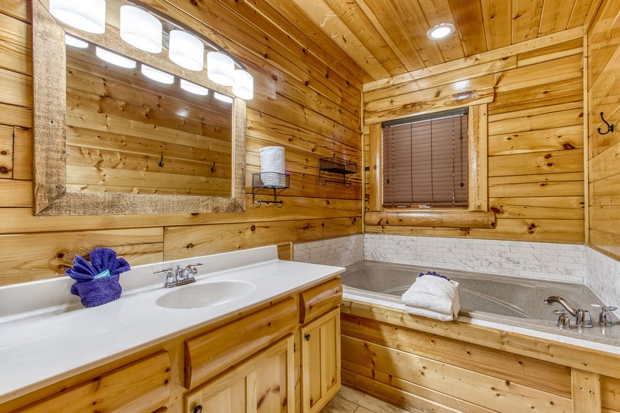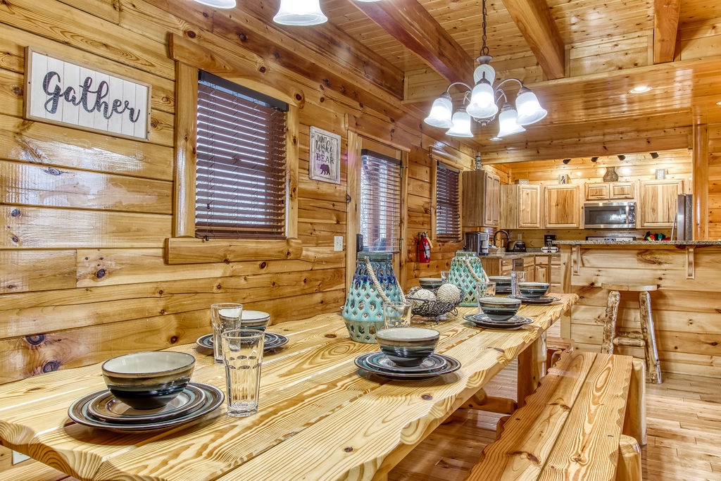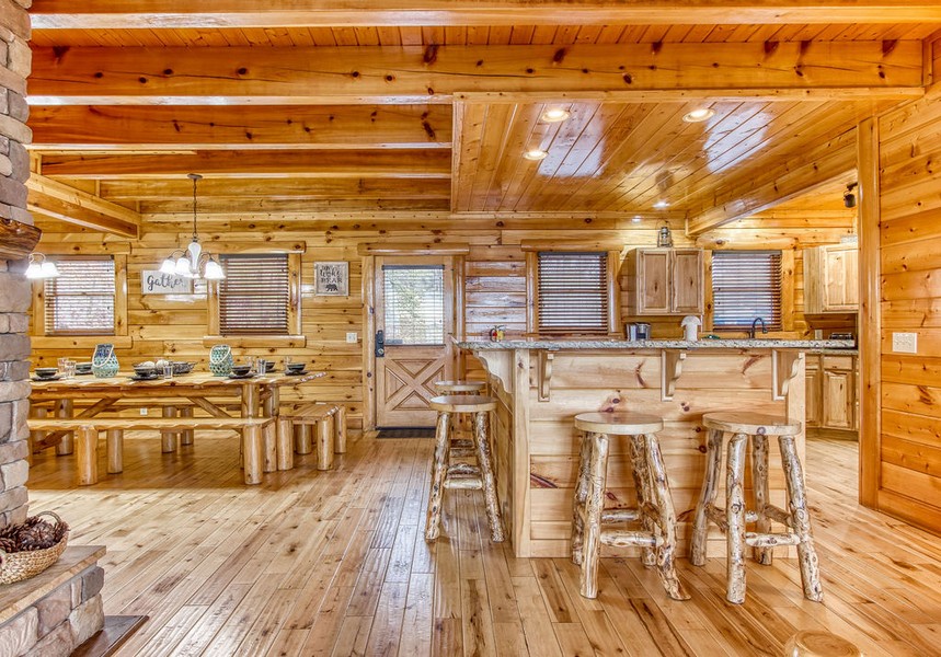 "Majestic Highbearnation" is an all-natural wood, modern rustic log cabin, that provides comfort and luxury. With its open floor plan, modern furniture, and large windows bringing the outdoors in, this cabin embraces nature and provides absolutely, stunning views of the Great Smoky Mountains. "Majestic Highbearnation" comfortably sleeps 12 people in this 2-story cabin. This 2800 square foot home features 4-bedrooms and 3-bathrooms, with spacious parking up to 6 vehicles comfortably. The main floors open concept comes with a fully equipped grand kitchen, as well as a standalone island. The island is a great place to set up for a buffet-style meal, either prepared indoors or outside on the charcoal BBQ grill, used as extra seating with 4 high top log stools, a place to enjoy electronic devices, or to simply relax. The dining area includes an extended log-style table, that easily seats 10-12 people. Alongside the kitchen is the main living area, with a large screen television, new sofa sleeper, and a love seat. A great space to embrace a good conversation while enjoying the ambiance of the electric fireplace or look over the night sky. Before heading upstairs, be sure to check out the 2-bedrooms suites on the main level. The bedroom suites provide pure luxury, each bedroom offers a King-size bed and a private bathroom. The bathrooms highlight an independent tub/shower. When retreating to one of the bedroom suite bathrooms, enjoy a soak in a large jetted Jacuzzi tub or enjoy a jetted body shower with rain shower head, and brand-new glass shower doors. Venture upstairs to discover an ultimate game room, featuring a home theater, twin bunk beds, 2-bedrooms with King-size beds, and 1-bathroom. The game room offers a pool table, air hockey, arcade system, board games, and books. Enjoy the newly felted pool table or the tiered theater seating for 8. Nestle up with a blanket and enjoy a movie on the large screen TV, curl up on a bunk bed, or relax in one of the sitting chairs to read or enjoy the view of the amazing sunrises, sunsets, or morning mist rising in the valley giving credence to the name "Smoky Mountains". "Majestic Highbearnation" has decks on the mountainside of the property on both stories, open to the majestic view. Enjoy relaxing in one of the many deck rocking chairs, with a beverage and blanket, and watch the wildlife in the forest below. If you listen closely you can hear the nearby stream. Take time to relax and enjoy the spectacular view right from the comfort of the hot tub on the main level deck. Attractions are just underfoot, just under 10 miles away, on easy to drive-freshly paved roads to Pigeon Forge. There are many activities to enjoy in the Pigeon Forge area to include; Dollywood, Dinner Shows, Mini-Golf, Go-Carts, Restaurants, and so much more. If you are looking to experience nature or want to hike, visit Ripley's Aquarium, then travel down to Gatlinburg and enjoy the Great Smoky Mountains National Park. This cabin also offers free pool access with a catch and release pond at Honeysuckle Meadows Deli and Pool for those days you just want to relax and let the kids play in the water or go fishing in the catch and release pond. If you are wanting a relaxing vacation in luxury, then "Majestic Highbearnation" is the perfect cabin for your next mountain vacation. W