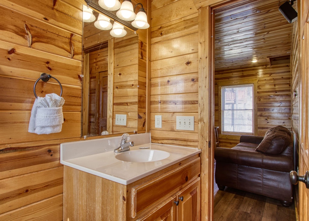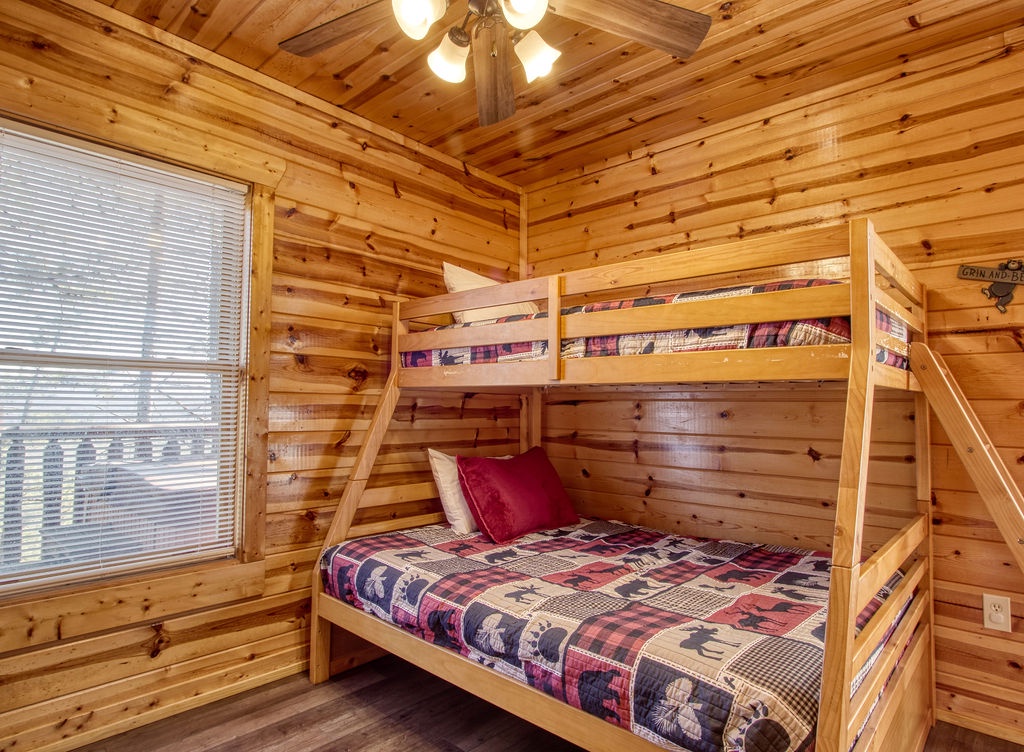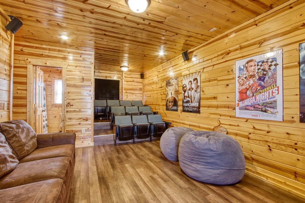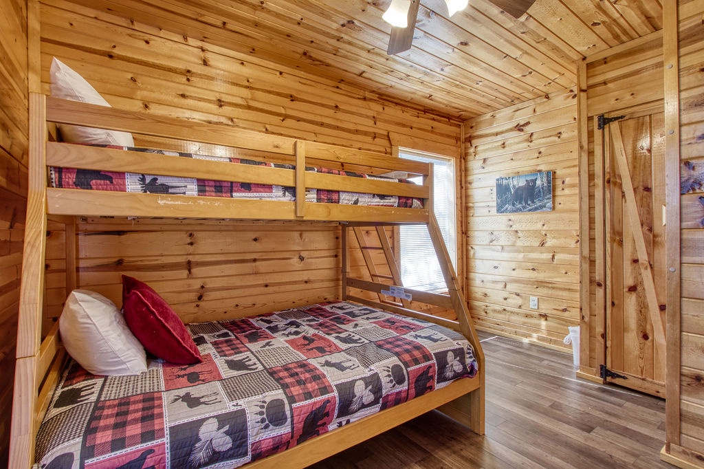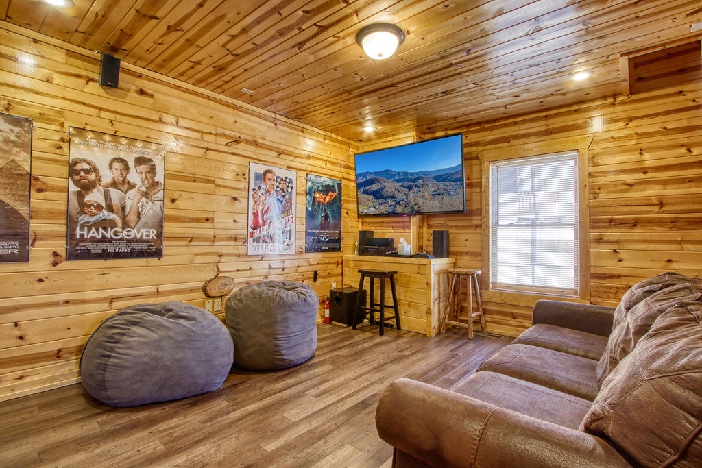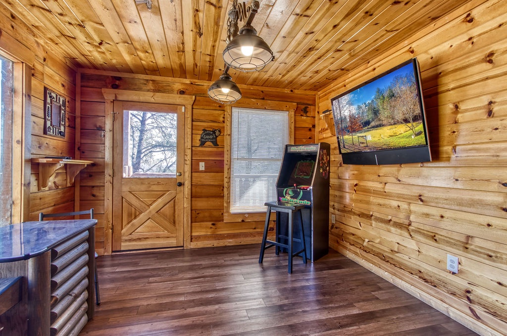 (This Awesome Cabin is located next door to The Majestic View Cabin) "Moonlight Getaway" is a 4-bedroom 3-bathroom that sleeps 10. Located in The Summit, you are less than 15 minutes from Pigeon Forge and Dollywood with paved roads all the way to the property and can park two cars easily. Entering on the main level, get ready to relax in the living room on the and sofa while enjoying a movie on the 55-inch TV in front of the cozy, gas fireplace. In the fully equipped kitchen, you'll find all cookware and utensils needs for your stay. Just behind the living area, you'll find a small entertainment space with 2 arcades for your gaming pleasure. Outside on the back deck, whip up your favorite meal on the gas grill and relax after dinner in the rocking chairs. The queen bedroom on the main level is the perfect spot to relax and unwind. Curl up in the queen bed and enjoy watching a movie on the TV. This room also has a closet and a dresser for your luggage. Head upstairs where you will find a master bedroom with a king bed. Other features include a chair, as well as a dresser for your convenience. Additionally, this space also features a full bath and a jacuzzi tub where you can relax and unwind before heading to sleep. Downstairs on the lower level, is a family theater and additional sleeper sofa. There is two more bedrooms also on this level. The 1st bedroom has a twin over a full bunk bed, and a TV. The 2nd bedroom nearby, you'll find a comfortable king bed, a dresser, a TV as well as a Fireplace. This level additionally features a convenient full bath and the bottom deck also features rockers, as well as a hot tub where you can unwind and let the bubbles relax you. This property will give you just what you have been looking for and more in your family vacation home. This rental sits beside "The Majestic View," “All About The View”, and “ Enchanted View” which are other scenic getaways on our program, and can be rented by those for those with large groups.