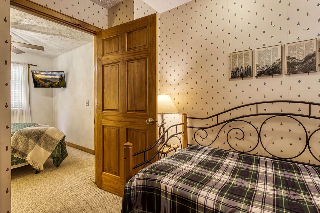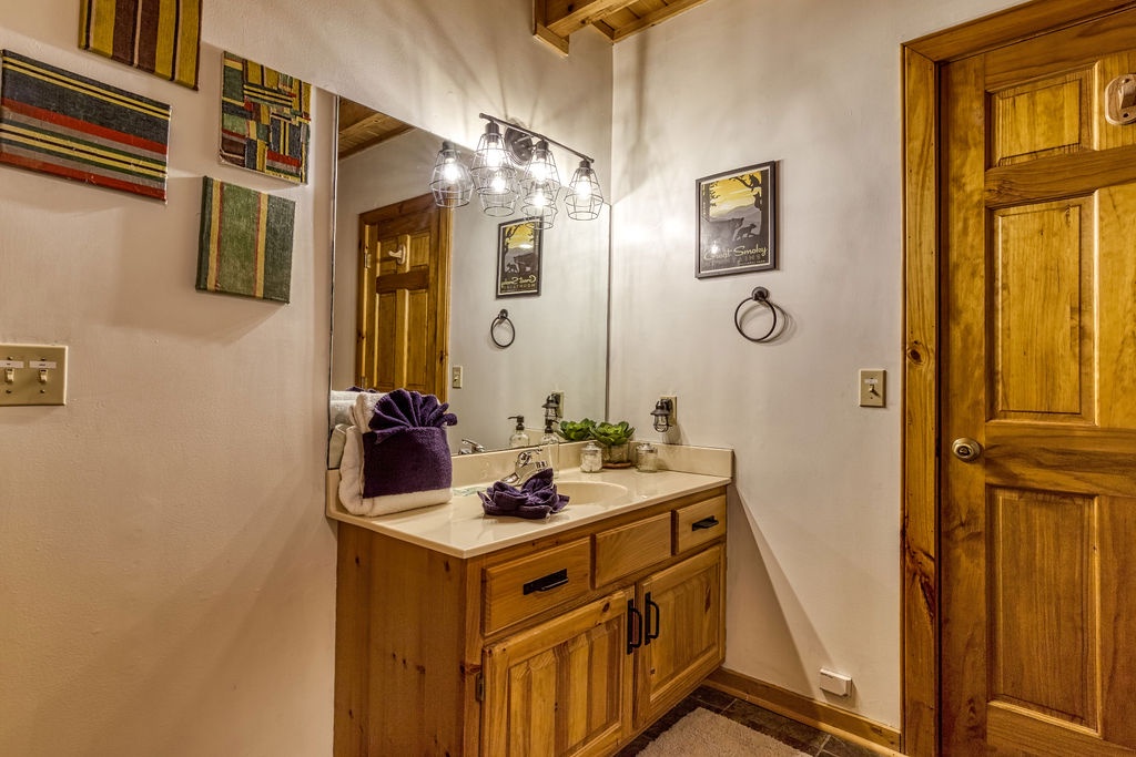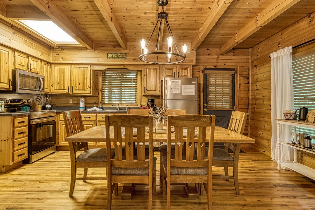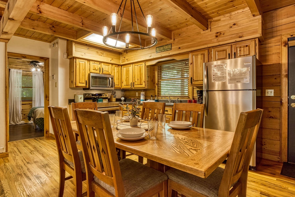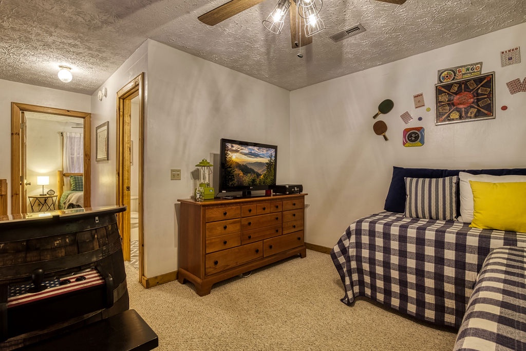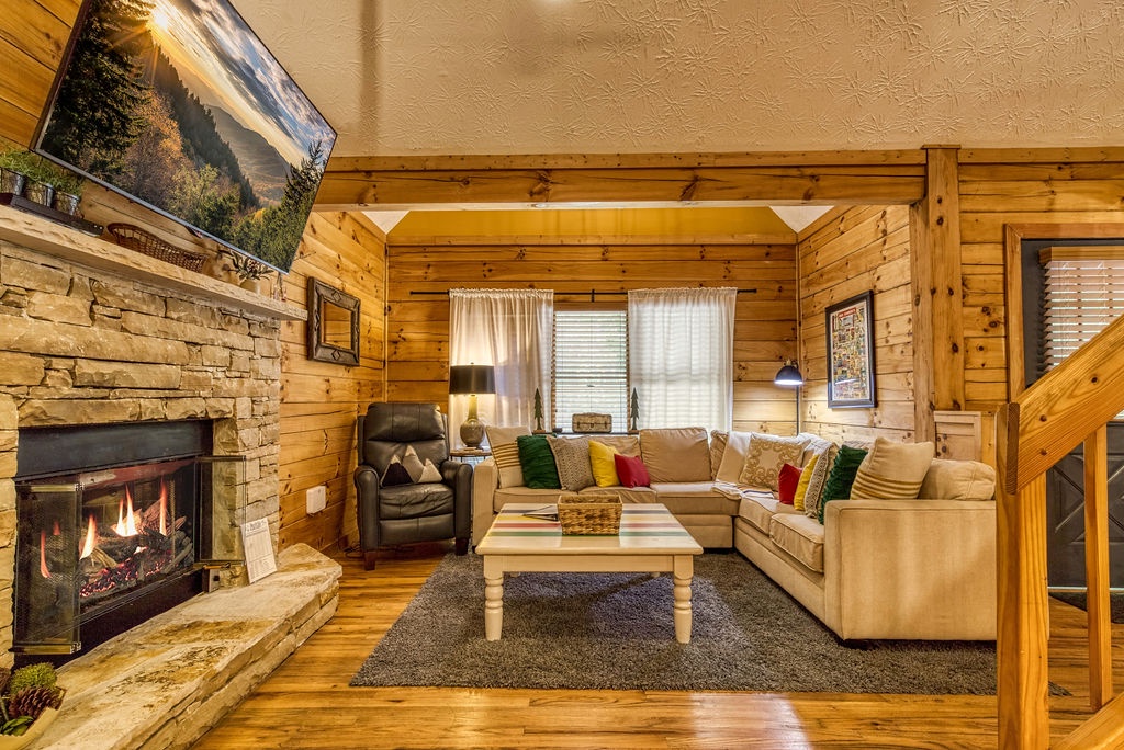 Welcome to the enchanting "Moonrise Cabin," a tranquil haven nestled in the heart of the Smoky Mountains. Located just off the beaten path between the charming towns of Pigeon Forge and Gatlinburg, this splendid 2-level, 2-bedroom, 2-bathroom cabin is the ideal retreat for a family of 7. With just two steps from the paved driveway to the front door, accessibility is a breeze. As you step inside "Moonrise Cabin," you'll instantly be captivated by its cozy charm. The main floor boasts an inviting open plan, perfect for family gatherings. Gather around the gas fireplace in the living area and enjoy your favorite family movie on the large flat-screen TV. The dining area provides comfortable seating for six, and the fully equipped kitchen is ready to accommodate any meal preparation. For those who need to stay connected or catch up on work or schoolwork while on vacation, there's a convenient working nook adjacent to the bedroom. The Queen bedroom on the main floor offers a flat-screen TV and connects to a bathroom that conveniently opens back up to the living room. Step through the dining room to discover the back screened-in porch, featuring a spacious hot tub where you can unwind and soak in the serene surroundings. Venturing to the top floor, you'll be greeted by an open loft area that includes two twin beds and an arcade game system for hours of family entertainment. A shared hall bathroom is conveniently located nearby. The second Queen bedroom on this floor also boasts a flat-screen TV, and adjacent to it, you'll find another small room with a twin bed, as well as a washer and dryer for your convenience. Outside, by the driveway, you'll have a charcoal grill for memorable family BBQs. Take advantage of the cabin's proximity to the Great Smoky Mountains National Park by embarking on a day drive or hiking adventure, immersing yourself in the breathtaking natural beauty that surrounds "Moonrise Cabin." Whether you're seeking relaxation, outdoor exploration, or quality family time, "Moonrise Cabin" provides the perfect setting for an unforgettable Smoky Mountain getaway. Experience the magic of the mountains from the