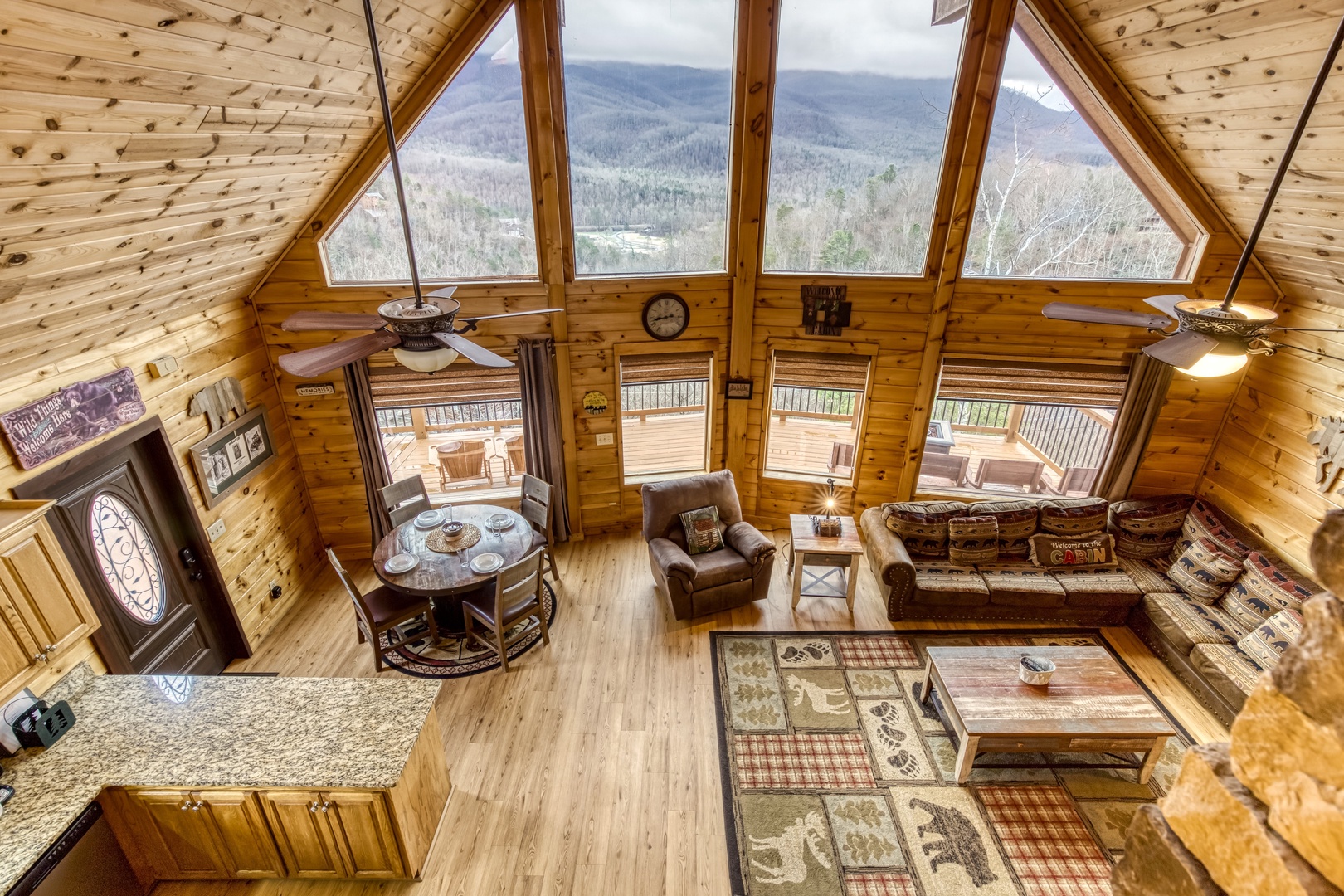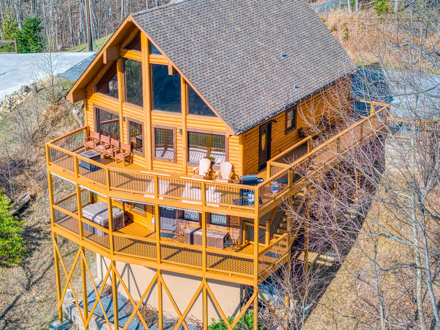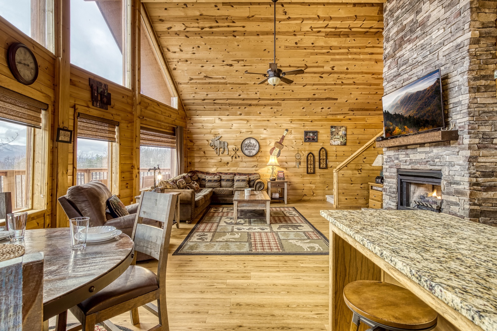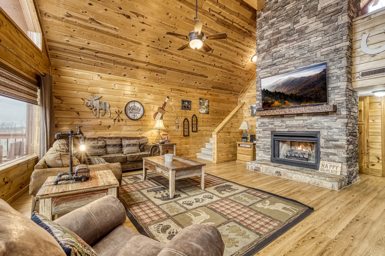 Main Level: Step onto the wraparound porch and into a cozy living area featuring a stone gas fireplace, open kitchen with all essentials, and a dining area. This level has a king bedroom and a queen bedroom, both with flat-screen TVs, sharing a hall bathroom. The back deck offers a gas grill, gas fireplace, and stunning mountain views.