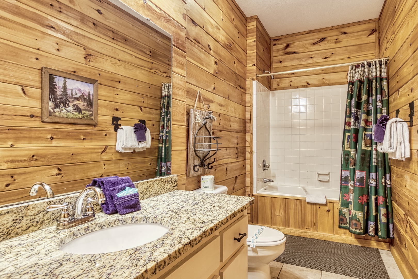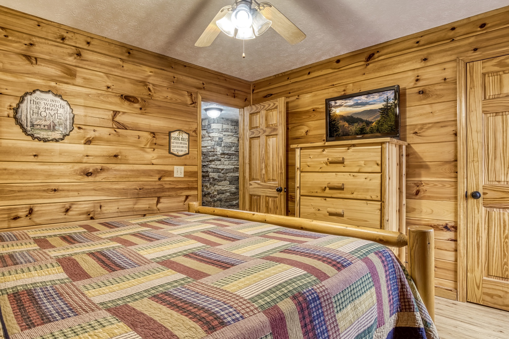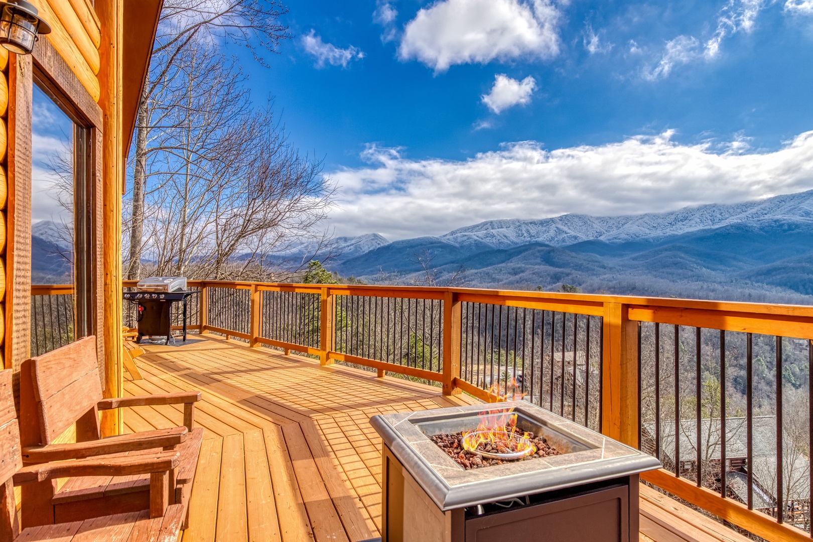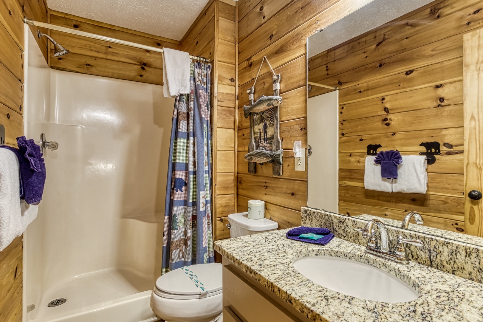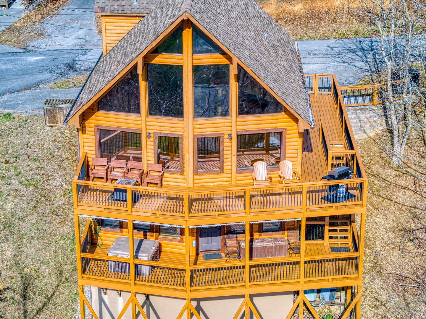 Main Level: Step onto the wraparound porch and into a cozy living area featuring a stone gas fireplace, open kitchen with all essentials, and a dining area. This level has a king bedroom and a queen bedroom, both with flat-screen TVs, sharing a hall bathroom. The back deck offers a gas grill, gas fireplace, and stunning mountain views.