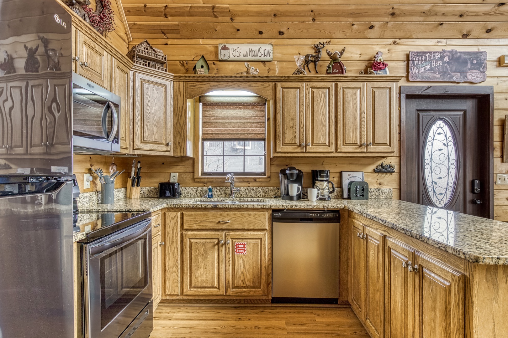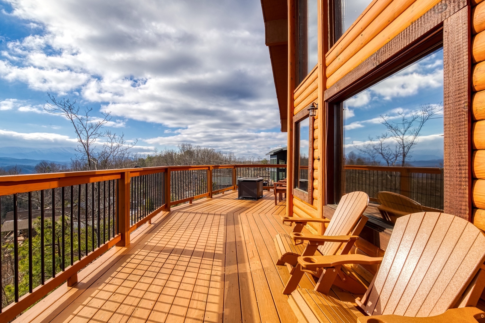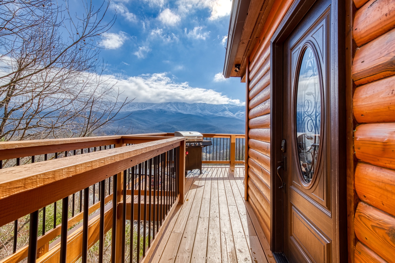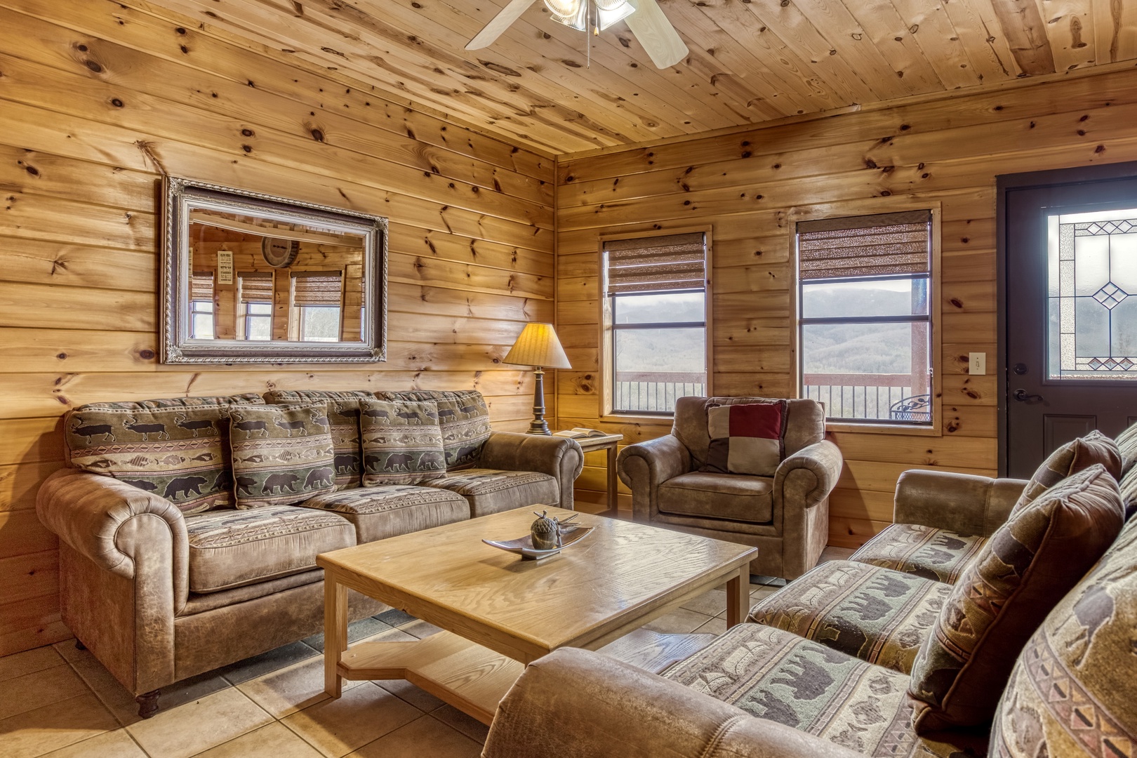 Main Level: Step onto the wraparound porch and into a cozy living area featuring a stone gas fireplace, open kitchen with all essentials, and a dining area. This level has a king bedroom and a queen bedroom, both with flat-screen TVs, sharing a hall bathroom. The back deck offers a gas grill, gas fireplace, and stunning mountain views.