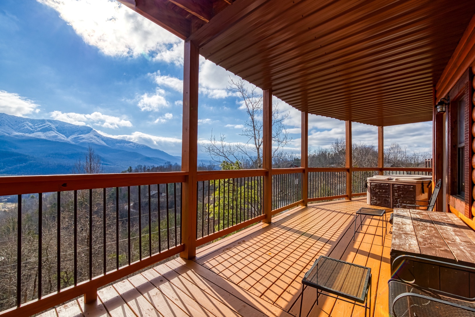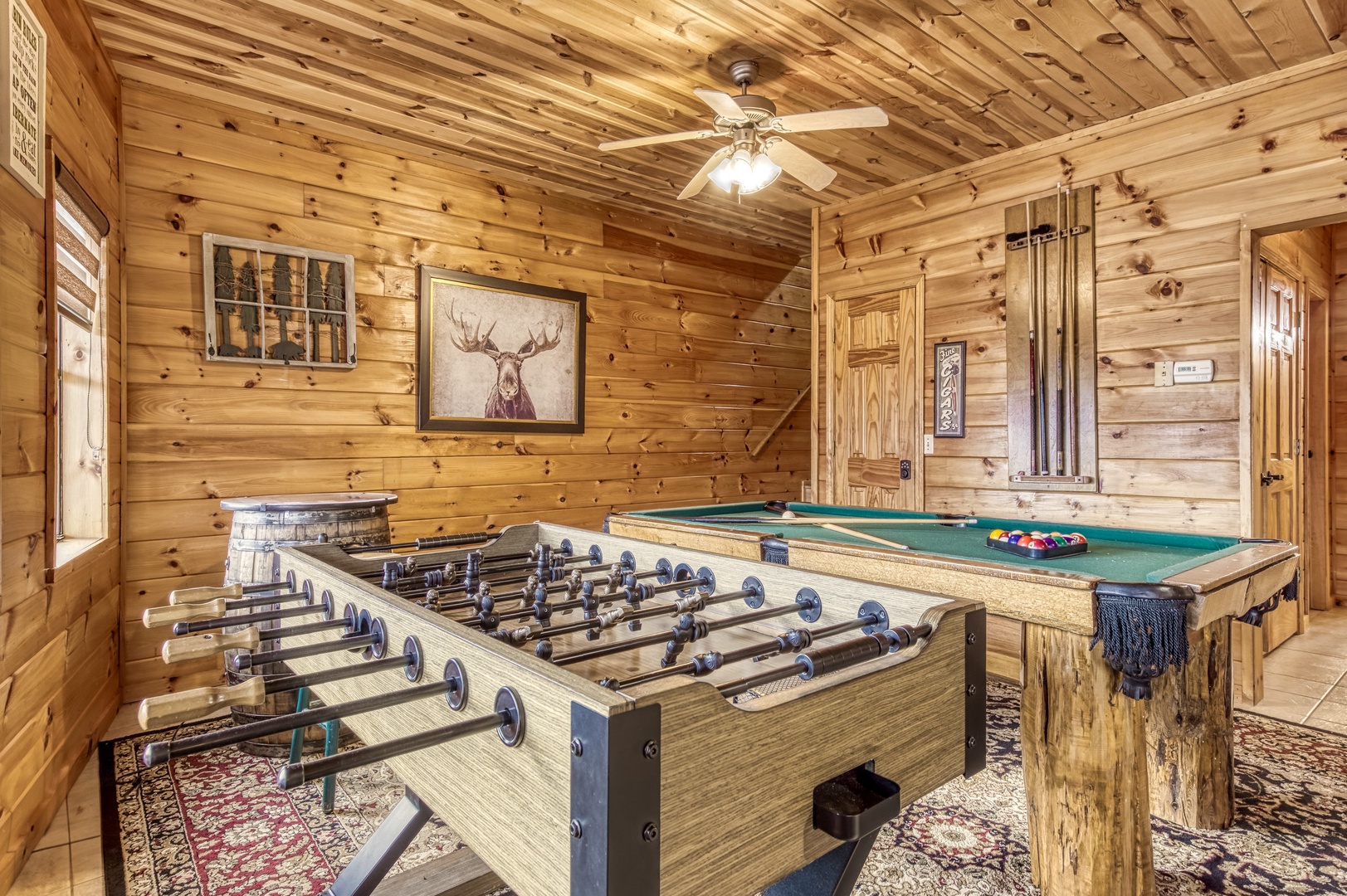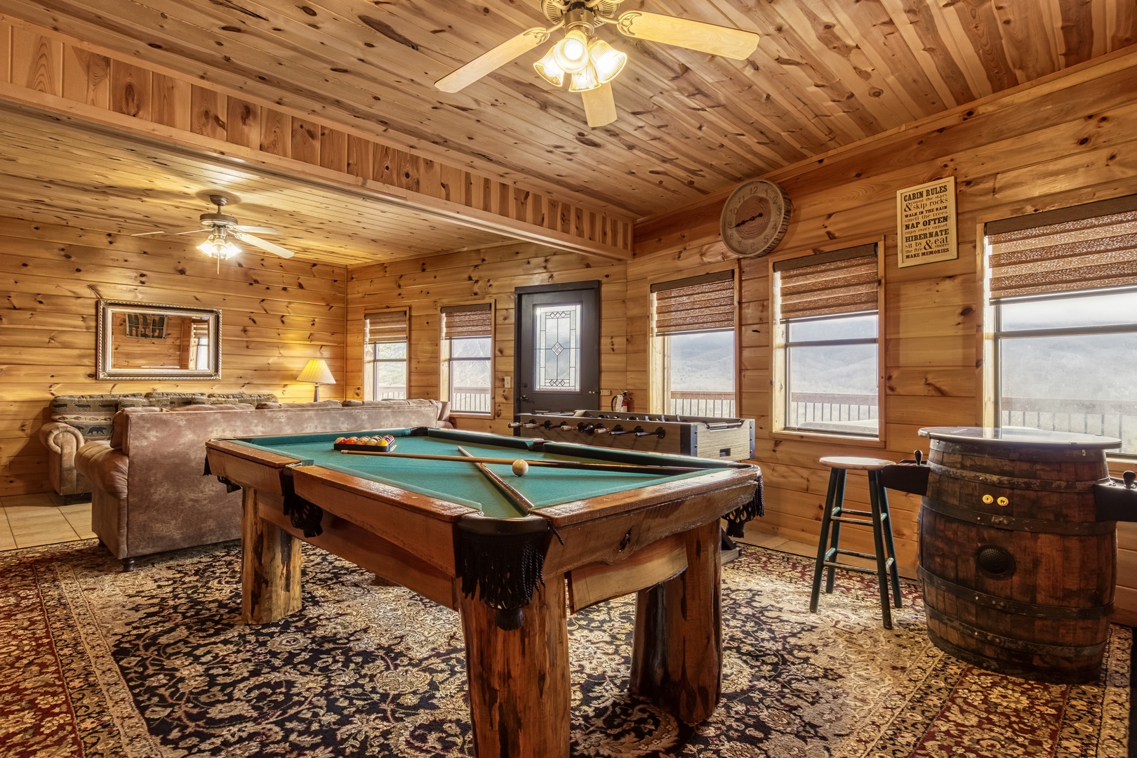 Lower Level: Enjoy a second living area and game room with a pool table, foosball, and barrel arcade. This level also features a queen bedroom with an ensuite bathroom, an additional full bathroom, and a laundry area. Relax on the back deck in the hot tub after exploring the Smoky Mountains.
