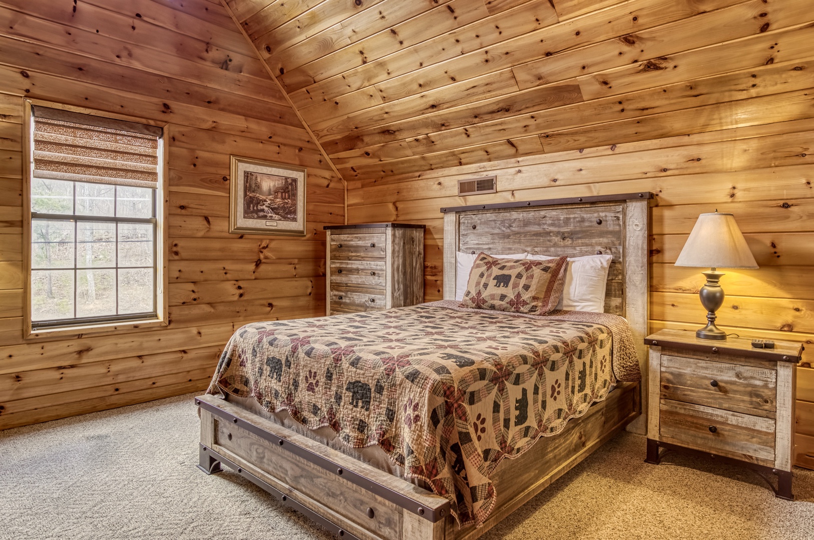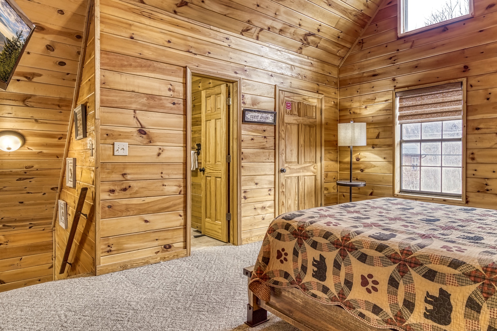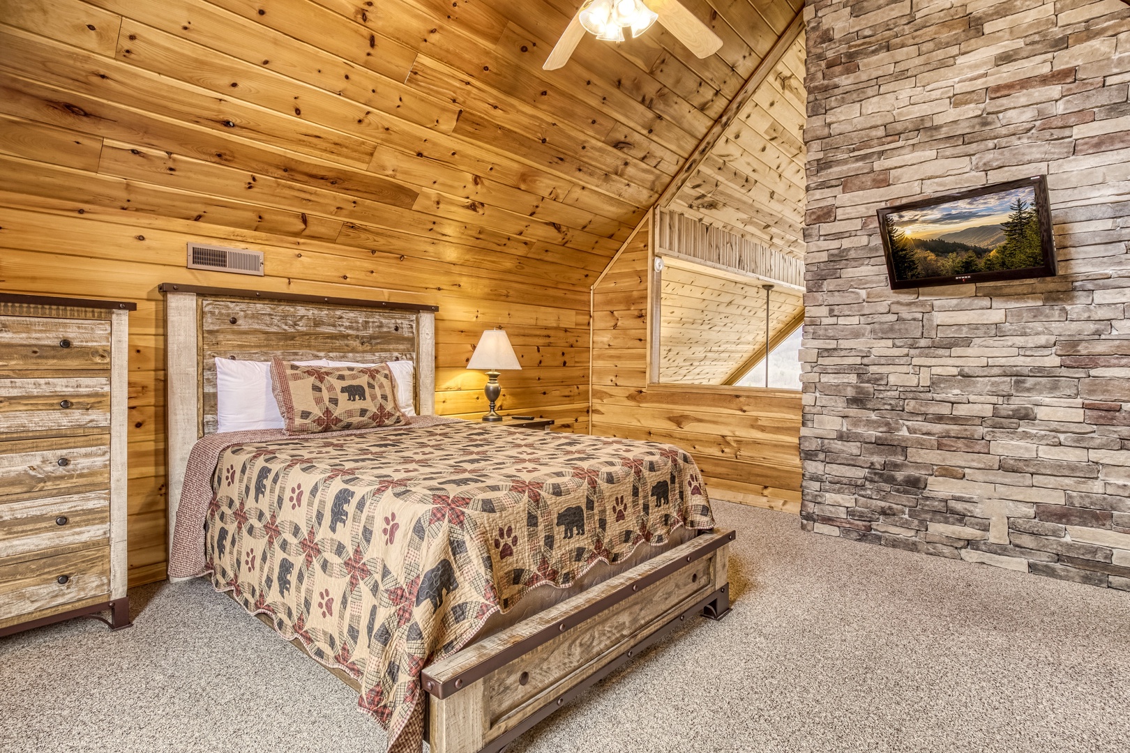 Upper Level: The loft is a private queen suite with a flat-screen TV and ensuite bathroom, offering a peaceful retreat.