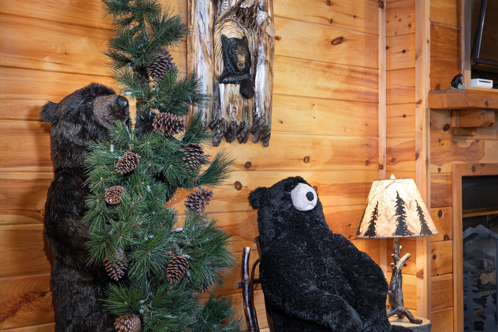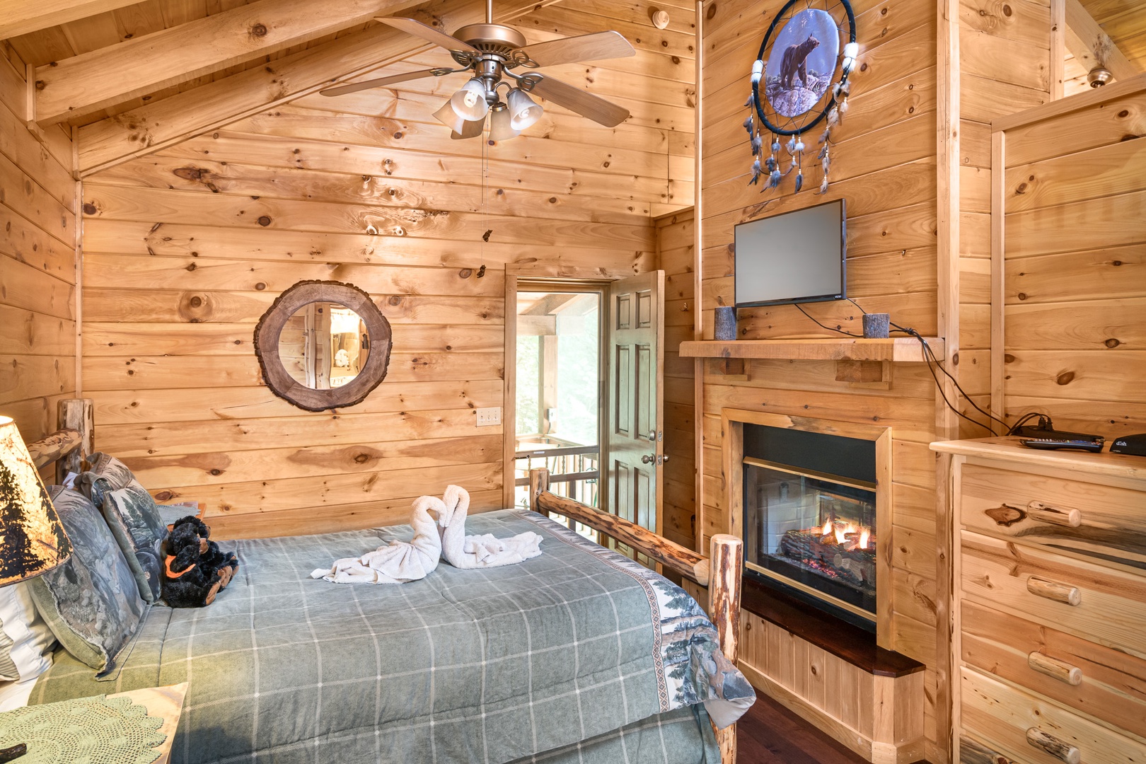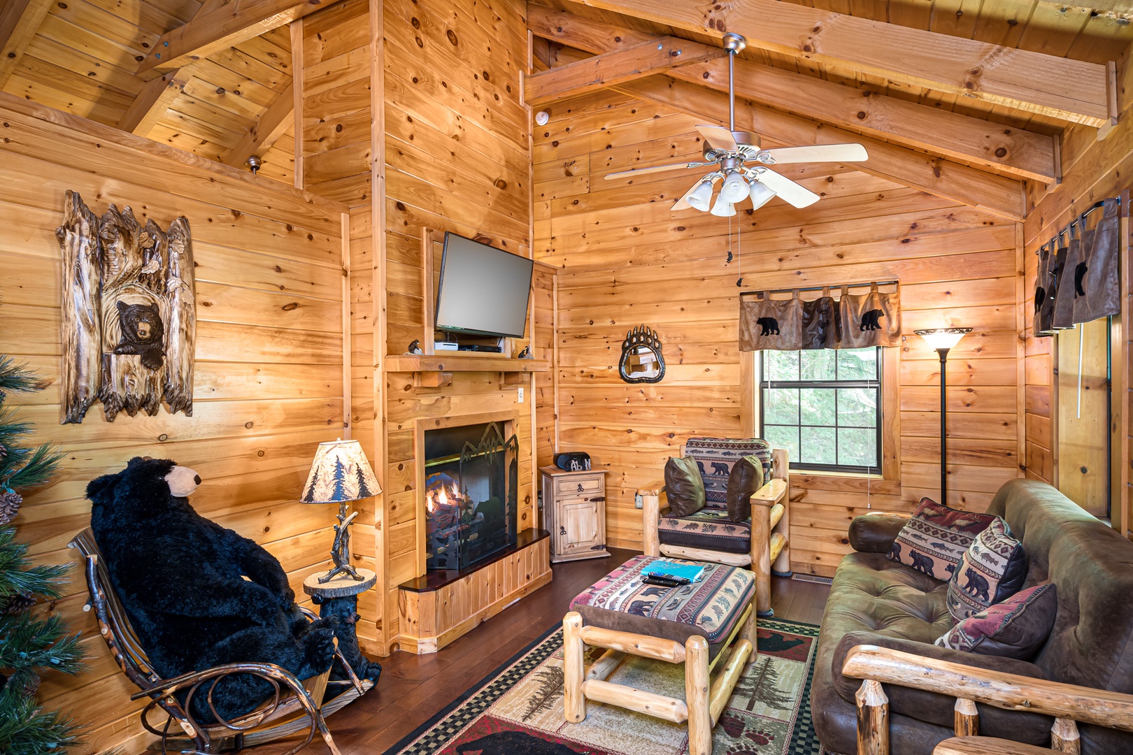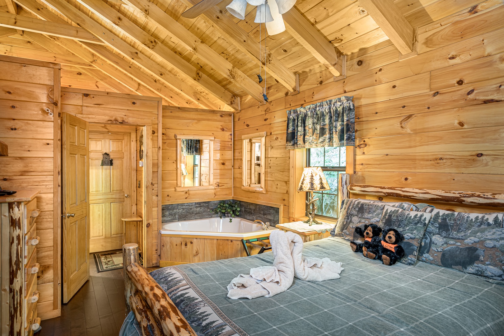 Welcome to "Mosey Bear" in the Smoky Mountains! This beautiful and enchanting 1-bedroom 1-bathroom cabin for 2 will tug at your heartstrings. The stunning attention to detail, adorable bear themed decor and custom log furniture creates a warm and inviting atmosphere that will bring a smile to your face. The cabin also features an amazingly beautiful Master suite where you are treated to an in-room jetted tub, fireplace, log bed, Flat screen TV with Disney+, Hulu, and ESPN+ and access to the screened in porch with a romantic hot tub and lighting. Whatever your spoil, whether inside relaxing by the double-sided gas fireplace or outside basking in the quiet of nature on the front porch swing, you will surely be treated to a delightful and heartwarming experience at "Mosey Bear." The cabin offers a peaceful and semi-private setting and yet is close to all Pigeon Forge tourist attractions, restaurants, shopping, and Douglas Lake if you would like to enjoy a day at the lake during our summer months. If you are wanting the perfect Smoky Mountain cabin getaway in a great location with easy year-round access, level parking, complimentary WiFi, and motorcycle accessible, then you will love the comforts and features of "Mosey Bear." If you are traveling with another couple and are looking for the ideal lodging arrangement that affords you the unique opportunity to spend time together yet offers each of you your very own private cabin, then "Mosey Bear" is the place to be! The sister cabin is "Cozy Bear" and can also be viewed on Bear Camp Cabin Rentals website for more information. While both cabins are near each other, they are situated in such a way as to allow you to have your own privacy from the other while still being near enough to enjoy the company of your travel friends. "Cozy Bear" and "Mosey Bear" are located by themselves in a quiet, private country setting on their own land and not in a resort or subdivision.