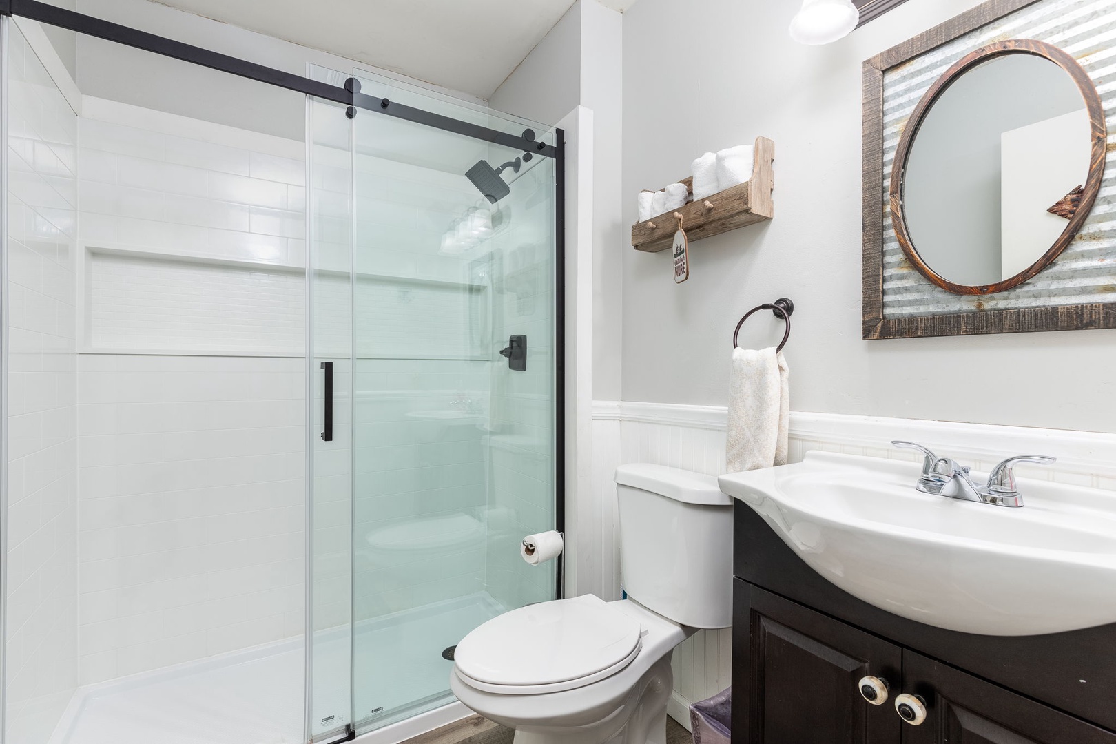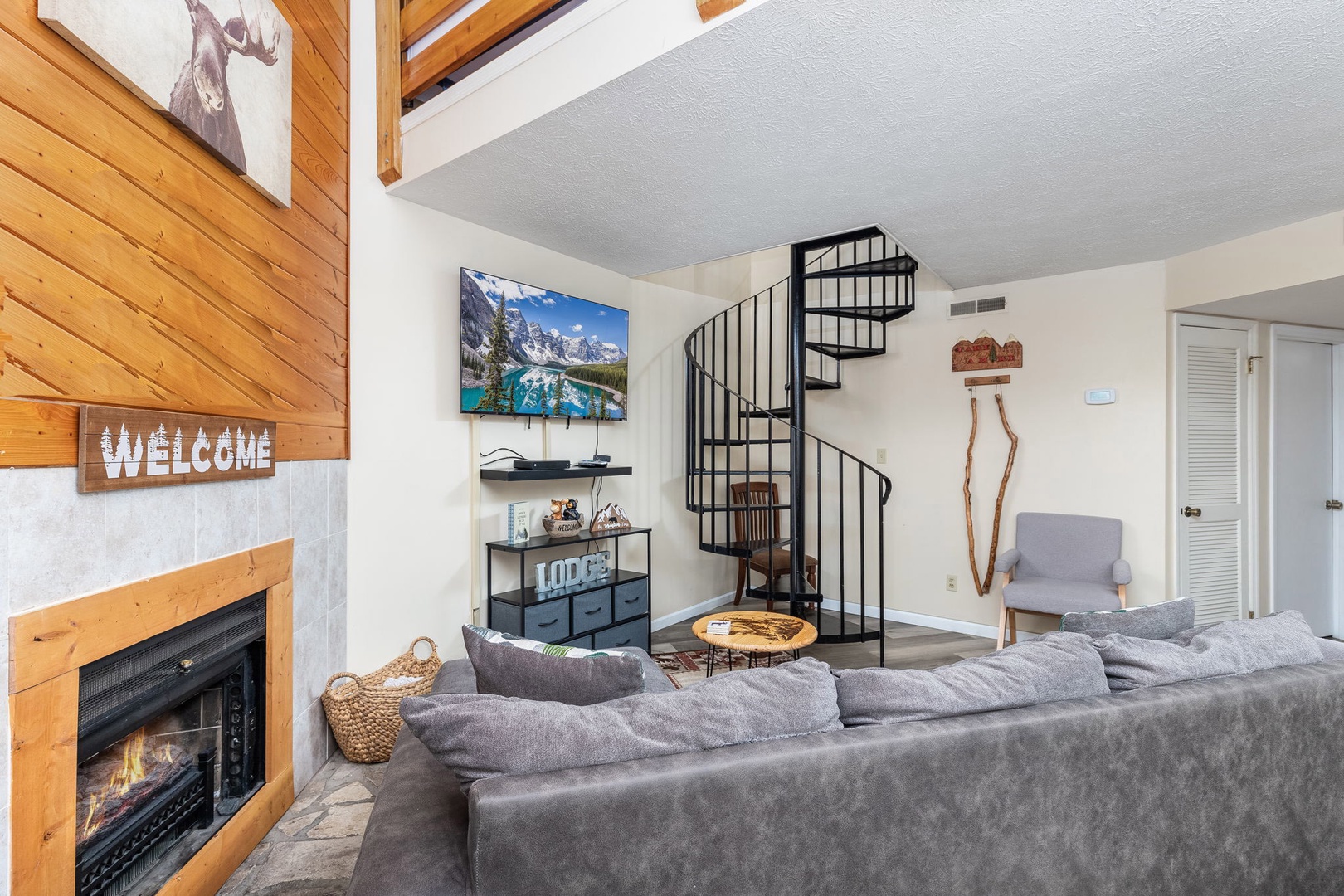 The main floor offers an open dining, living, and kitchen area, creating a welcoming space for gatherings. The fully equipped kitchen makes meal prep a breeze, and the cozy fireplace in the living room is perfect for relaxing evenings. Access the balcony from the living room for stunning views. The main floor features one King bedroom with a private bath and another King bedroom with a shared bath. The loft bedroom includes a twin bed, twin-over-full bunk bed, and an attached full bath. Each area has its own full bathroom, providing convenience and privacy for all guests.