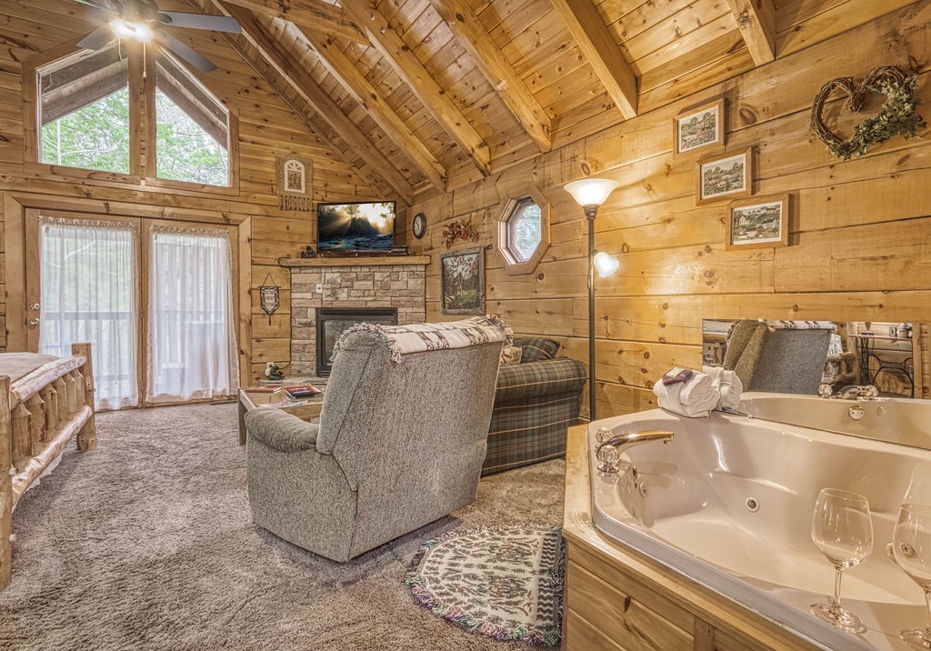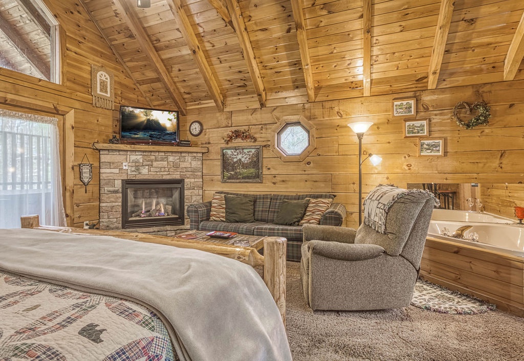 Coming when it is cold and not wanting to be outside is not a problem here either. Just turn on your favorite show and relax on the sofa or jump in the in room Jacuzzi and stay warm.