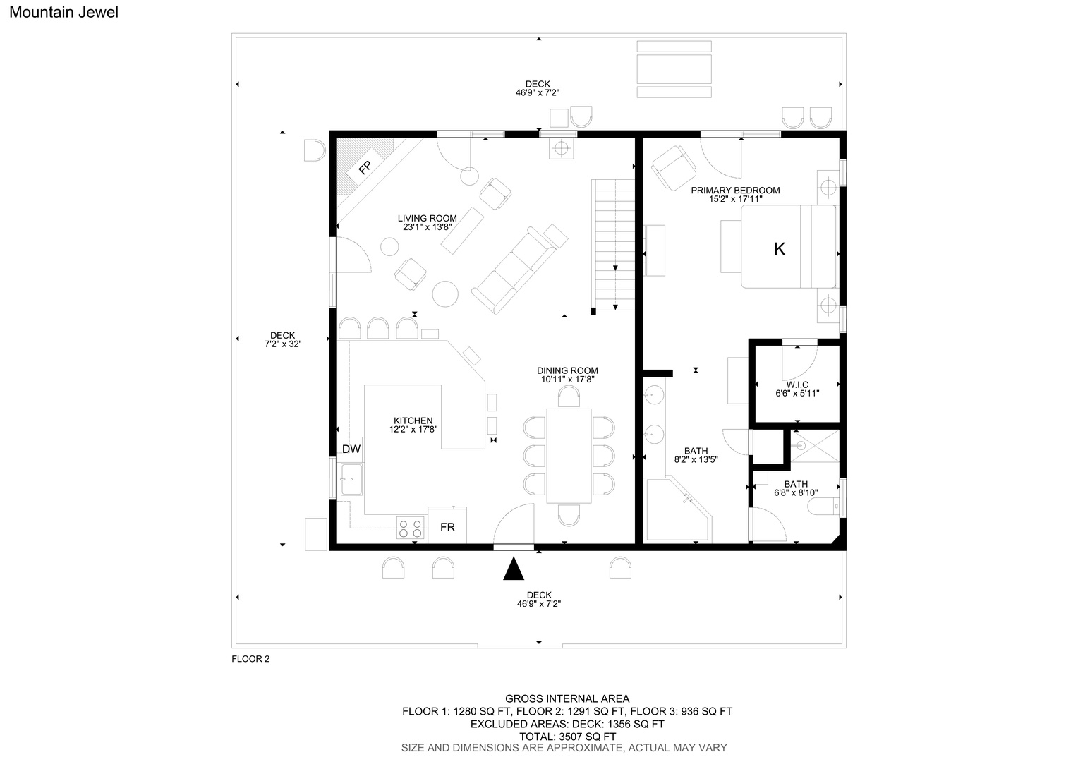 With just one step to the deck of your new home away from home. Stepping into the front door to the extra spacious layout of this home. Between the large kitchen layout with a wrapping bar area with extra seating and set up for all your cooking needs, the perfectly placed dining room opening to the lovely living room facing the Stone gas fireplace with a huge tv hung above it for you to enjoy from anywhere in this open space. The couch is also a Queen size sleeper sofa. Just through the dining room You will find the main floor master King bedroom ensuite, featuring a gorgeous 4 post bed, large flat screen tv with a jacuzzi tub.