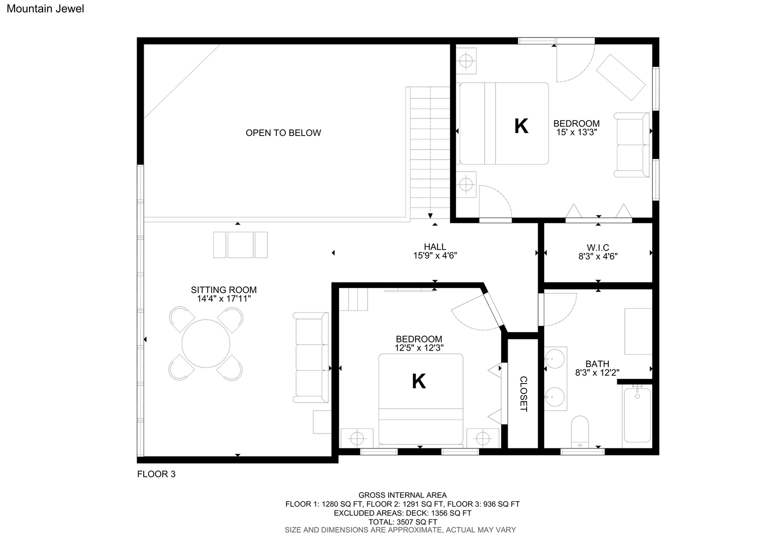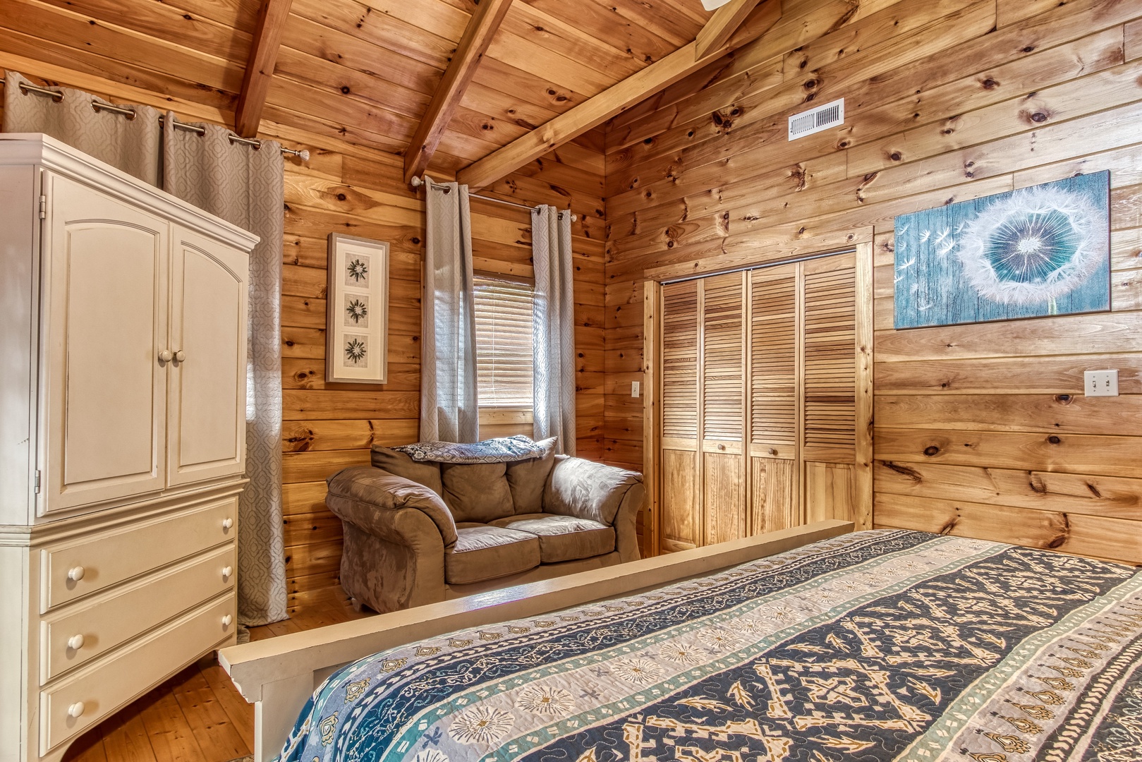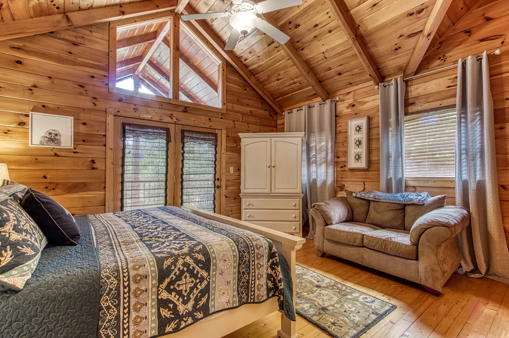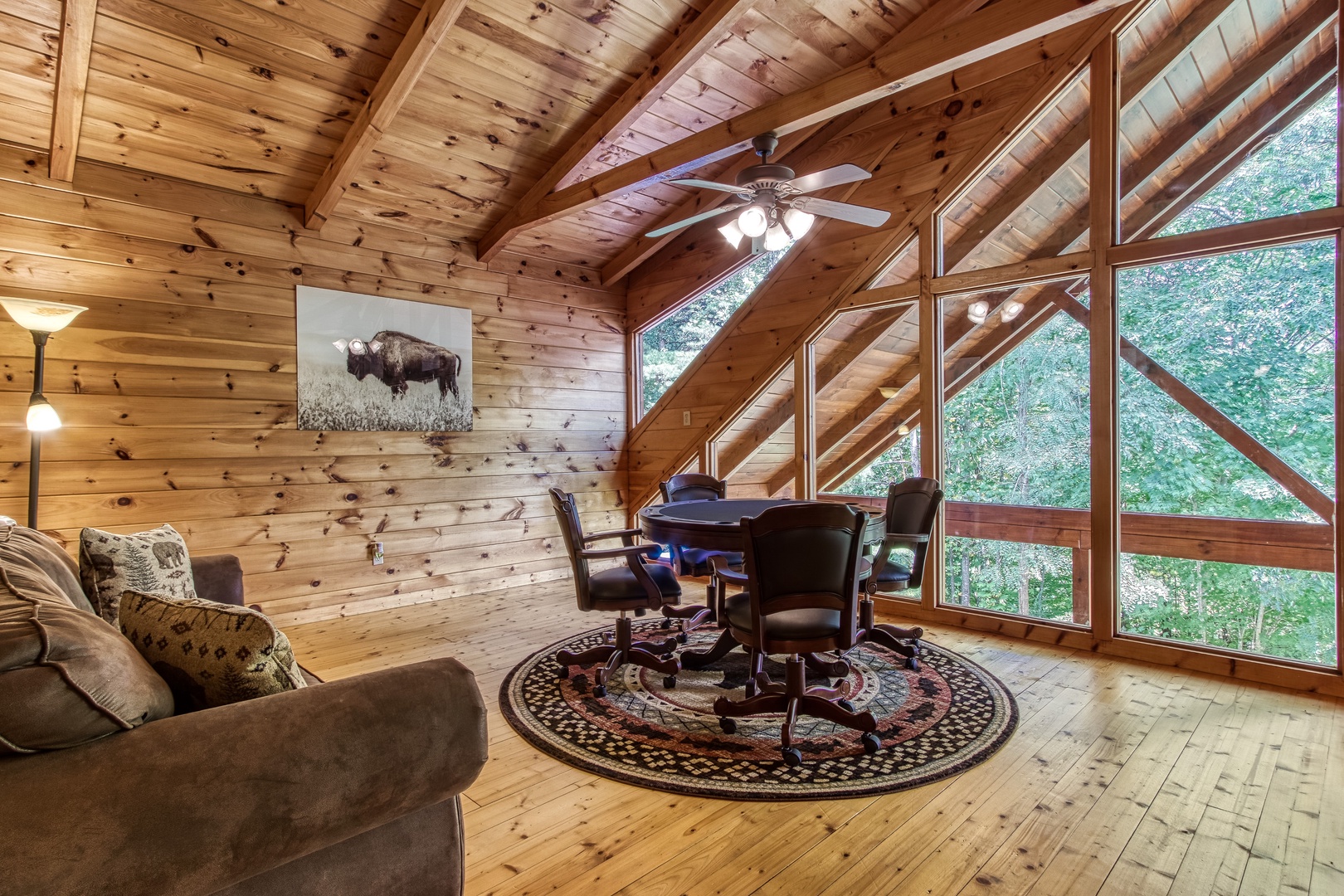 Headed up the Steps to the top floor will be 2 more King bedrooms and a shared bathroom. One of the king bedrooms has its own deck. Within this level you will also have an open area perfect for those poker players along with a couch with a Queen sleeper sofa facing wall to wall windows overlooking the backyard.