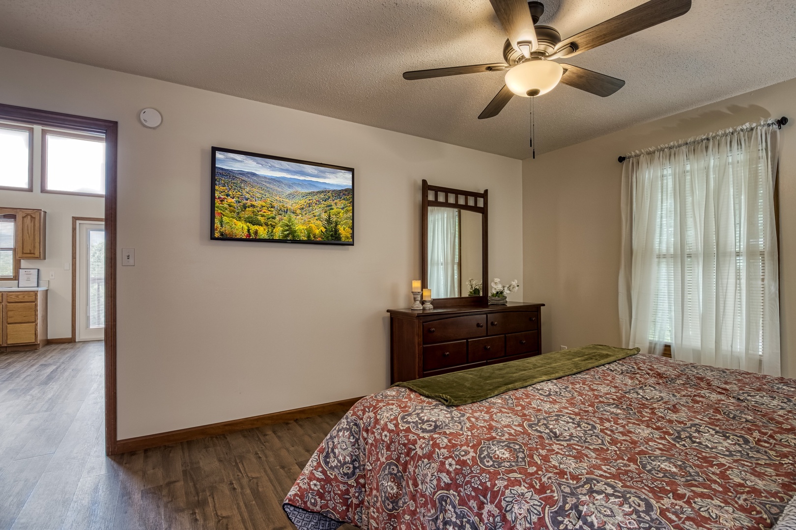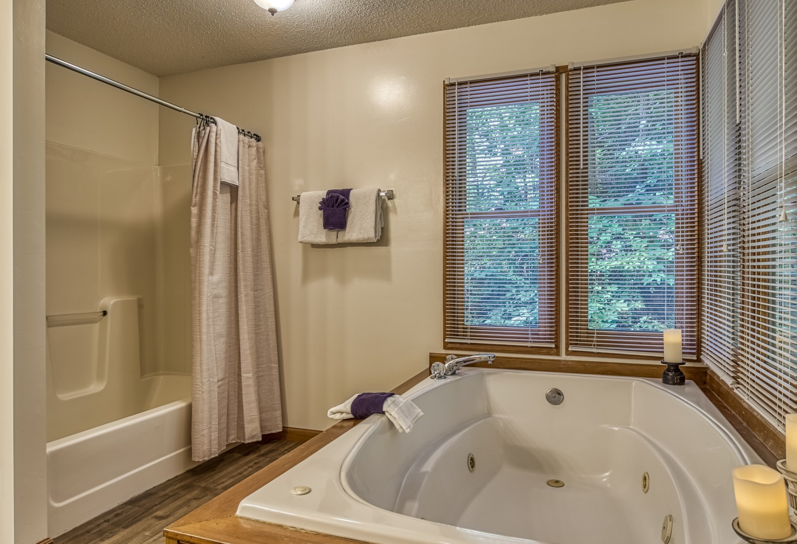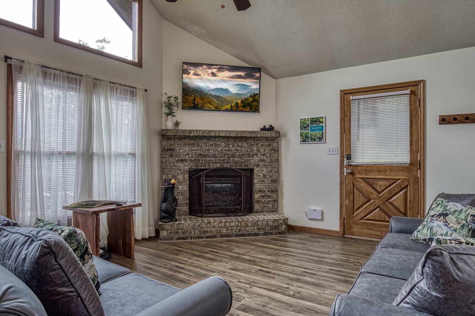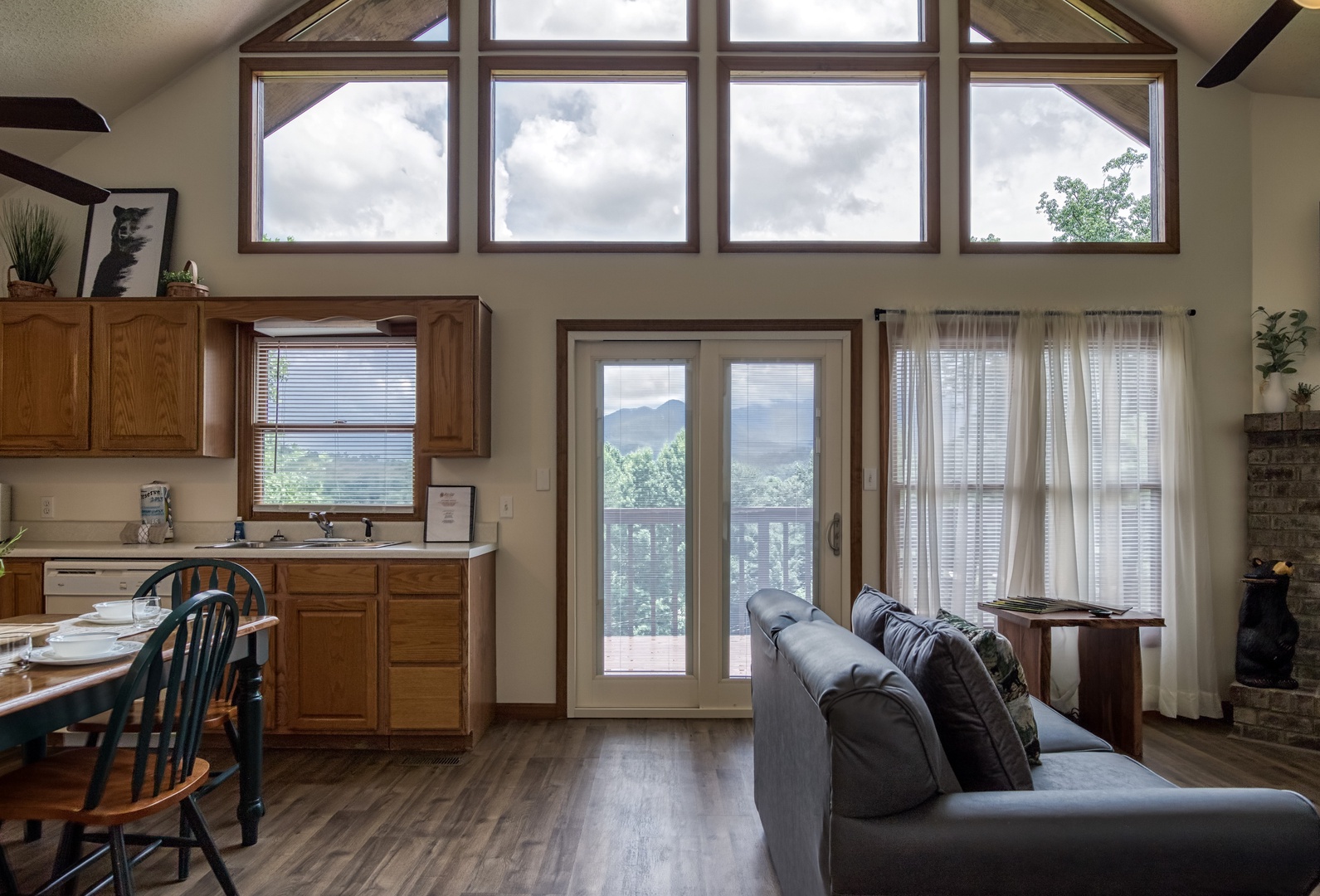 Mountain Laurel Lookout" is a beautiful chalet with AMAZING views of the Smoky Mountains year-round and located in the stunning Gatlinburg area. The chalet offers paved roads all the way to the cabin with parking for 2 cars comfortably. This adorable chalet is a 2-bedroom 1-bathroom that will sleep 6 and is 2 stories. You will be amazed when you step inside with all the amenities you could ask for in your home away from home. Entering into the Living room to be ready to be taken back by all the floor to ceiling windows overlooking the breathtaking mountain views. The living room will give you natural lighting to enjoy while being astonished by the mountains feeling right in your lap, just kick back on the comfy couch or loveseat after a long day of sight-seeing and take in all the mountains have to offer. On those cool winter nights curled up in front of the electric fireplace while watching your favorite show on the flat-screen TV. Just off the living room is a lovely porch for those mornings or evenings where you just want to sit and take in nature around. Take a dip in the ready to go Hot Tub to soak all your aching muscles. Adjacent to the living room is the fully equipped kitchen and dining for 4 guests. There is also the washer and dryer tucked away nicely in a closet on this level. Just through the living room is the main floor master King suite with an ensuite bathroom featuring a jacuzzi tub and a walk in shower. What would be better than waking up every morning looking out at the mountains? In the upstairs loft, which is open to below, you will find the 2nd bedroom. In this bedroom, you will have a Queen-size bed with mountain views that will make anyone smile. "Mountain Laurel Lookout" encourages relaxation and family time both inside and outside. Enjoy your morning coffee while sitting on the front deck taking in the views. If you enjoy cooking out, there is a Charcoal grill for your use, just bring your favorite food to grill and then you're ready to go. If you are wanting to experience the feeling of being on top of a mountain with mountain views as far as you can see, the "Mountain Laurel Lookout" is the perfect chalet for your next family vacation. What are you waiting for? Book "Mountain Laurel Lookout" today before it is too late!!!!
