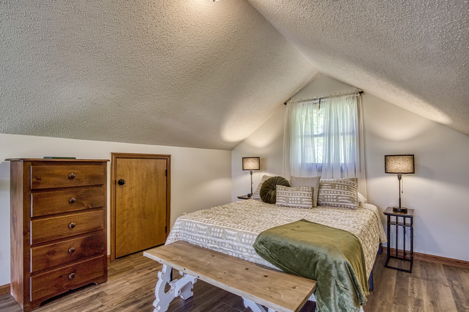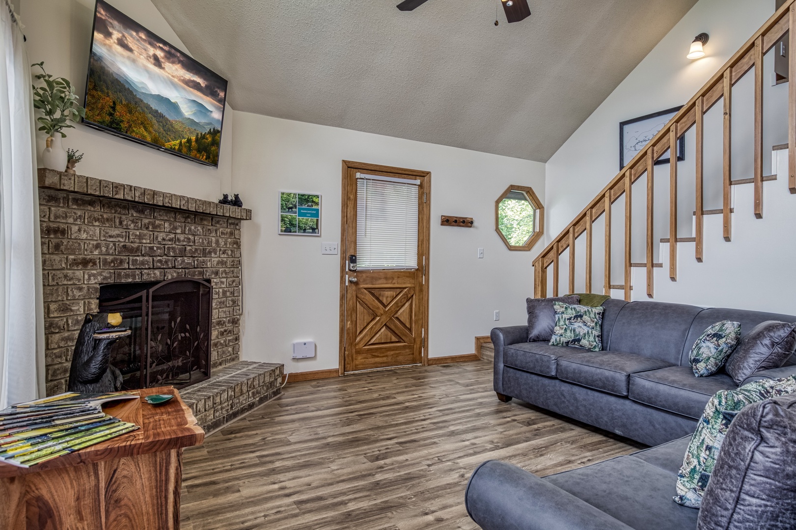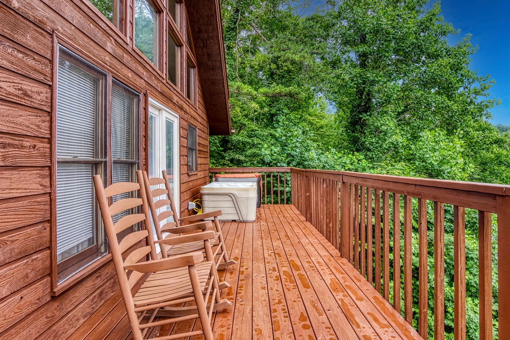 Mountain Laurel Lookout" is a beautiful chalet with AMAZING views of the Smoky Mountains year-round and located in the stunning Gatlinburg area. The chalet offers paved roads all the way to the cabin with parking for 2 cars comfortably. This adorable chalet is a 2-bedroom 1-bathroom that will sleep 6 and is 2 stories. You will be amazed when you step inside with all the amenities you could ask for in your home away from home. Entering into the Living room to be ready to be taken back by all the floor to ceiling windows overlooking the breathtaking mountain views. The living room will give you natural lighting to enjoy while being astonished by the mountains feeling right in your lap, just kick back on the comfy couch or loveseat after a long day of sight-seeing and take in all the mountains have to offer. On those cool winter nights curled up in front of the electric fireplace while watching your favorite show on the flat-screen TV. Just off the living room is a lovely porch for those mornings or evenings where you just want to sit and take in nature around. Take a dip in the ready to go Hot Tub to soak all your aching muscles. Adjacent to the living room is the fully equipped kitchen and dining for 4 guests. There is also the washer and dryer tucked away nicely in a closet on this level. Just through the living room is the main floor master King suite with an ensuite bathroom featuring a jacuzzi tub and a walk in shower. What would be better than waking up every morning looking out at the mountains? In the upstairs loft, which is open to below, you will find the 2nd bedroom. In this bedroom, you will have a Queen-size bed with mountain views that will make anyone smile. "Mountain Laurel Lookout" encourages relaxation and family time both inside and outside. Enjoy your morning coffee while sitting on the front deck taking in the views. If you enjoy cooking out, there is a Charcoal grill for your use, just bring your favorite food to grill and then you're ready to go. If you are wanting to experience the feeling of being on top of a mountain with mountain views as far as you can see, the "Mountain Laurel Lookout" is the perfect chalet for your next family vacation. What are you waiting for? Book "Mountain Laurel Lookout" today before it is too late!!!!