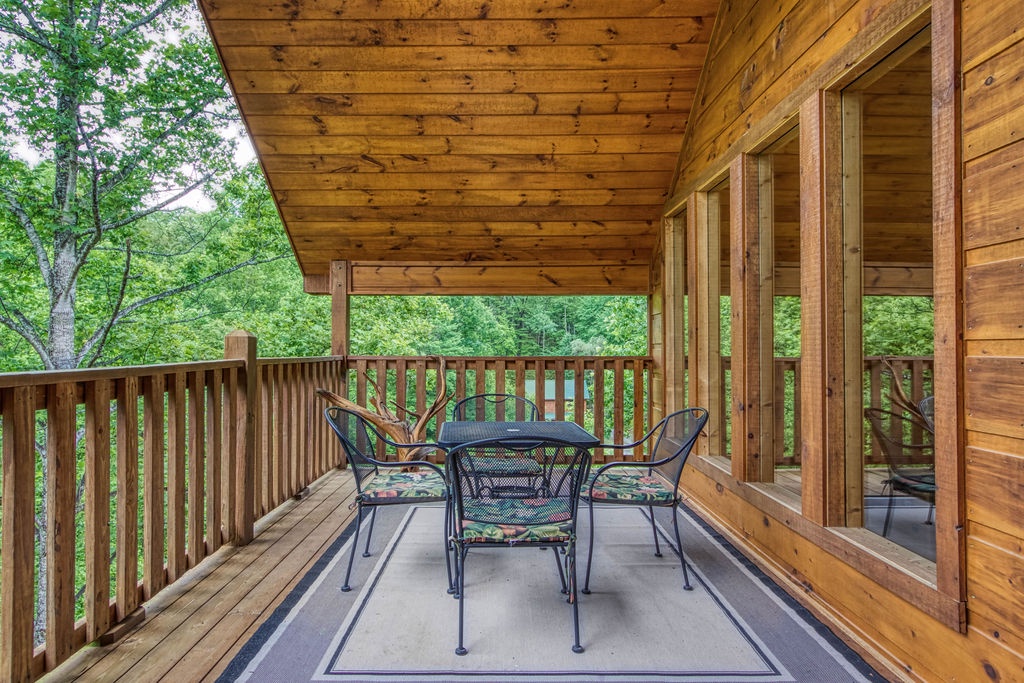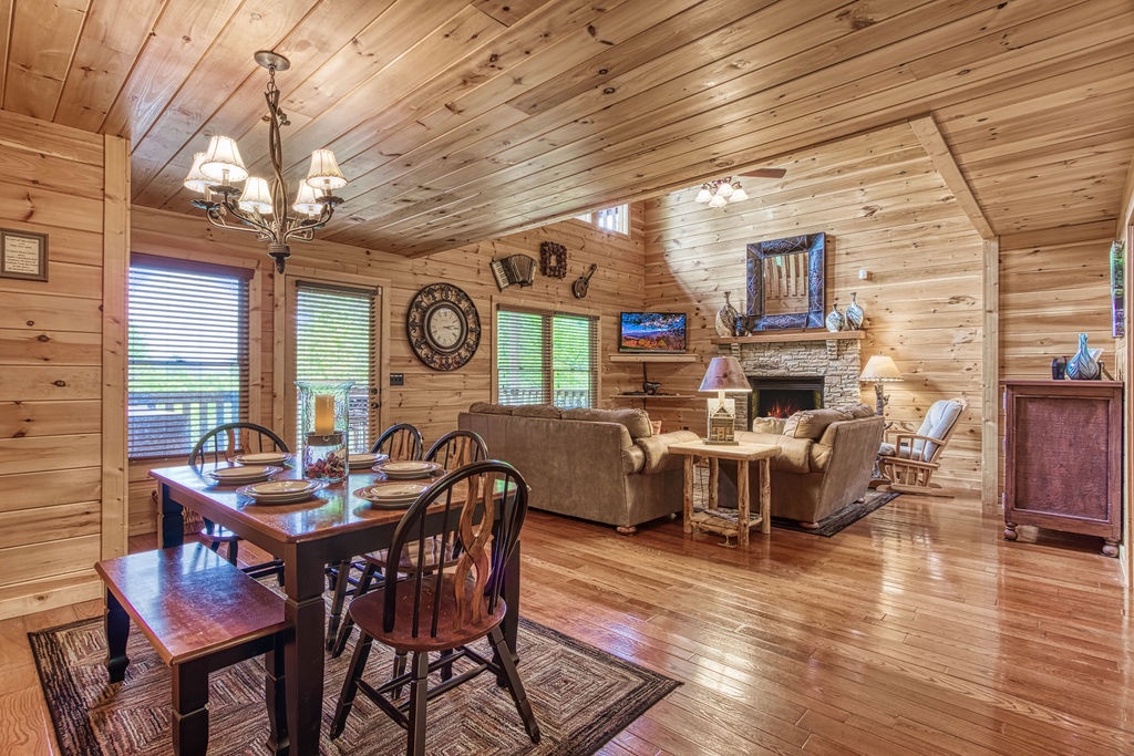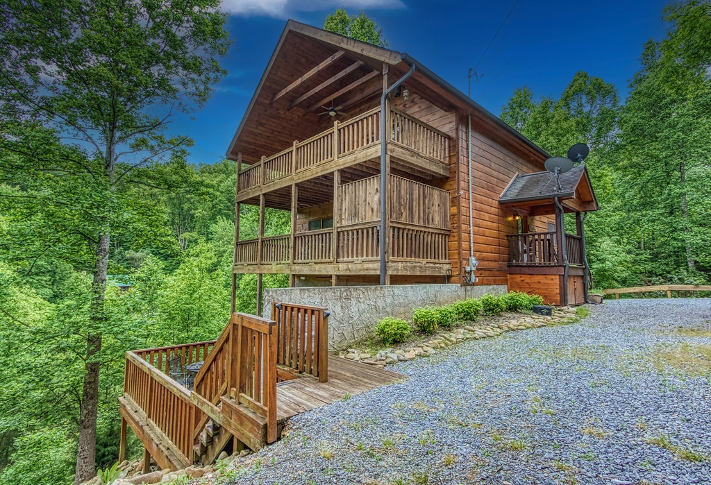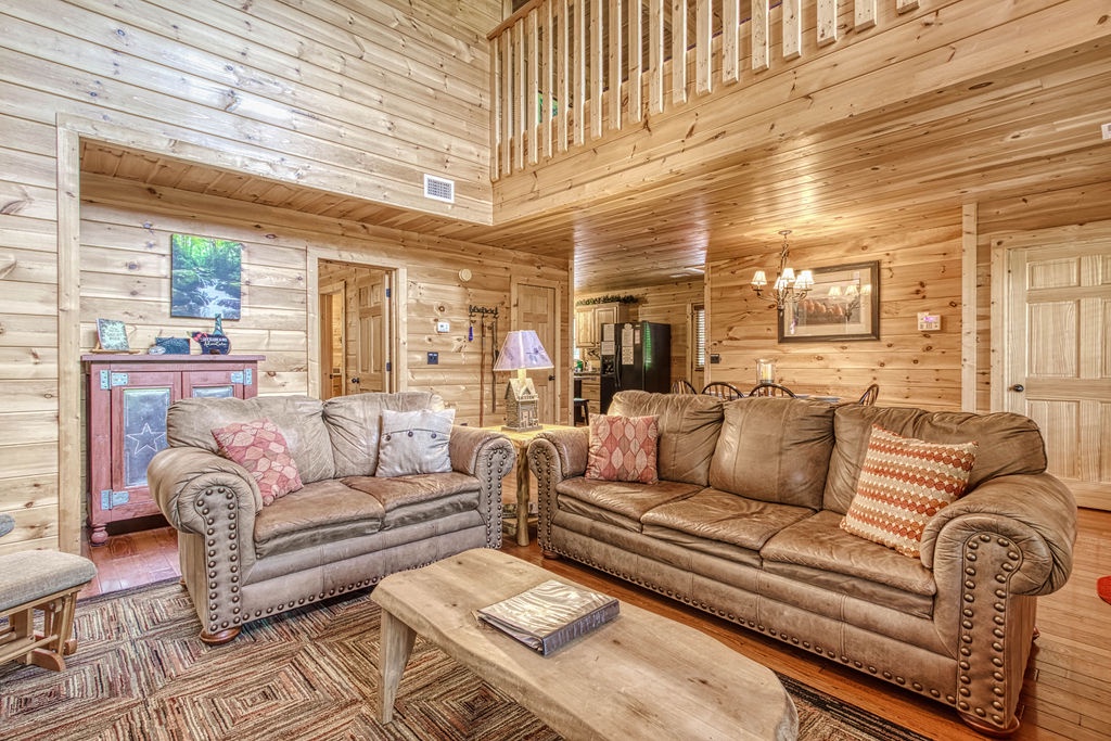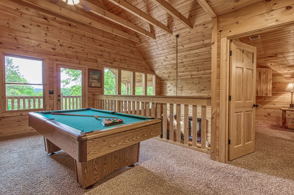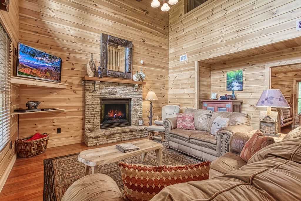 "Mountain Music" is a private, gorgeous custom built log cabin tucked into the woods and is conveniently close to all the area attractions. Perfect for a family gathering or a getaway with family and friends, this cabin has all of the amenities you could ask for in your very own home away from home. Located approximately 10 minutes from Pigeon Forge and 15 minutes from Gatlinburg. This cabin is paved up until you reach the gravel driveway, and although there are some curvy mountain roads, this cabin would be considered motorcycle friendly at the riders' discretion. There is comfortable parking available for up to 3 vehicles. This 3 Bedroom, 3 Bath unit that sleeps 10 is 3 levels. The first two levels offer King beds and downstairs has a twin over twin bunk with each having a TV. Each level has its own deck with patio furniture and views of the woods and mountains. On the main level, you will find a fully equipped kitchen with lots of counter space and dining for 6. A Living area that has high vaulted ceilings has a stone gas fireplace, Queen sofa sleeper, loveseat, as well as a TV. There is also a King bedroom with a private bath that has a double vanity and a walk-in shower. In the upper level, you will find the loft area with a Pool table and an additional King bedroom with its own Jacuzzi tub, TV, and a private bathroom with a shower and bathtub combo. On the lower level, you will find the theater room with a large sectional couch that is perfect for enjoying movie nights with friends and family. There is also an arcade game, air hockey, and a bunk bedroom with Twin over Twin and a 43" Smart TV. There is also a Bathroom with a shower/tub combo. This beautifully decorated private cabin is perfect for anyone looking to relax and unwind, yet convenient and close enough to get out and explore everything the area attractions have to offer. If you are looking for the perfect getaway with all the extras, "Mountain Music" is the perfect cabin for you. Don't miss out --- Call us today to book this beautiful 3 Bedroom retreat.