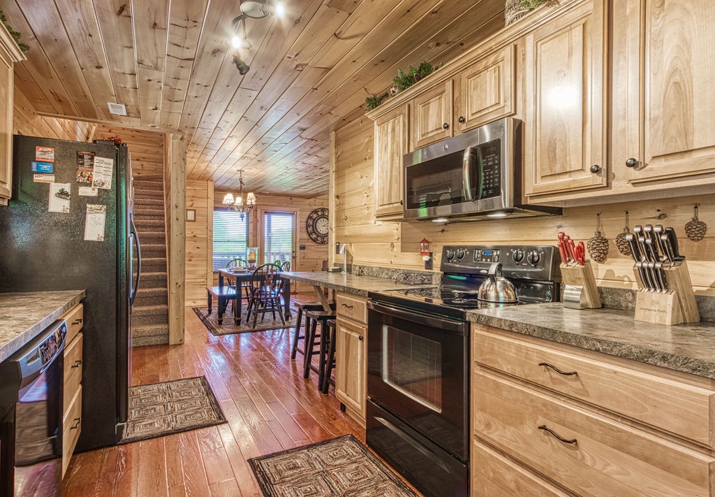 Mountain music was beautiful. The kitchen was well stocked, had everything we needed to cook our meals. Layout was great plenty of room for everyone and very comfortable. Truly a home away from home.