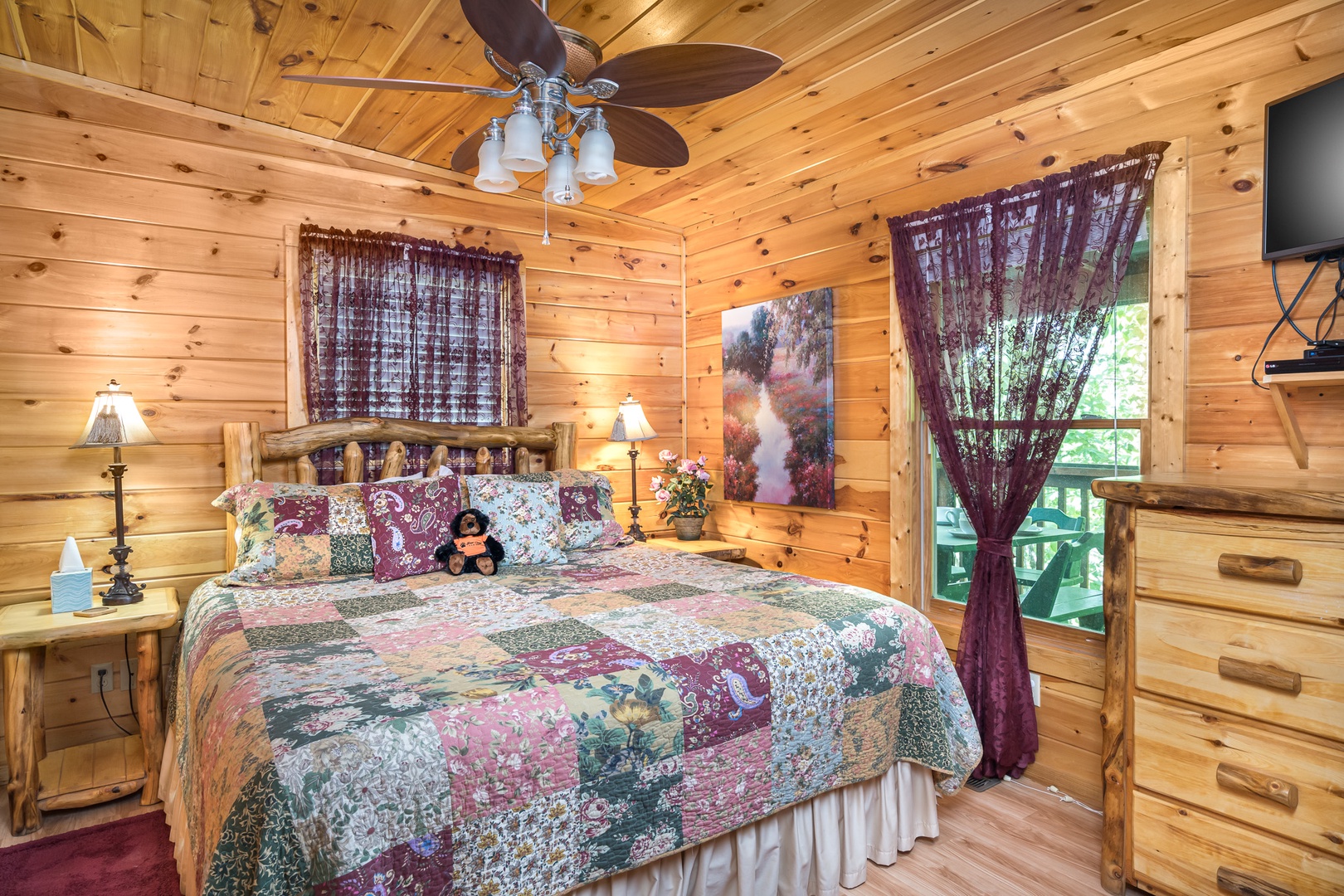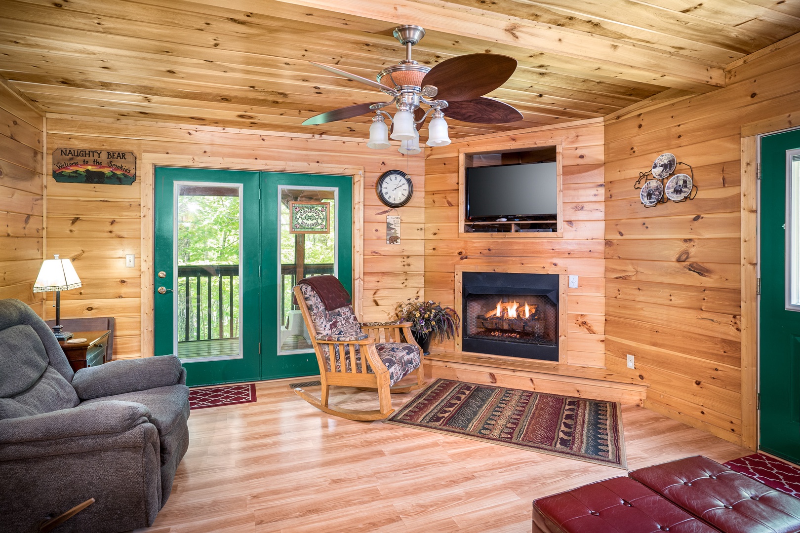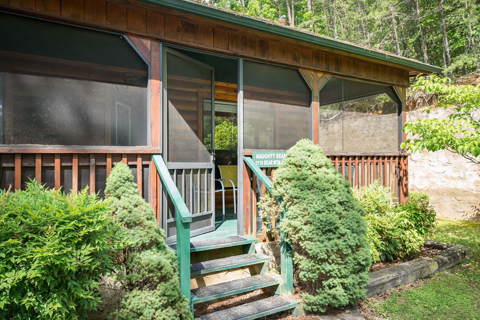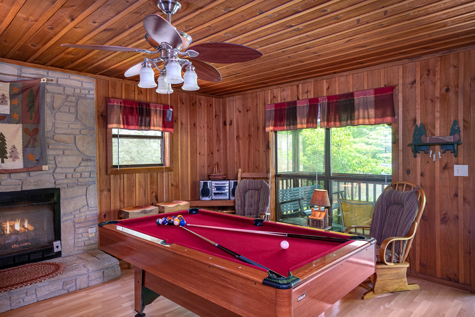"Naughty Bear" is a secluded, upscale cabin located in the Great Smoky Mountains. This all wood cabin has all the amenities you could ask for in your very own home away from home. Offering peaceful wooded views and country decor. With only 4 steps up to the cabin, this cabin is all one level. Located on Bear Mountain, approximately a 20-minute drive from Pigeon Forge, Splash Country & Dollywood, and 25-30 minutes to Gatlinburg. This cabin has curvy mountain roads and some steep inclines that can be narrow at times. There are also paved and gravel roads, so this cabin is not recommended for motorcycles or trailers in any weather. Available parking for up to 3 vehicles. This 3 bedroom, 2 bath cabin that sleeps 8 is all one level. There is a fully equipped kitchen, a living area with a queen sofa sleeper, recliners, a gas fireplace, and a flat screen TV. There are 3 separate bedrooms - a king bedroom with a flat screen TV and a private bath with a shower/tub combo and 2 queen bedrooms each with a flat screen TV and a shared bath with a shower/tub combo. There is a game room with a pool table and stereo, along with seating to enjoy the friendly games. The front porch is screened in and offers a porch swing and rockers. The back deck is also screened in, offering rocking chairs and the hot tub, as well as beautiful wooded views. There is also a picnic table and charcoal grill located around back that is perfect for enjoying a peaceful lunch or dinner while being surrounded by all that nature has to offer. If a private, peaceful, 3 bedroom cabin that is all on one level and has gorgeous wooded views is what you are looking for, look no further, "Naughty Bear" is the perfect vacation destination for you and your family or friends. Don't miss out --- Call us today to book this charming all wood cabin.