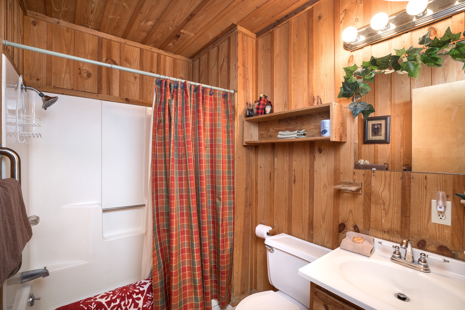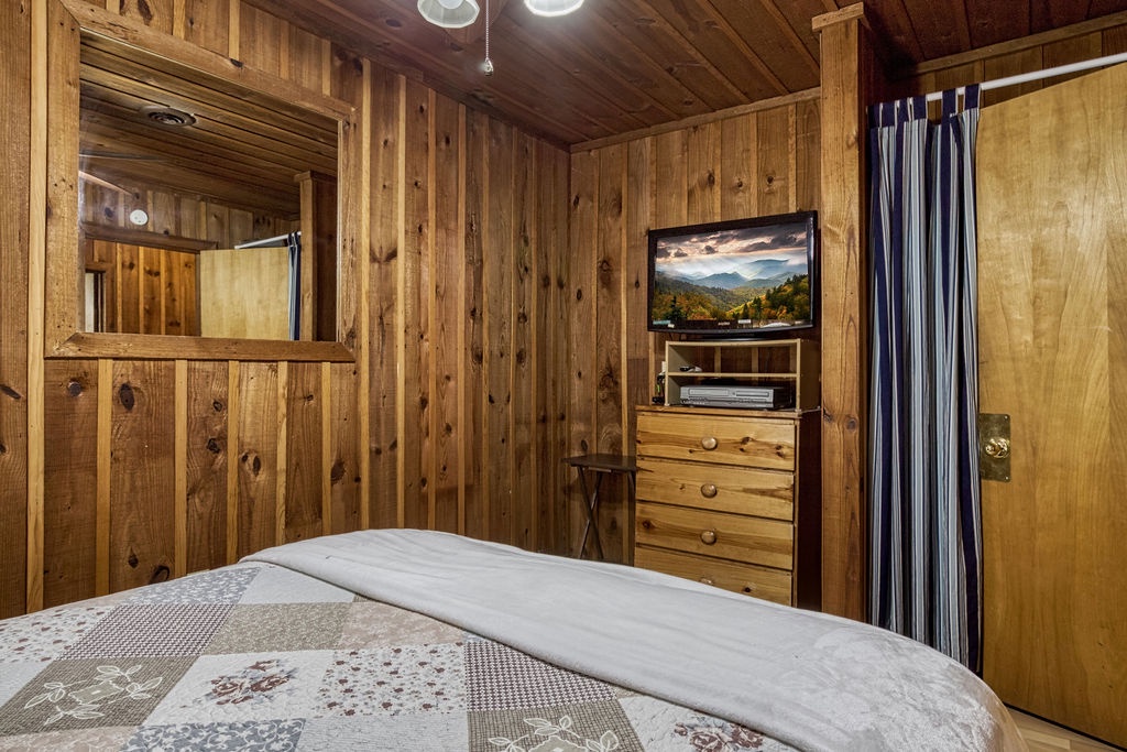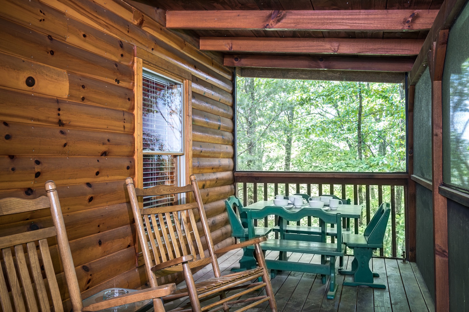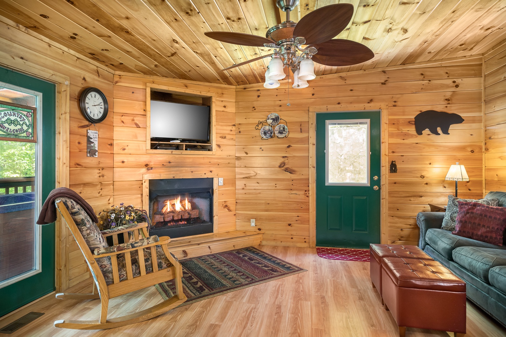 "Naughty Bear" is a secluded, upscale cabin located in the Great Smoky Mountains. This all wood cabin has all the amenities you could ask for in your very own home away from home. Offering peaceful wooded views and country decor. With only 4 steps up to the cabin, this cabin is all one level. Located on Bear Mountain, approximately a 20-minute drive from Pigeon Forge, Splash Country & Dollywood, and 25-30 minutes to Gatlinburg. This cabin has curvy mountain roads and some steep inclines that can be narrow at times. There are also paved and gravel roads, so this cabin is not recommended for motorcycles or trailers in any weather. Available parking for up to 3 vehicles. This 3 bedroom, 2 bath cabin that sleeps 8 is all one level. There is a fully equipped kitchen, a living area with a queen sofa sleeper, recliners, a gas fireplace, and a flat screen TV. There are 3 separate bedrooms - a king bedroom with a flat screen TV and a private bath with a shower/tub combo and 2 queen bedrooms each with a flat screen TV and a shared bath with a shower/tub combo. There is a game room with a pool table and stereo, along with seating to enjoy the friendly games. The front porch is screened in and offers a porch swing and rockers. The back deck is also screened in, offering rocking chairs and the hot tub, as well as beautiful wooded views. There is also a picnic table and charcoal grill located around back that is perfect for enjoying a peaceful lunch or dinner while being surrounded by all that nature has to offer. If a private, peaceful, 3 bedroom cabin that is all on one level and has gorgeous wooded views is what you are looking for, look no further, "Naughty Bear" is the perfect vacation destination for you and your family or friends. Don't miss out --- Call us today to book this charming all wood cabin.