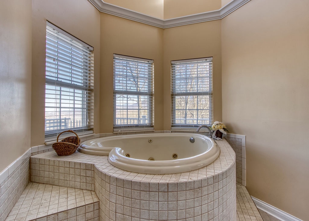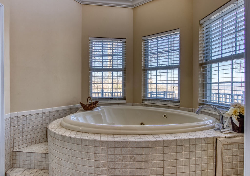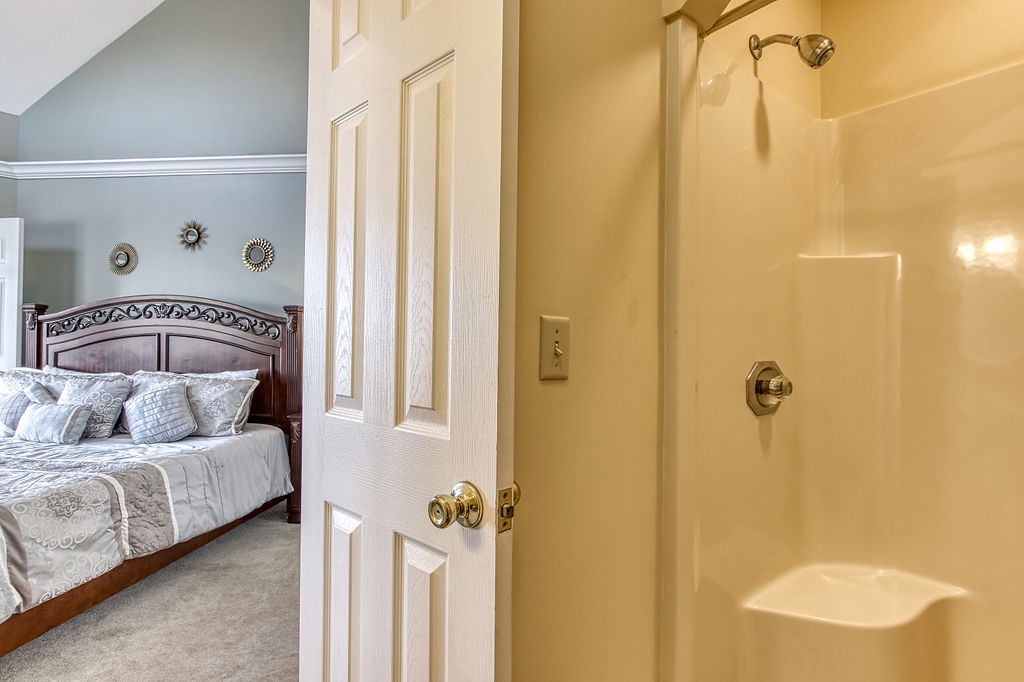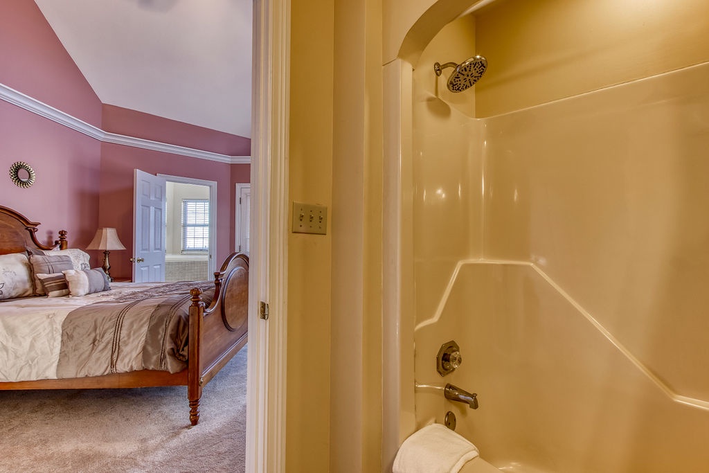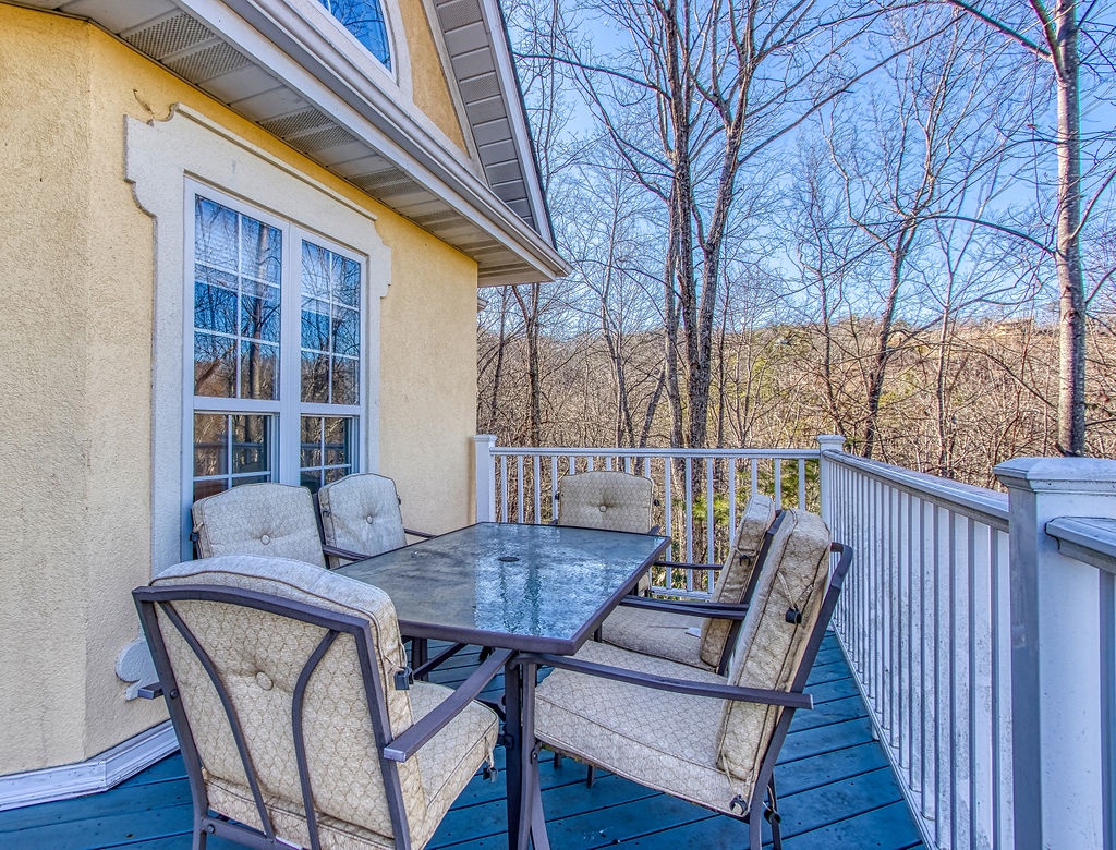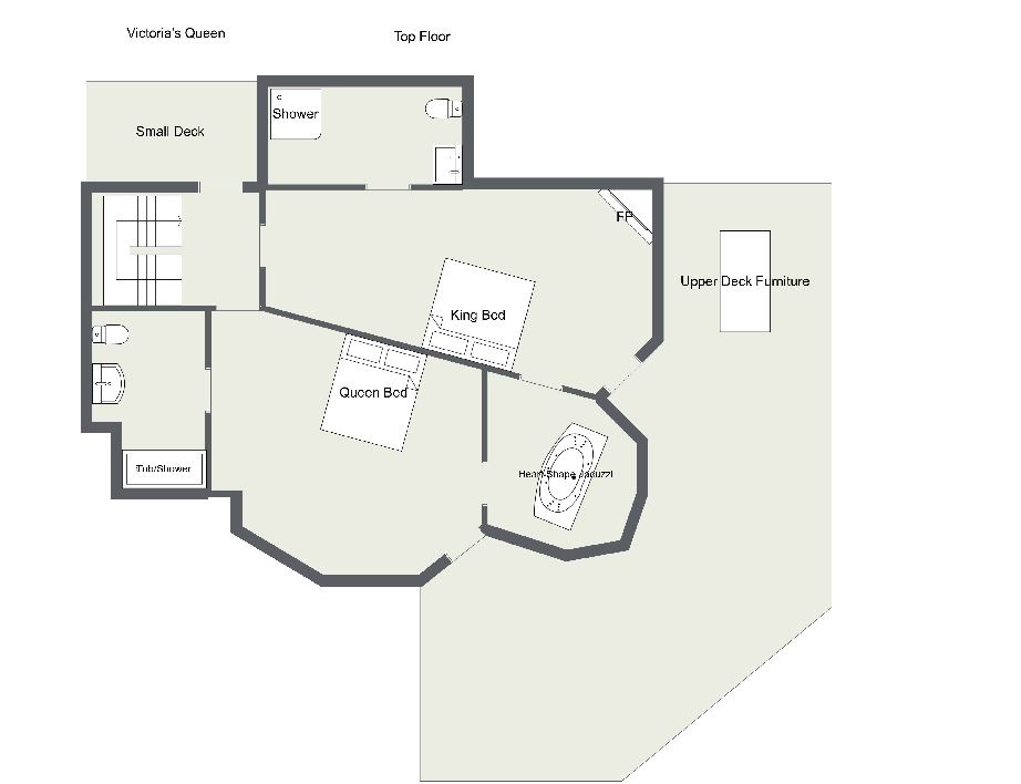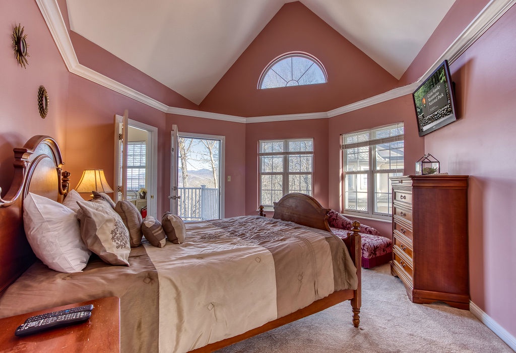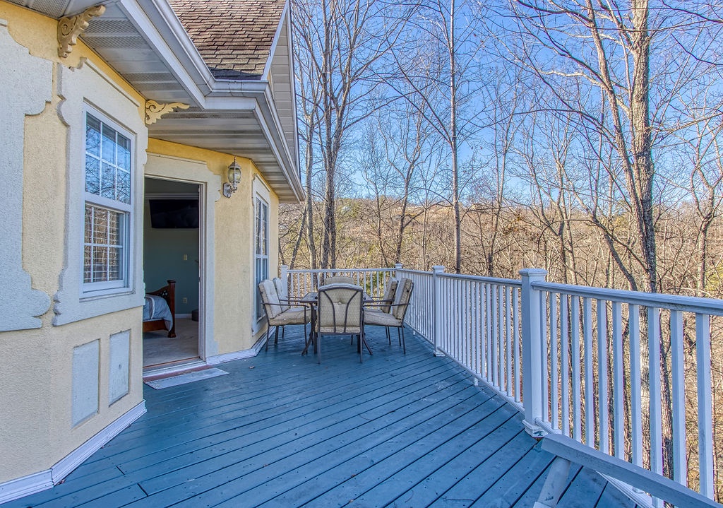 At the end of the day, you can look forward to getting a good night's sleep in one of the two bedrooms upstairs. In one bedroom you'll find a King-size bed, closet, TV, and a private bath while the other offers a King-size bed. In between the two bedrooms is a luxurious heart shape Jacuzzi tub perfect to relax the muscles used for hiking or shopping before bed. There is a second deck, which each bedroom offers private entry to, on the upper level. This is the spot for star gazing at night or getting some sunshine and fresh air when you wake up.