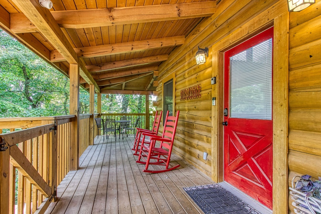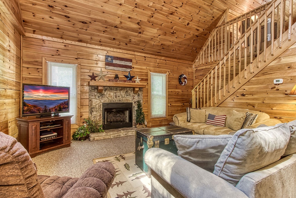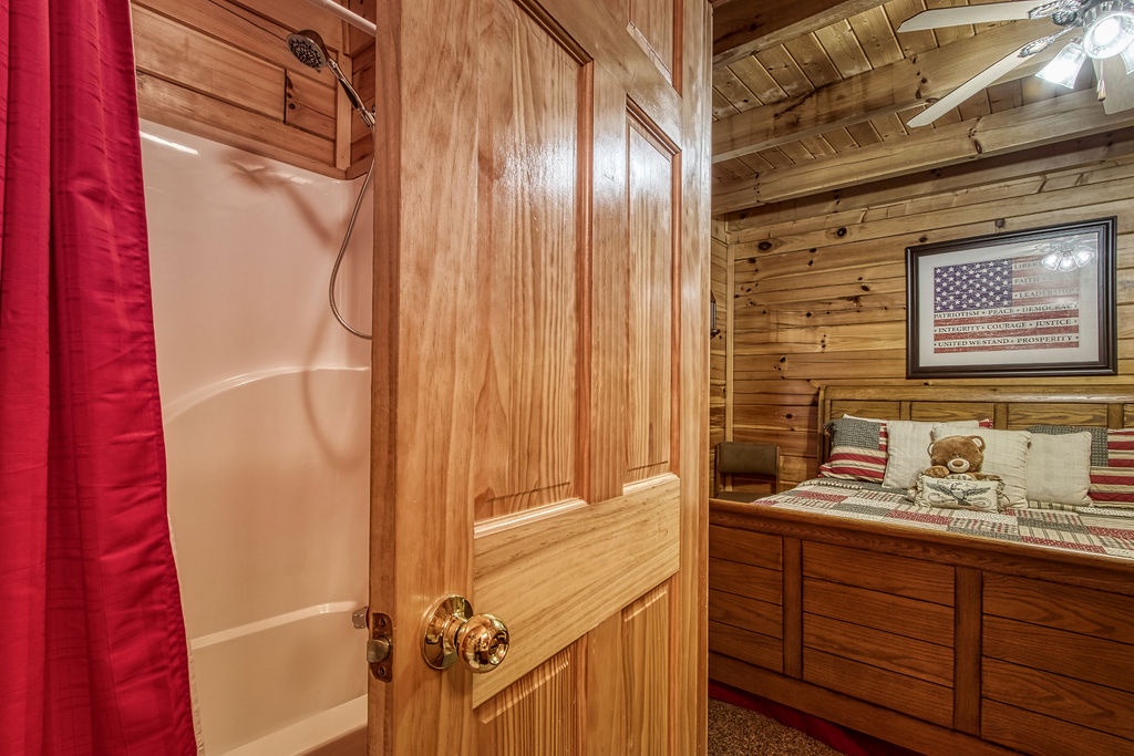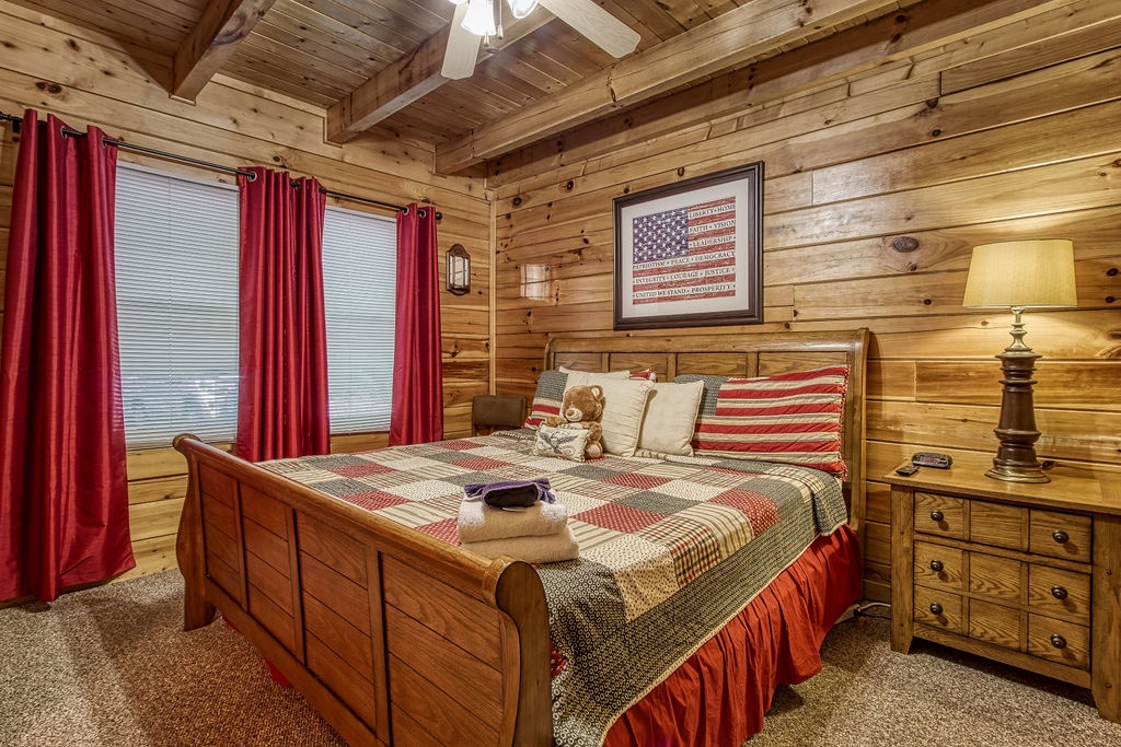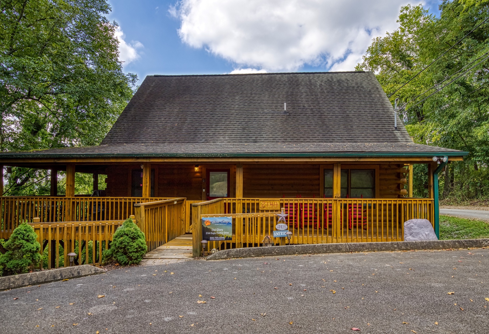 Attention….Stand tall…..Salute…..Pledge…..I pledge allegiance to “Old Glory”. May it be weather-beaten, this rustic two bedroom, two bathroom cabin stands strong and will have you singing the National Anthem before you reach the front door. There is ample flat parking for up to 3 vehicles and a walkway onto the deck that is flush to the driveway making this property not quite ADA accessible but it does have some handicap friendly features. The large wrap around porch features four red rockers where you can enjoy your morning coffee and conversations. Also features a gas grill and picnic table to enjoy a good ole American cook out with the family. After a long day of shopping and activities come back to the cabin and enjoy a dip in hot tub.