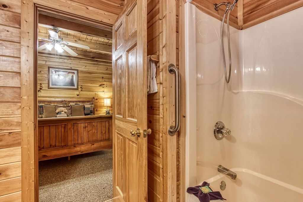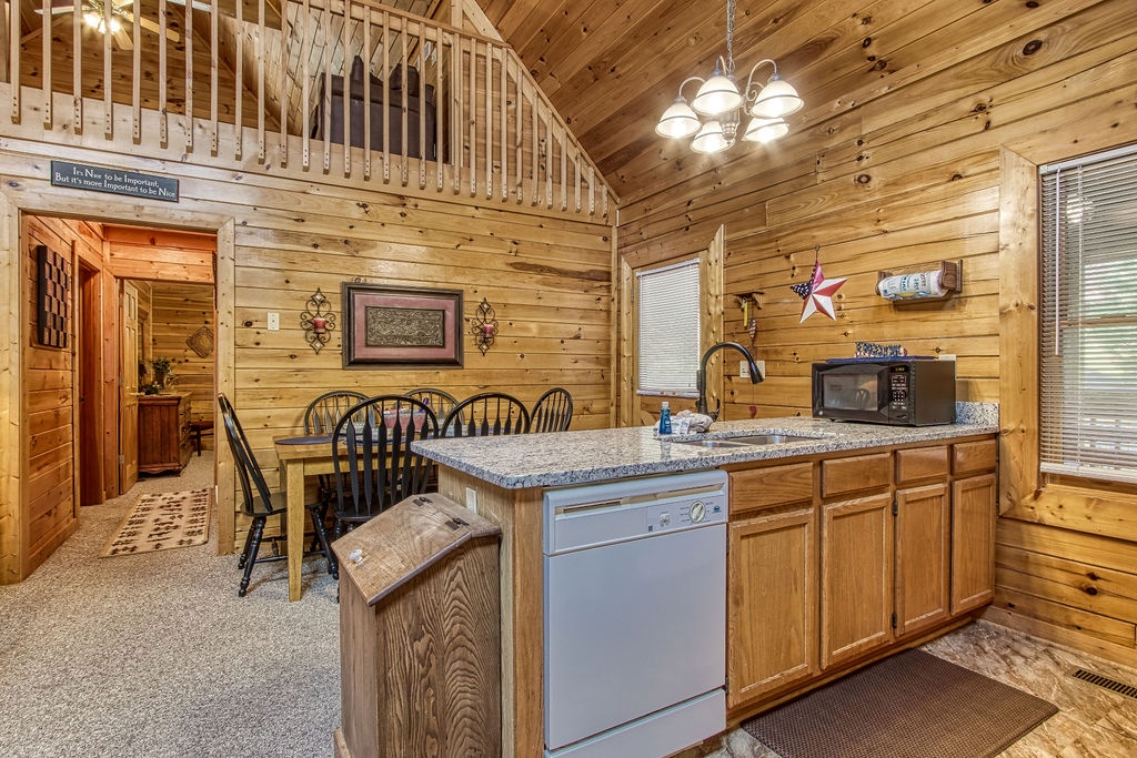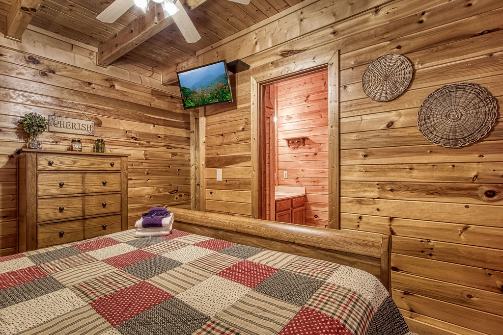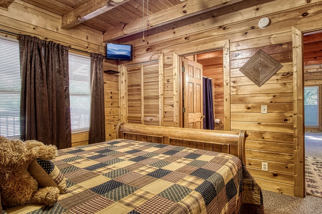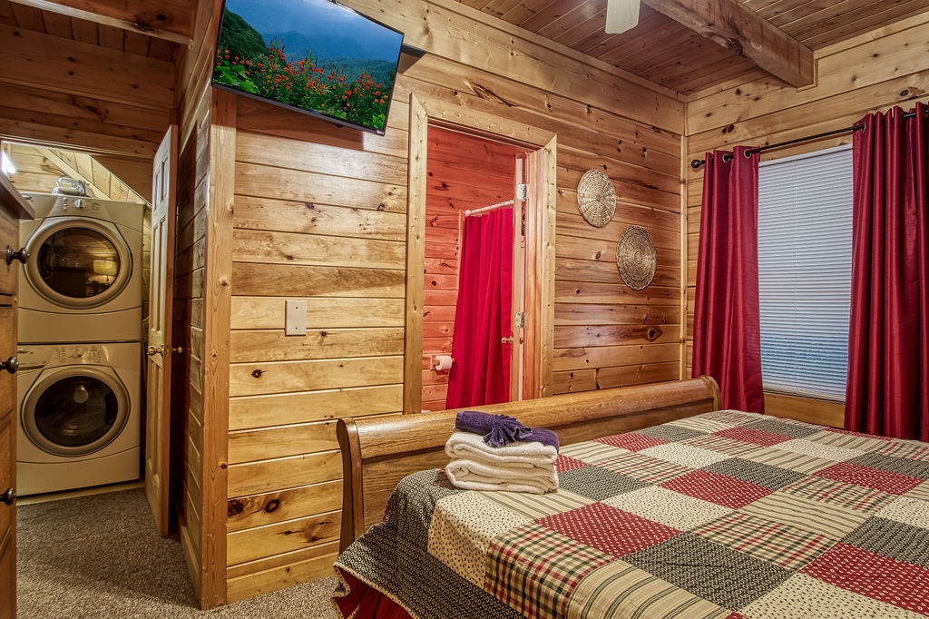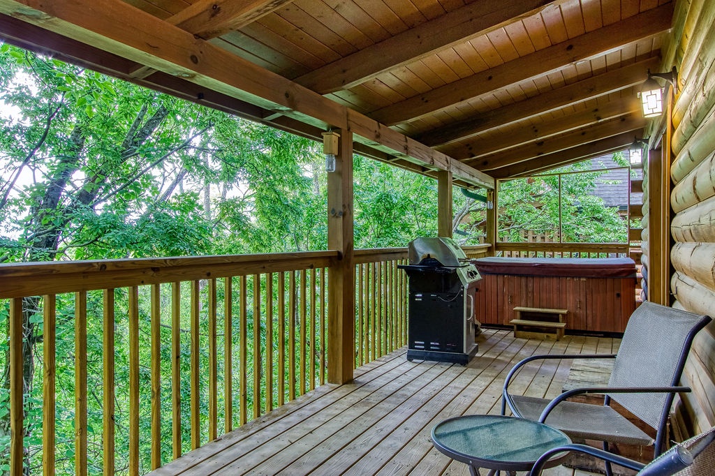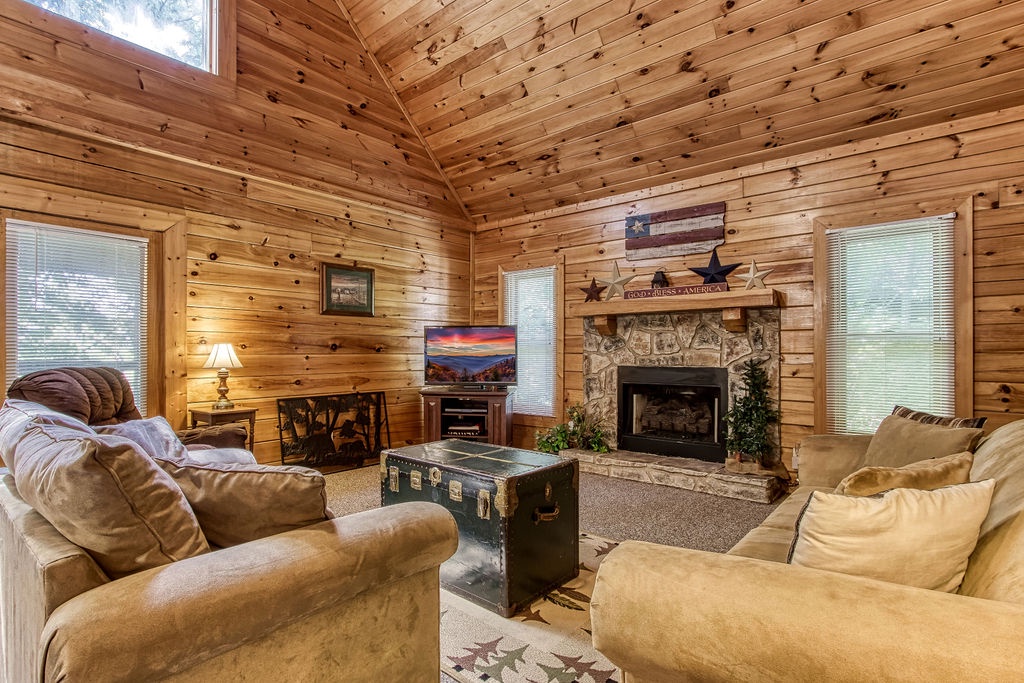 Attention….Stand tall…..Salute…..Pledge…..I pledge allegiance to “Old Glory”. May it be weather-beaten, this rustic two bedroom, two bathroom cabin stands strong and will have you singing the National Anthem before you reach the front door. There is ample flat parking for up to 3 vehicles and a walkway onto the deck that is flush to the driveway making this property not quite ADA accessible but it does have some handicap friendly features. The large wrap around porch features four red rockers where you can enjoy your morning coffee and conversations. Also features a gas grill and picnic table to enjoy a good ole American cook out with the family. After a long day of shopping and activities come back to the cabin and enjoy a dip in hot tub.