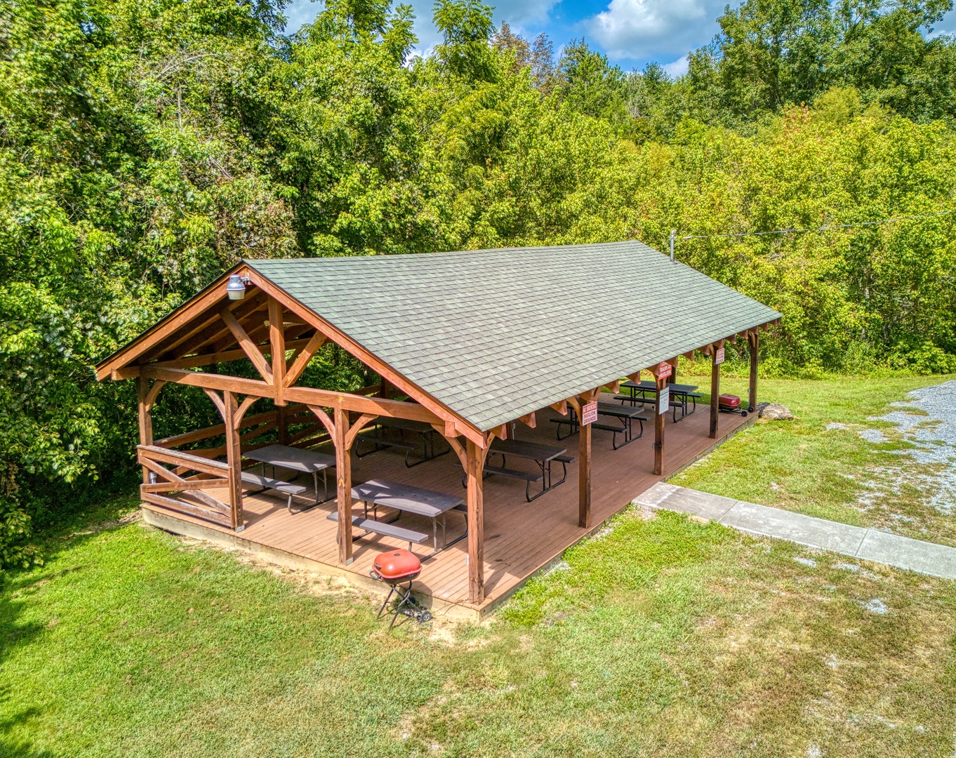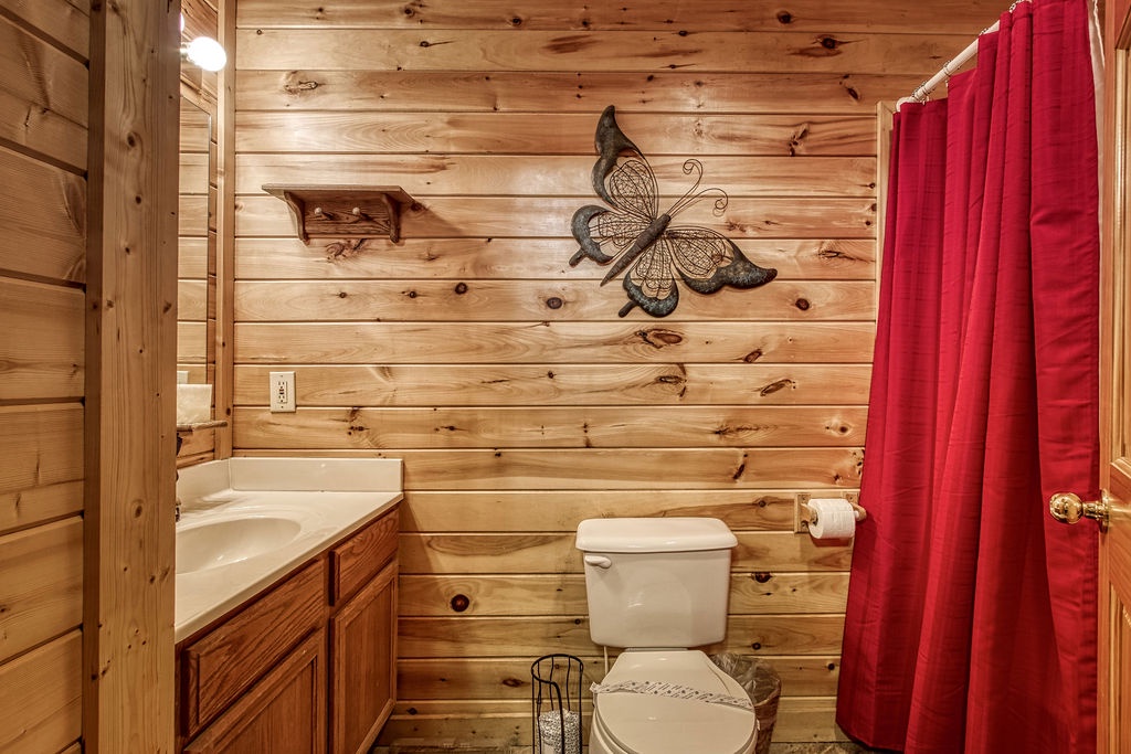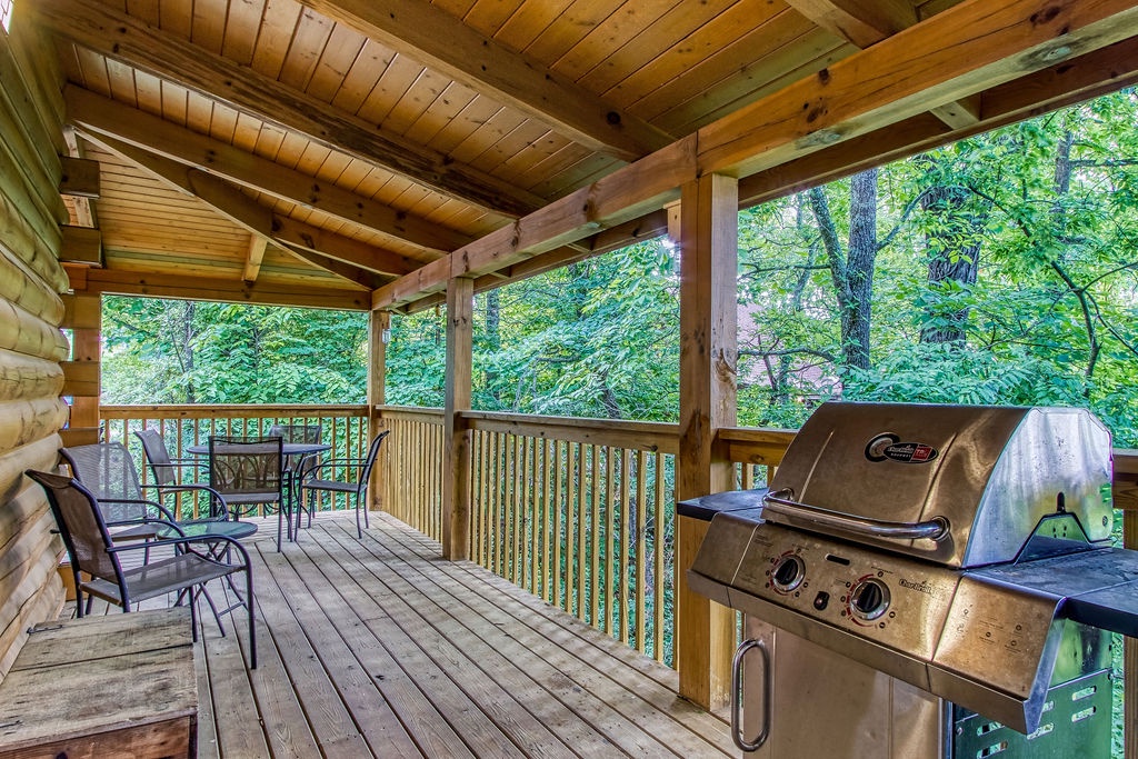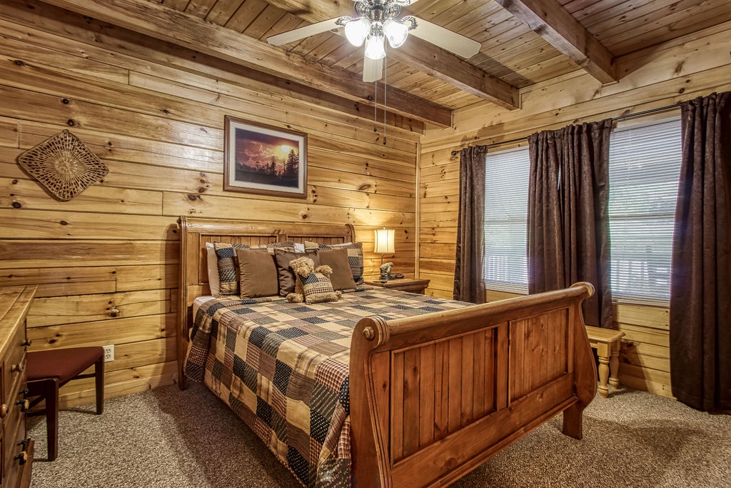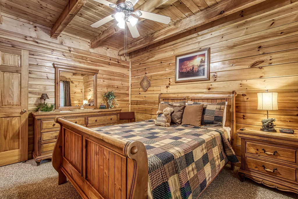 Attention….Stand tall…..Salute…..Pledge…..I pledge allegiance to “Old Glory”. May it be weather-beaten, this rustic two bedroom, two bathroom cabin stands strong and will have you singing the National Anthem before you reach the front door. There is ample flat parking for up to 3 vehicles and a walkway onto the deck that is flush to the driveway making this property not quite ADA accessible but it does have some handicap friendly features. The large wrap around porch features four red rockers where you can enjoy your morning coffee and conversations. Also features a gas grill and picnic table to enjoy a good ole American cook out with the family. After a long day of shopping and activities come back to the cabin and enjoy a dip in hot tub.