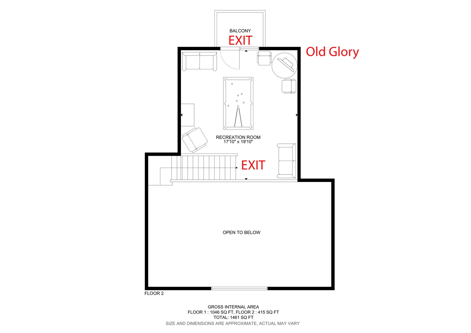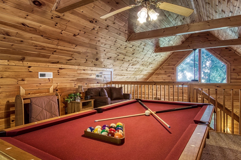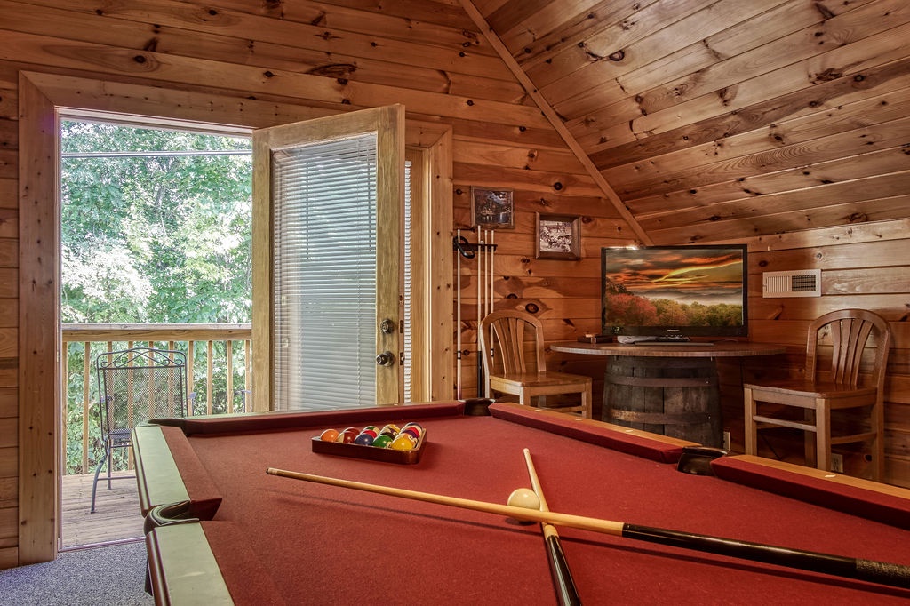 Now make your way to the loft for a friendly game of pool. You can also enjoy a nice family game night with the variety of board games located in the game chest on the left side of the room. Take a break from the game and step outside on the balcony for a breath of fresh air.
