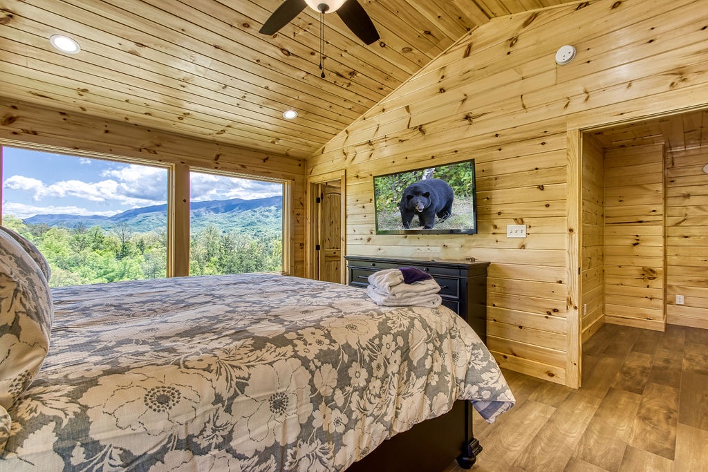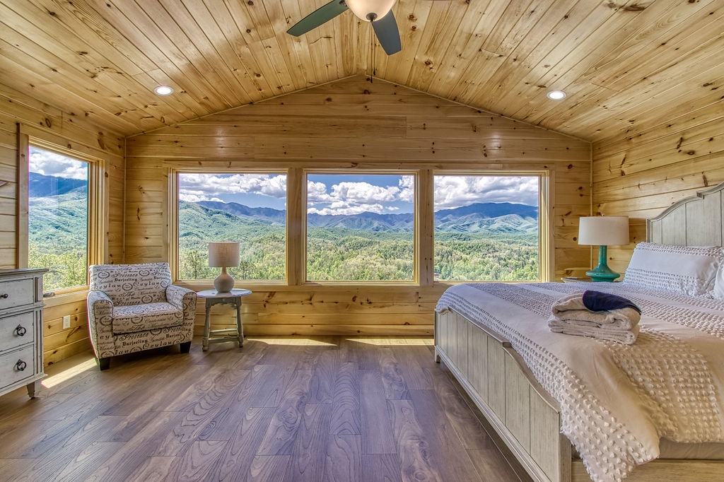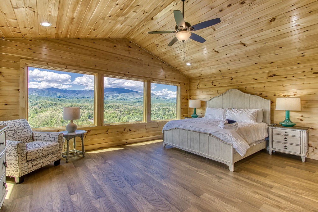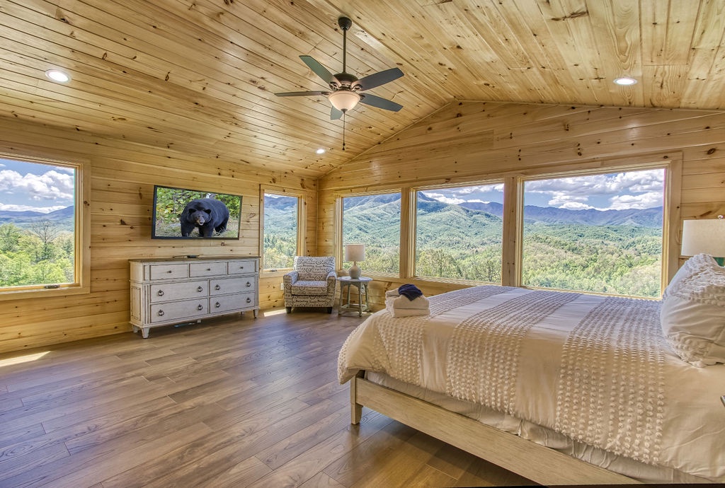 If you are looking for one of the of the most incredible views in the Smokies Panoramic View will deliver, looking directly at LeConte Mountain. These 2 bedrooms 2 ½ bath chalet is more than you can every ask for. Perfect for a weekend getaway or a long-lasting vacation to the Smokies. Offering a large great room with all wood hickory cabinets, large island, granite, and luxury stainless steel appliances in the kitchen area that will make you feel like you have just become a Master Chef. A comfortable sitting and dining area with a view of the 75” flat screen TV. This level also has a glass door leading to the covered deck with exposed wood cathedral ceilings, private firepit and hot tub to the right to soak in the views. Ready to head in for the night choose from the 2 King sized Master bedrooms upstairs with wood cathedral ceiling and plenty of large windows to enjoy the great mountain views, each with their own private luxury master baths. One bath has a walk-in shower and the other a shower tub combo that way you can rinse off the day before having the most relaxing nights sleep of your life. Wanting a vacation property that will give you a peaceful and relaxing vacation look no further. With views of a LeConte and luxuries of a home you can not find a better chalet than Panoramic View.