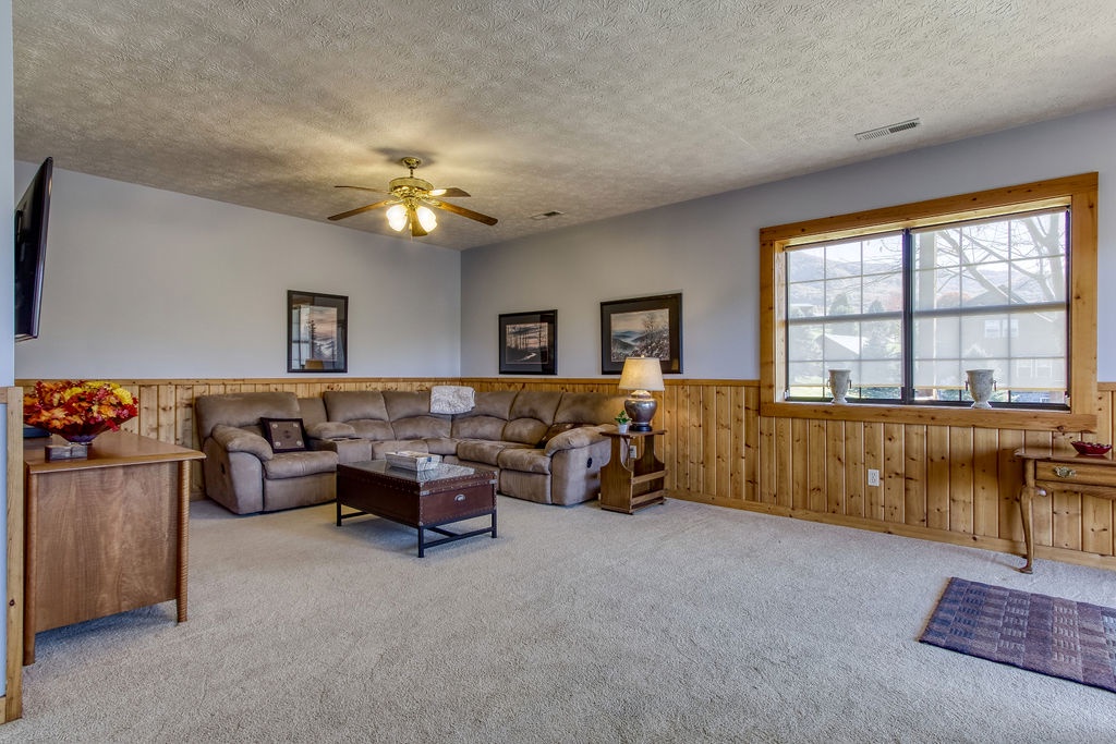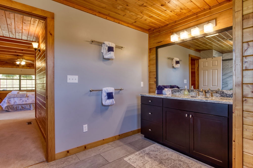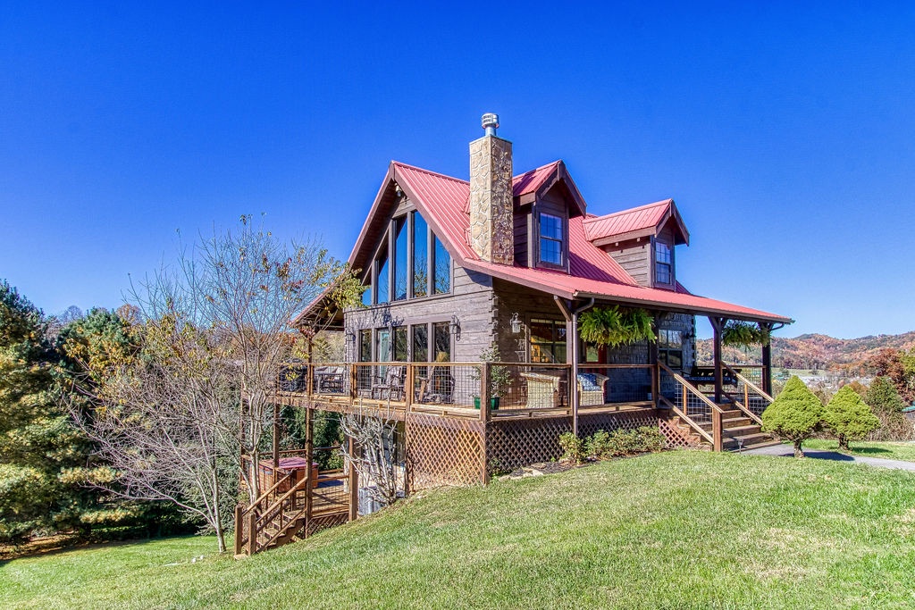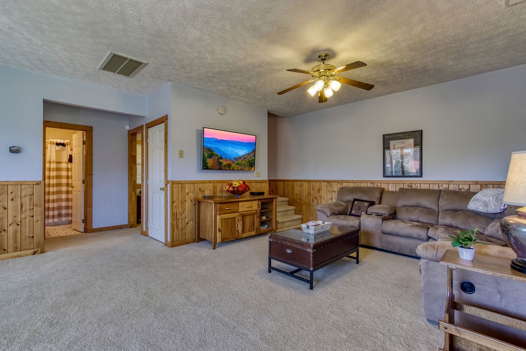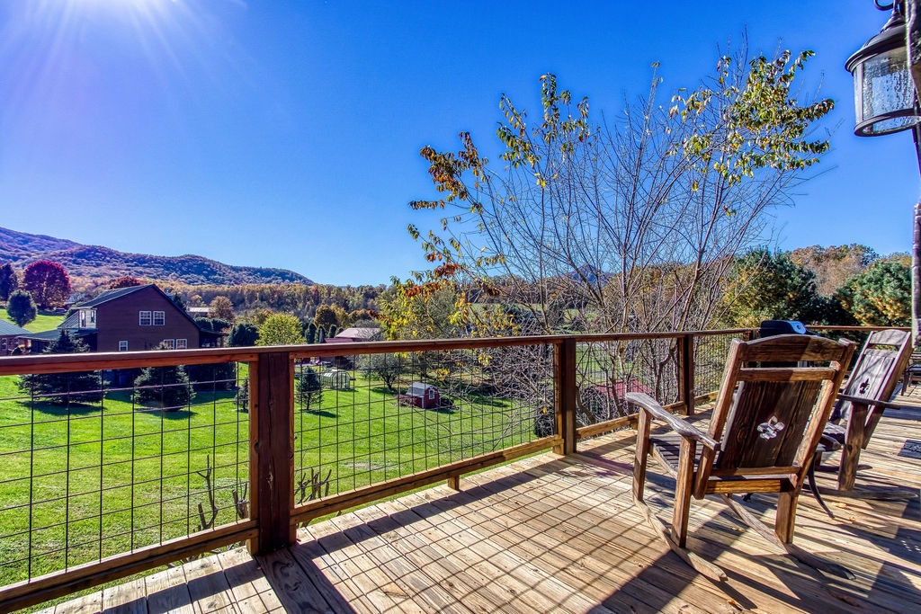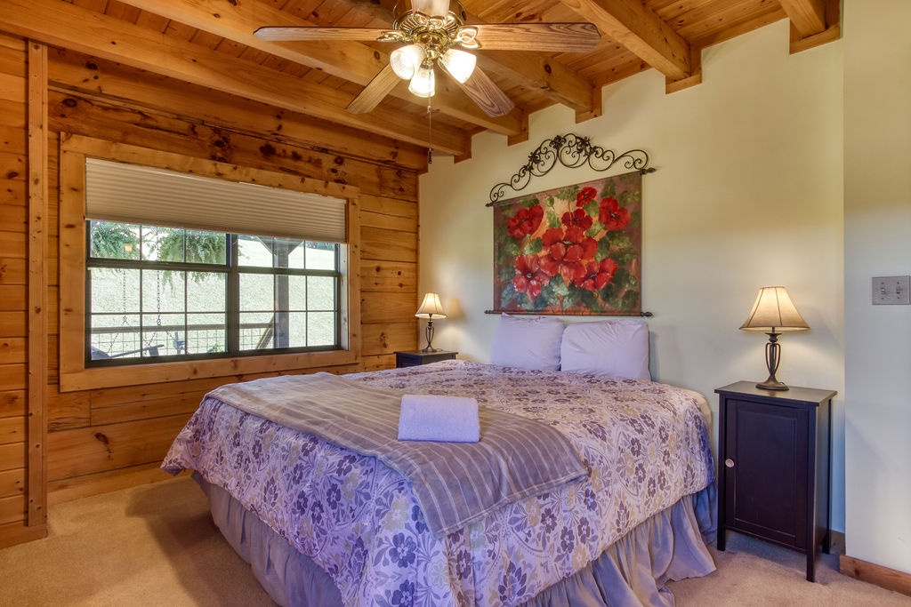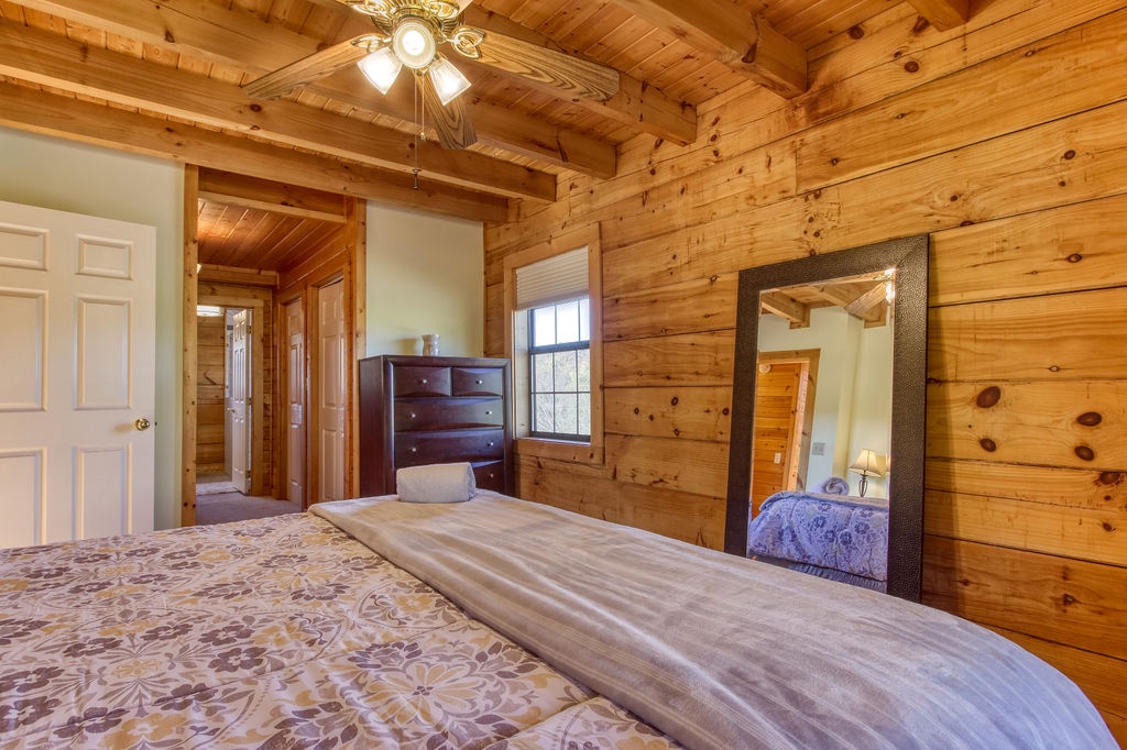 Come join us for a weekend getaway or a small family vacation in The Valley. Our cabin Picture Perfect is a perfect spot for anyone searching for some peace and quiet. It is a 3 bedroom 3 and a half bath that sleeps 6. The cabin is located in beautiful Wears Valley surrounded by the mountains with easy access to main road. Once arriving you will be in awe of the views of the mountains, the rolling hills, and forest trees. Just head up onto the wrap around porch an enter a cozy oasis. Upon entering you will be greeted with an open floor plan of the living room and kitchen. This space is honestly perfect for you to host family meals and watch the game at the same time not missing a beat. After dinner and the game cozy up on the loveseat and enjoy down time by the fireplace. Kiddos wanting something to occupy their time before bed. No problem, everyone can just head downstairs and let the kids get in a game of foosball, while you take an evening soak on the hot tub relaxing all those muscles before bed. When it is time to turn in just let the kids take the downstairs bedroom set up with two small twin beds and a full bathroom with tub/shower combo just beside that room. Give yourself the main level King Master. It offers a luxurious King bed, plenty of closet space, and a private bath with huge walk-in shower. There is also another suite in the open loft with a private bath that has the second walk in shower. After a good night sleep take your morning coffee out on the wrap around porch and enjoy the view. Fix lunch out on the grill before heading out for a night on the town to do it all over again. If you’re wanting a place to make wonderful memories and return to in order to escape the day-to-day hustle. Choose Picture Perfect it is truly the perfect place for your family getaway.