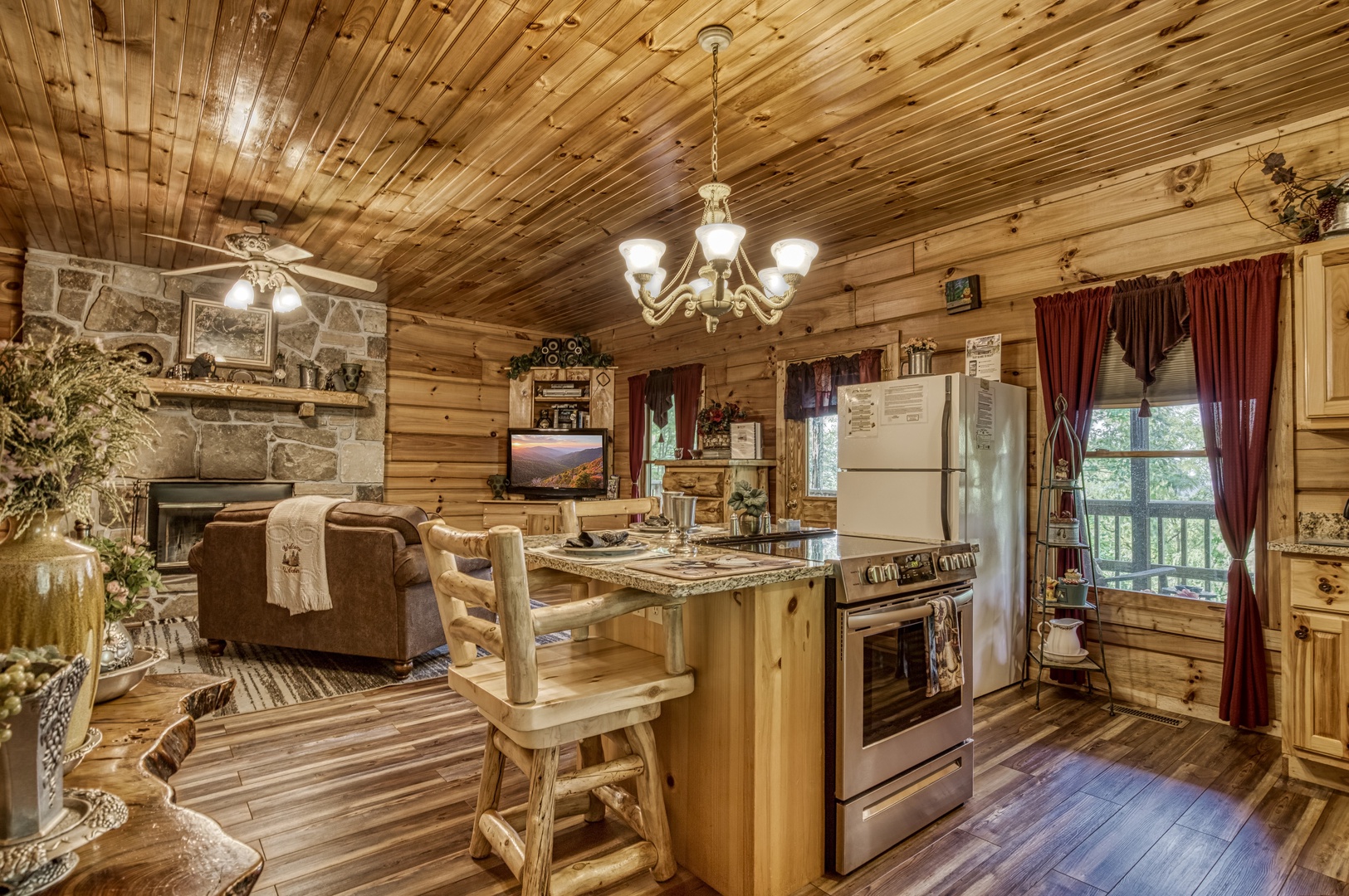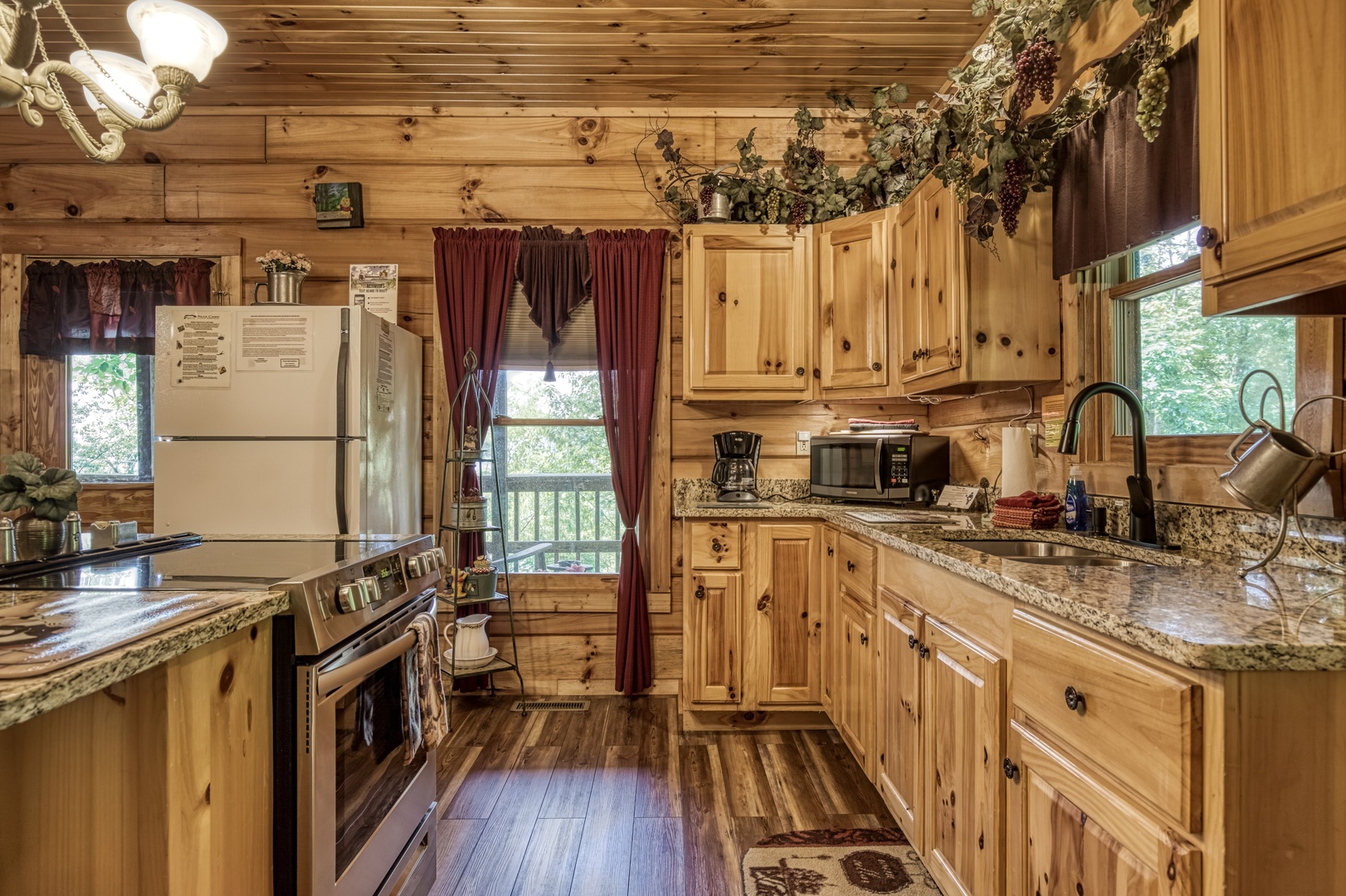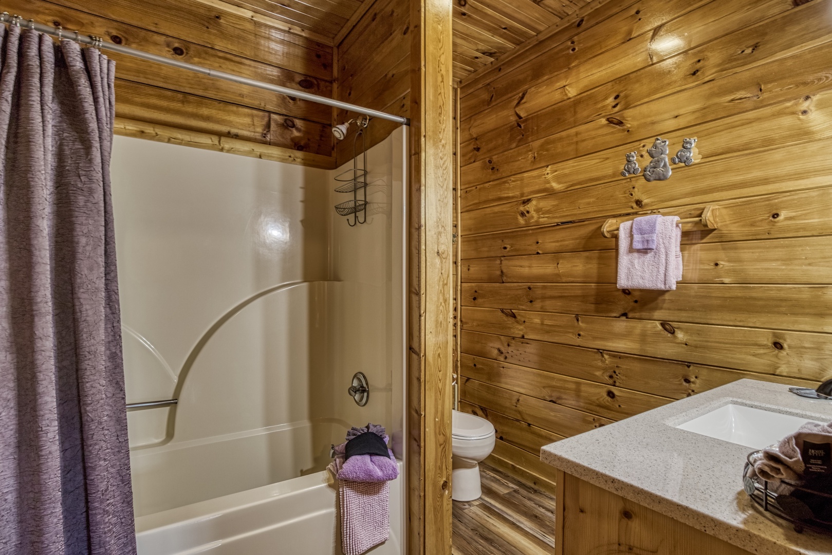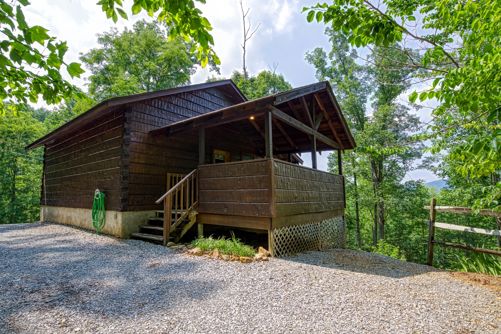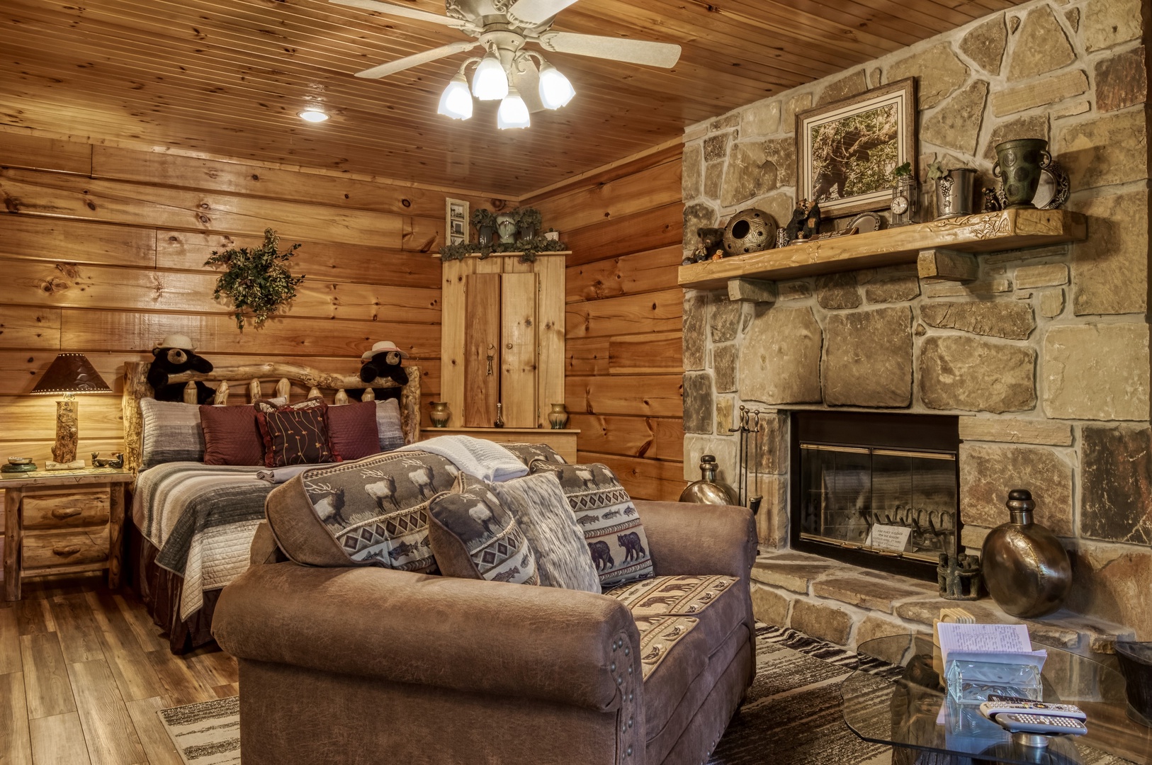 "Pooh Bear" is the perfect romantic getaway for honeymooners, anniversaries, or getaways. The unique decor of this cabin will excite and intrigue you, as you are greeted from the time you enter by the soothing sounds of easy listening on the stereo. The table is already set and ready for a romantic dinner for two. Located on Bear Mountain, approximately a 20-minute drive from Pigeon Forge, Splash Country & Dollywood, and 25-30 to Gatlinburg. This cabin has curvy, paved mountain roads and some steep inclines that can be narrow at times. There are also gravel roads that would not be recommended for motorcycles or trailers in any weather. There is parking available for 1 vehicle. This 1 Bedroom, 1 Bath unit that sleeps 2 has an open floor plan "studio" type cabin that is perfect for spending your time with the one you love. There are 7 steps to reach the cabin. There is a fully equipped kitchen (without a dishwasher), a King size bed, a Living area with love seat, TV, and stereo, along with a romantic wood burning fireplace. There is also a full bath with a shower bathtub combination. The deck offers a relaxing Hot Tub as well as rocking chairs that offer beautiful mountain & wooded views and a large charcoal grill for dinner under the stars. No matter what time of the year you visit, you will enjoy this private and secluded cabin perfect for rekindling or starting up a new flame. If you are looking for a relaxing, romantic cabin that is private and secluded and offers beautiful mountain views, "Pooh Bear" is the perfect cabin for you. Don't miss out --- Call us today to book a getaway you will always remember.
