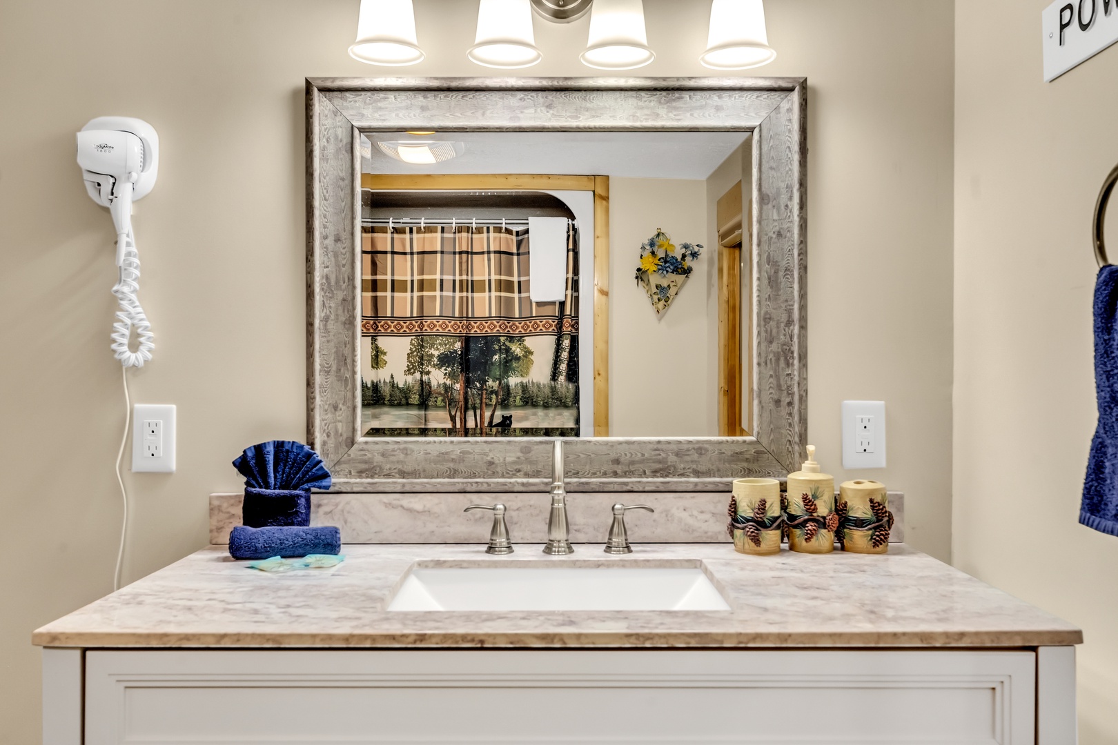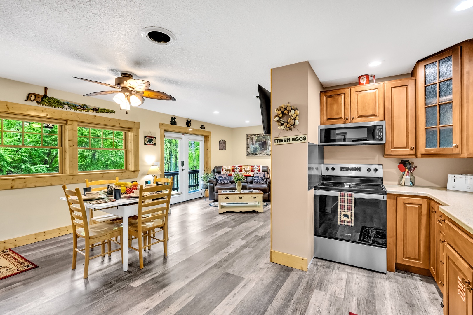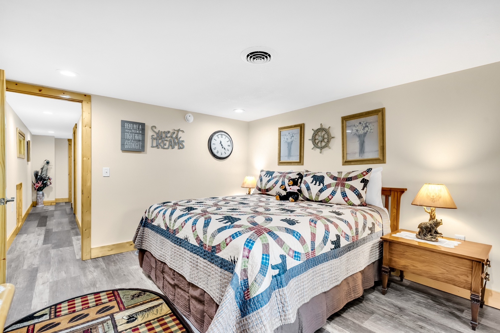 “Rambling Bear on Cove Creek” is the perfect place for your next Smoky Mountain getaway. This recently remodeled 3-bedroom 2 bath sleeps 6 and has all the luxuries of home. Located just minutes from Pigeon Forge in one direction and The Great Smoky Mountain National Park in the other direction, this cabin has the most ideal location. The beautiful 2 story cabin has all a family of 6 would need for a relaxing getaway, whether that means exploring all Pigeon Forge, and Gatlinburg have or escaping for a family hike in the National Park. Just up the steps from the driveway to the main entrance you'll be greeted with a full-length deck leading to the ready to go Hot Tub, a wonderful patio area with a picnic table, Charcoal grill and a wood burning Fire Pit. Step into the cabin and find a cozy open living room, dining room and kitchen area. The living room has 2 leather reclining couches with a large flat screen TV and an electric fireplace to create the perfect ambiance. (The Wood Burning Stove is Non-Functional) The Dining area for 4 flows into the fully equipped kitchen featuring all stainless-steel appliances. Down the hall from the kitchen, you will find a full bathroom with a walk-in shower, a Washer and Dryer closest for your convenience plus the main floor Queen bedroom, with a Flat screen tv and French door access to the main deck. Head up to the top floor to find 2 wonderfully decorated King bedrooms, both with Flat screen TVs and a shared hall bath. Don't miss your chance to relax in “Rambling Bear on Cove Creek” and Book now.