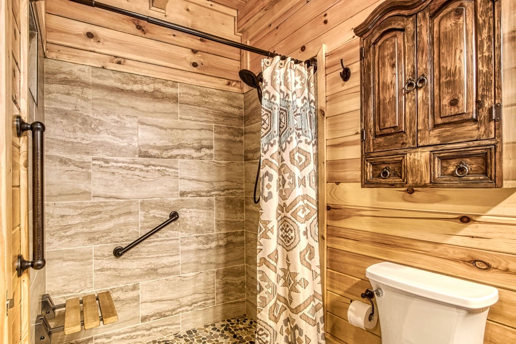 This newly remodeled 2 bedroom 2.5 bathroom cabin with level parking for 2 vehicles And no steps to enter the cabin. With 2 master bedrooms on the main floor one of which has a beautiful walk in shower with a shower seat and grab bars.