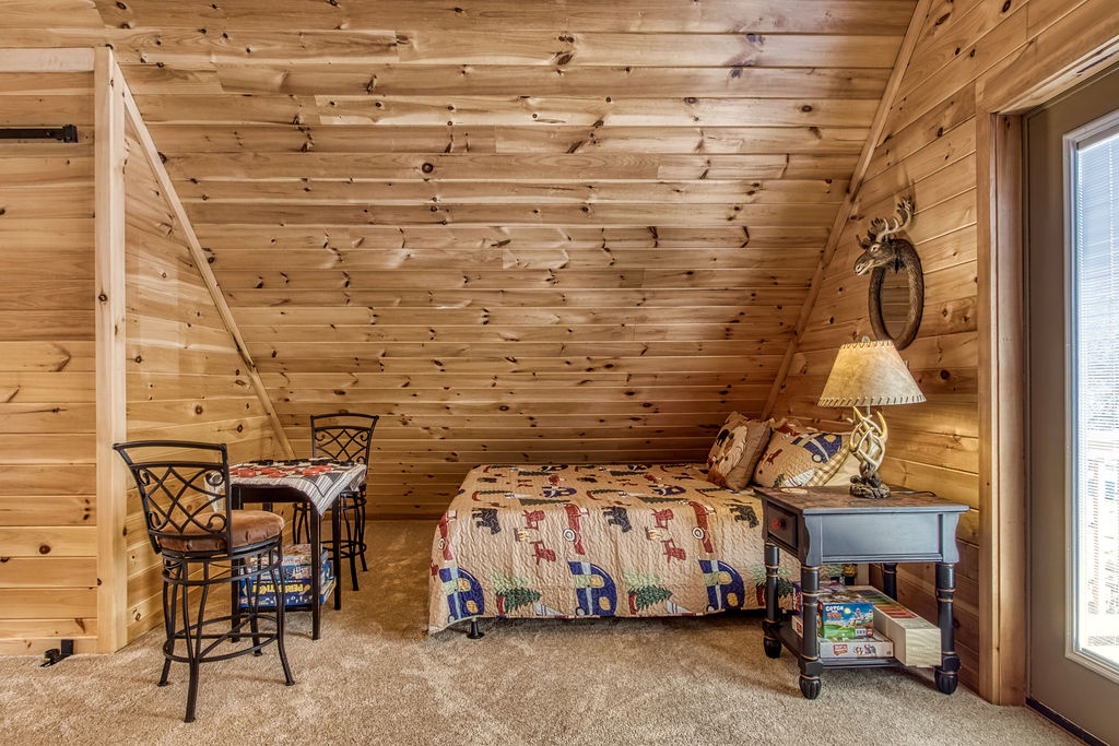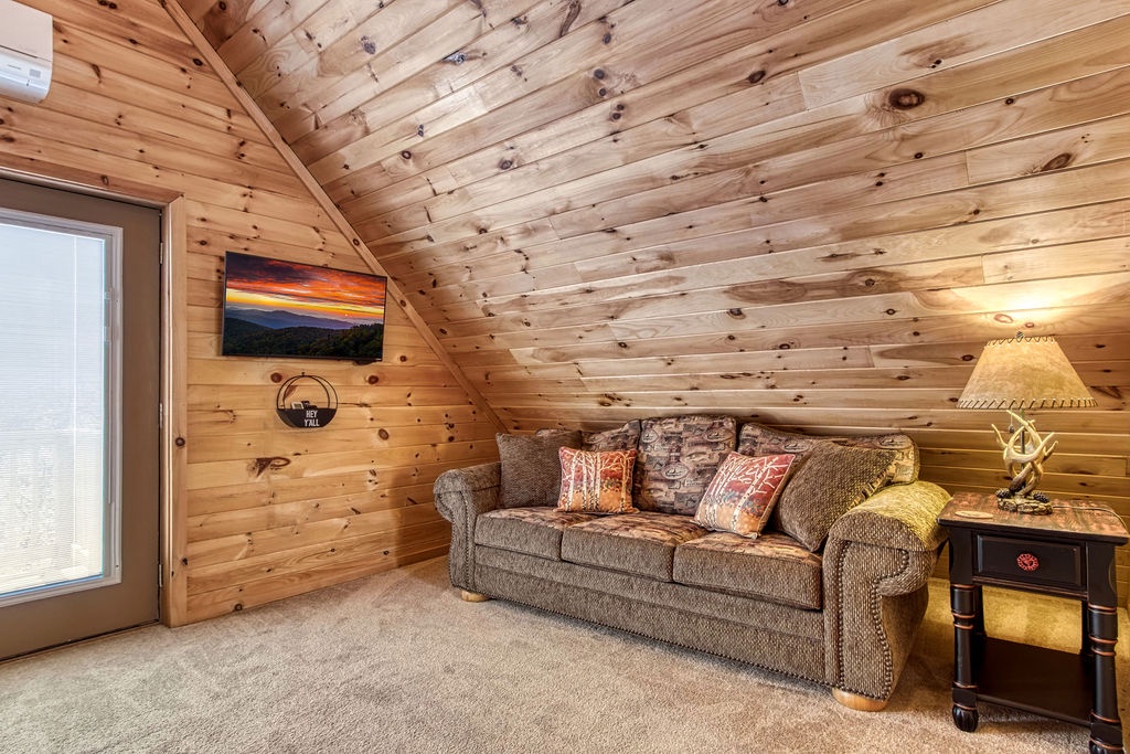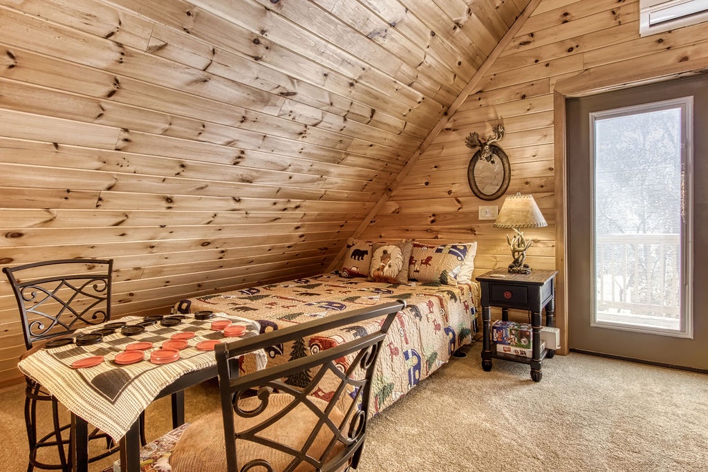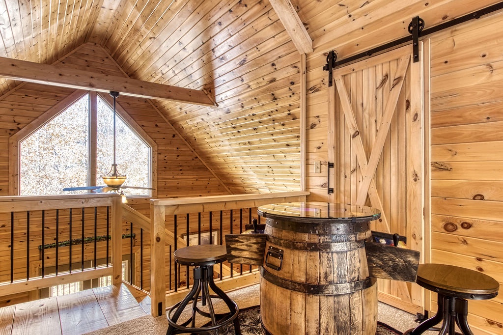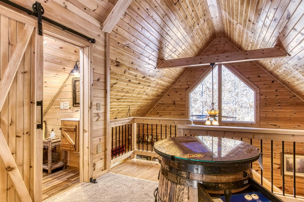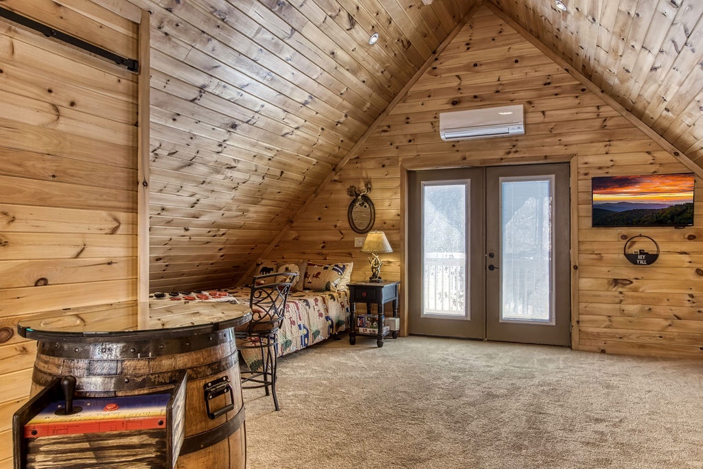 The top floor loft has a custom half bath, Barrel multi arcade game, Flat screen smart tv and Queen bed and a couch to relax on while playing one of the many board games.