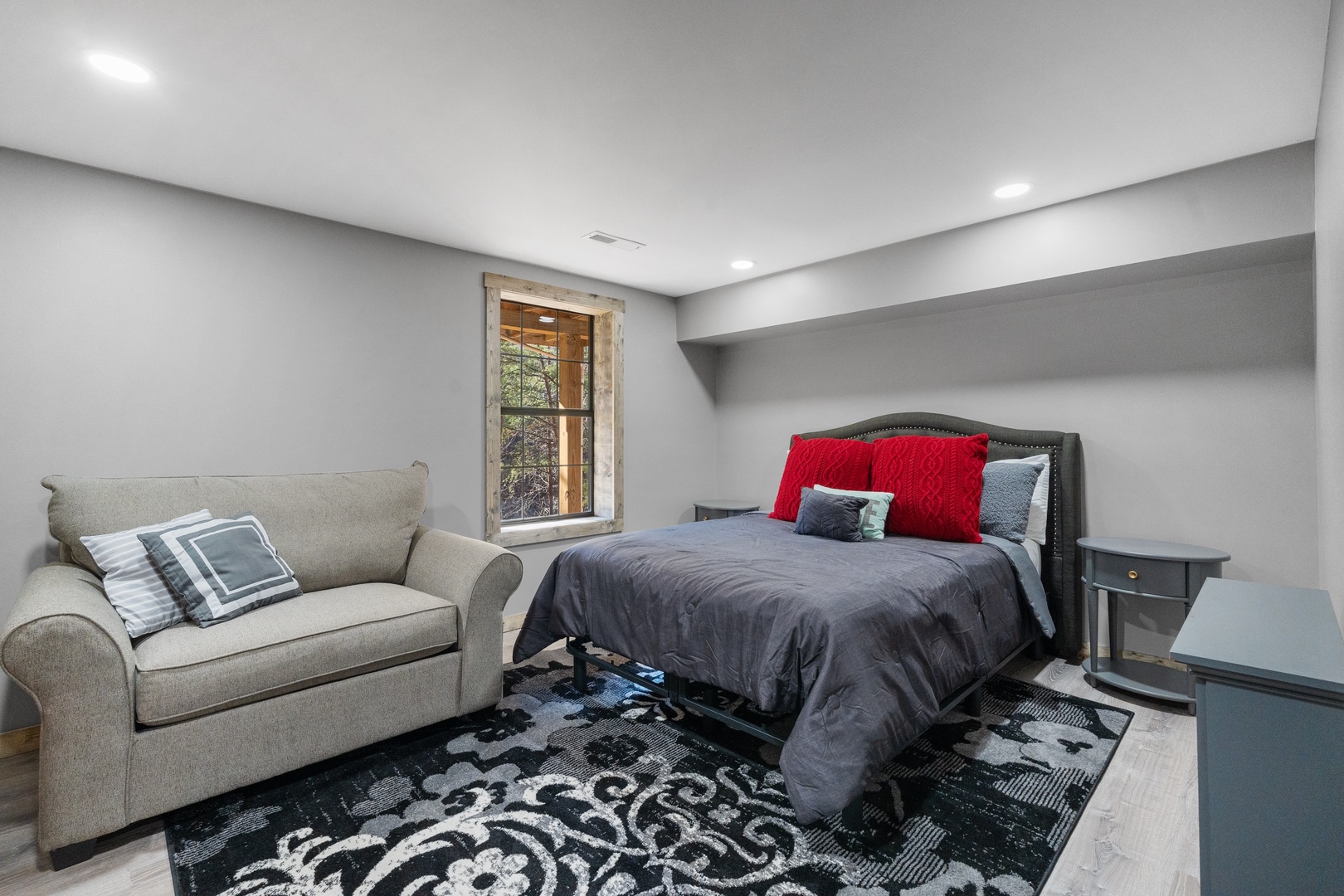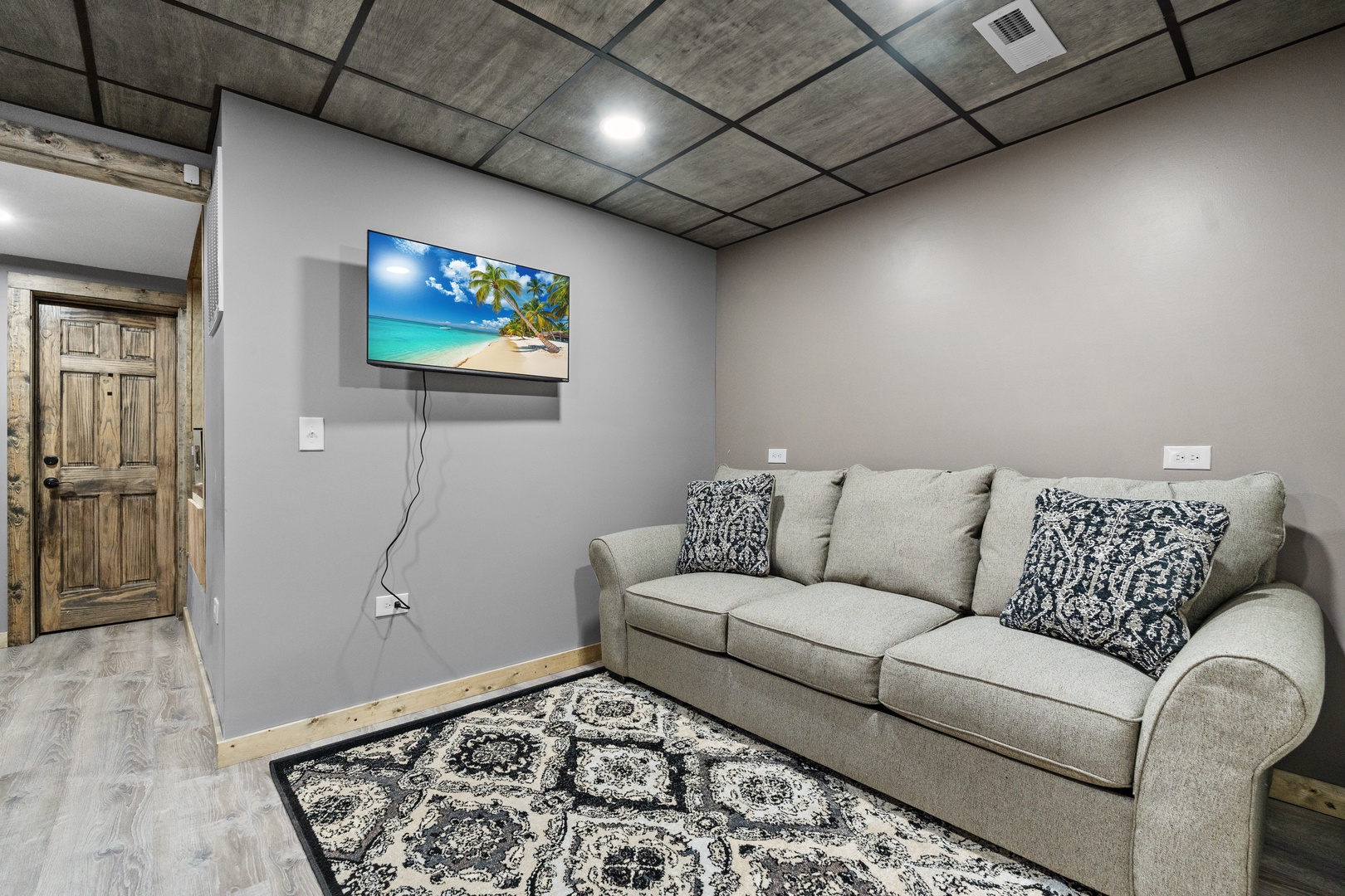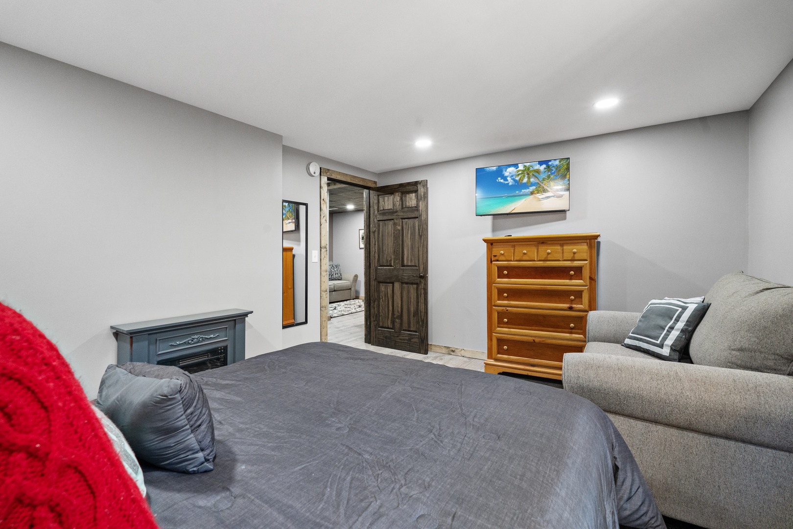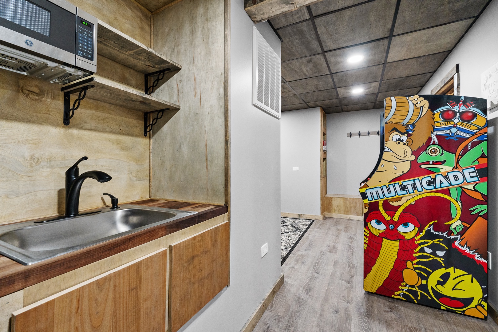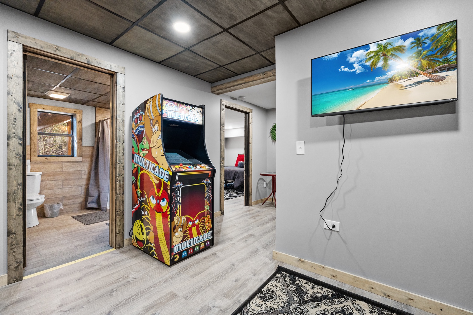 To access the downstairs walk outside to the side of the house where you’ll find a small living area with an arcade game, microwave, mini fridge. Also has a bedroom with a queen bed and a queen sleeper sofa and a bathroom with a shower.