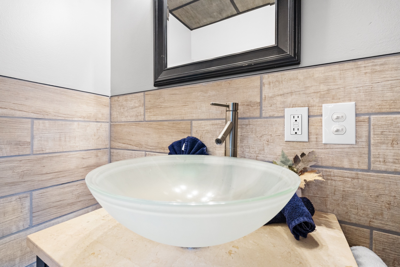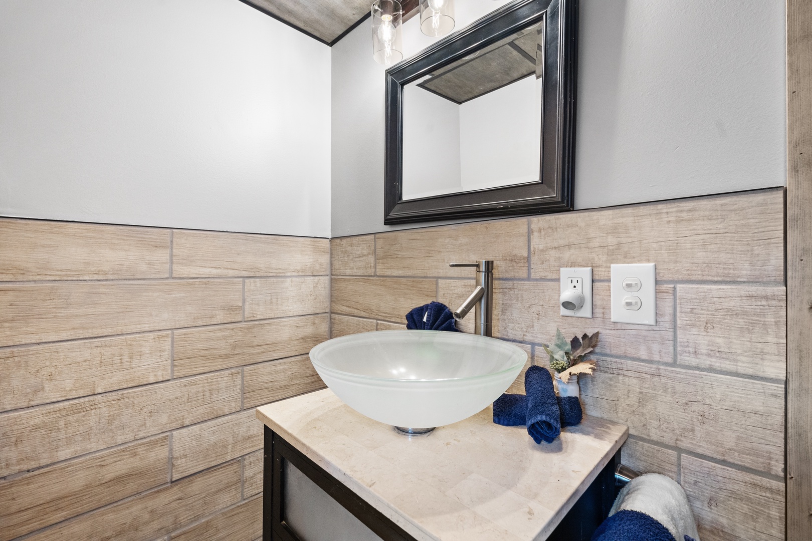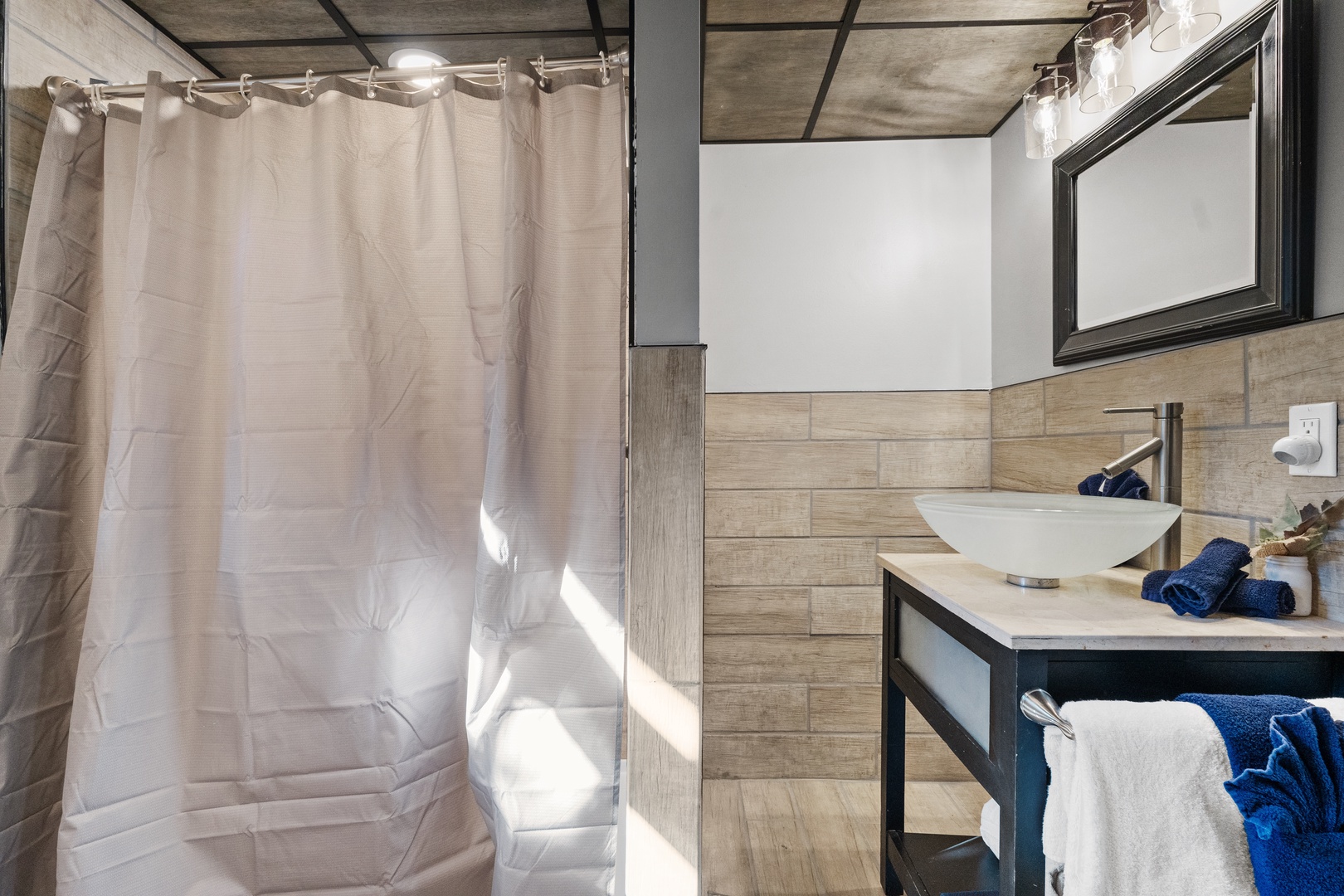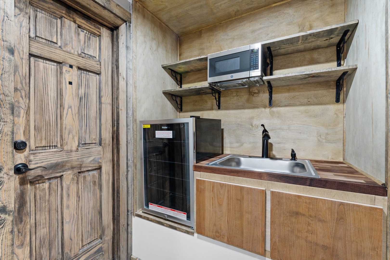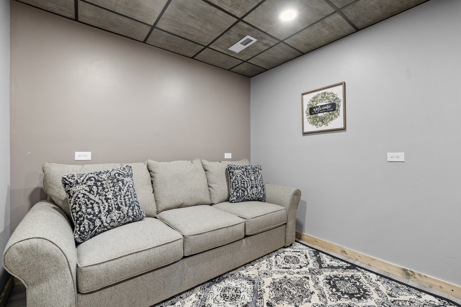 To access the downstairs walk outside to the side of the house where you’ll find a small living area with an arcade game, microwave, mini fridge. Also has a bedroom with a queen bed and a queen sleeper sofa and a bathroom with a shower.