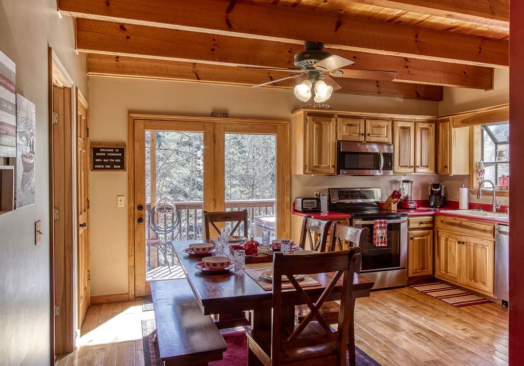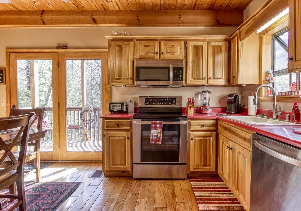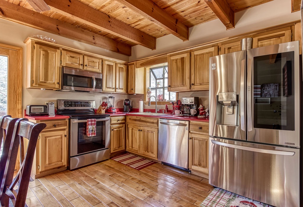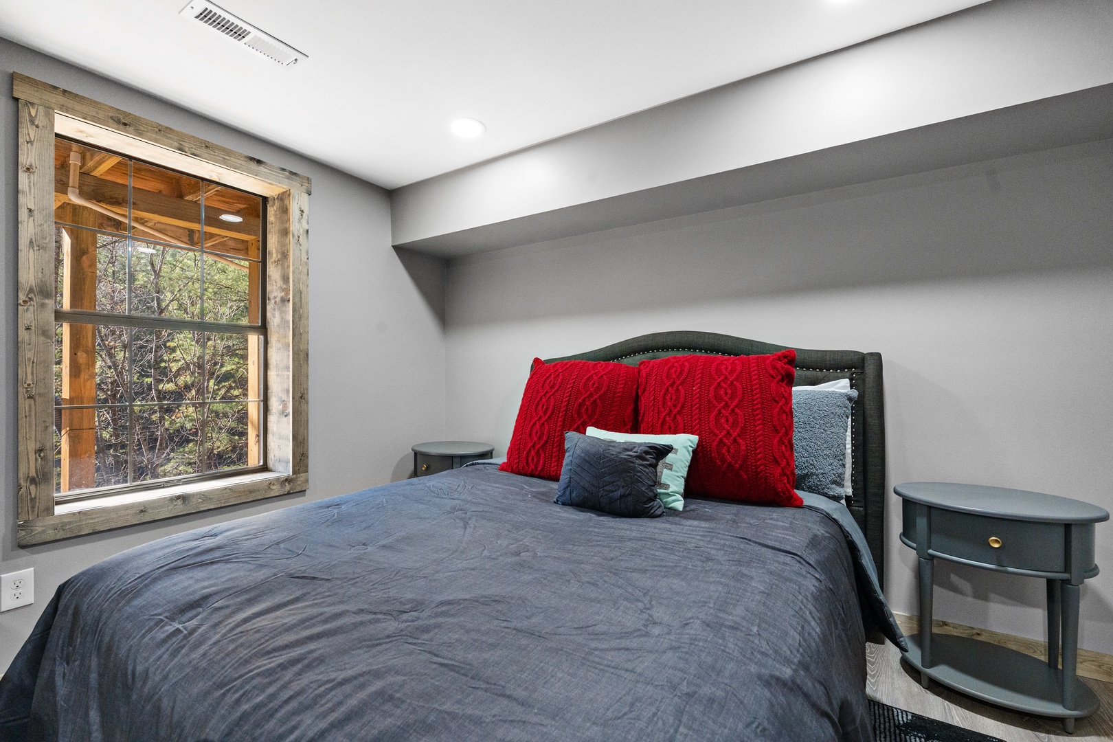 As you enter the cabin, you will be immediately drawn to the elegant surroundings. The spacious living room, and a gas fireplace that provides a cozy and inviting feel. The Master bedroom boasts a Queen size sleigh bed and a full bathroom with a jacuzzi tub and separate shower. Just a step down from the main living area is a fully equipped modern kitchen which offers high-end stainless-steel appliances and an eat-in dining table that seats 6+. The family chef will be in heaven, whether it be cooking an romantic dinner for two or making snacks for the kids.