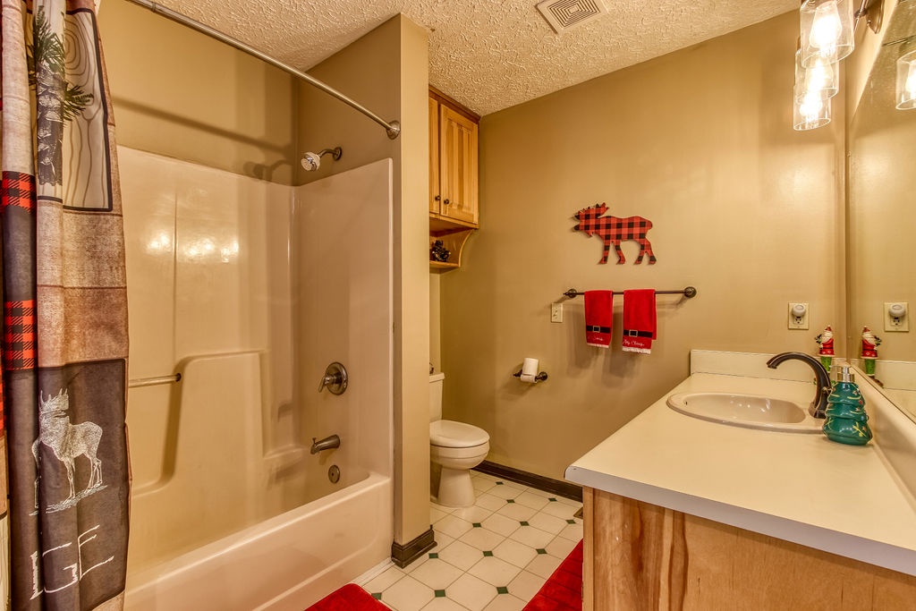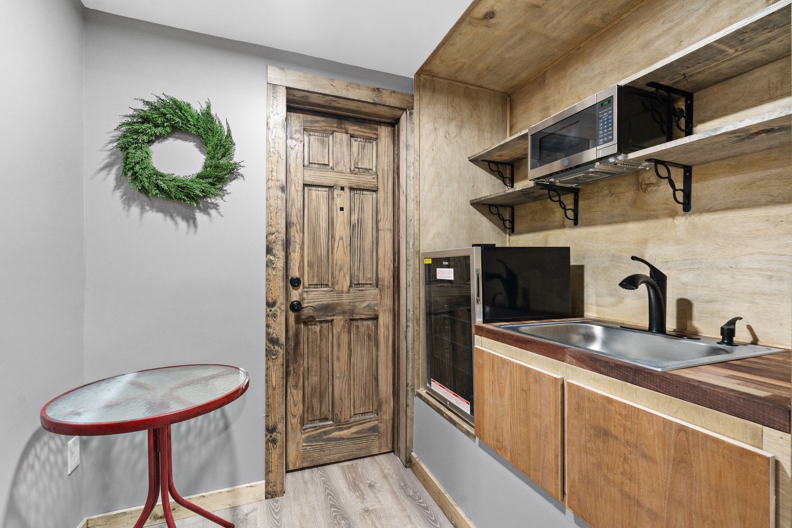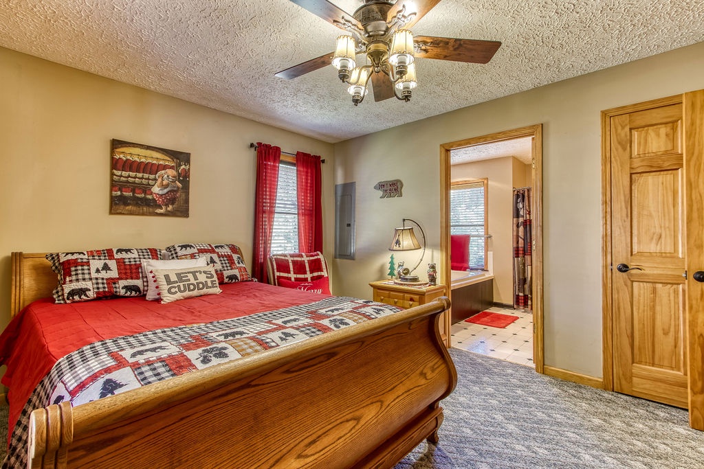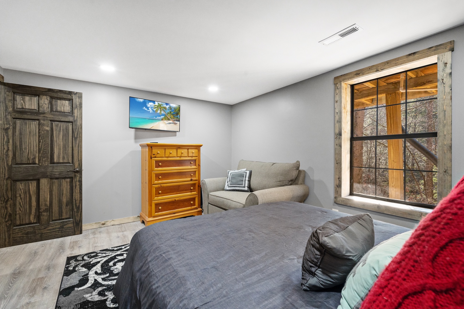 As you enter the cabin, you will be immediately drawn to the elegant surroundings. The spacious living room, and a gas fireplace that provides a cozy and inviting feel. The Master bedroom boasts a Queen size sleigh bed and a full bathroom with a jacuzzi tub and separate shower. Just a step down from the main living area is a fully equipped modern kitchen which offers high-end stainless-steel appliances and an eat-in dining table that seats 6+. The family chef will be in heaven, whether it be cooking an romantic dinner for two or making snacks for the kids.