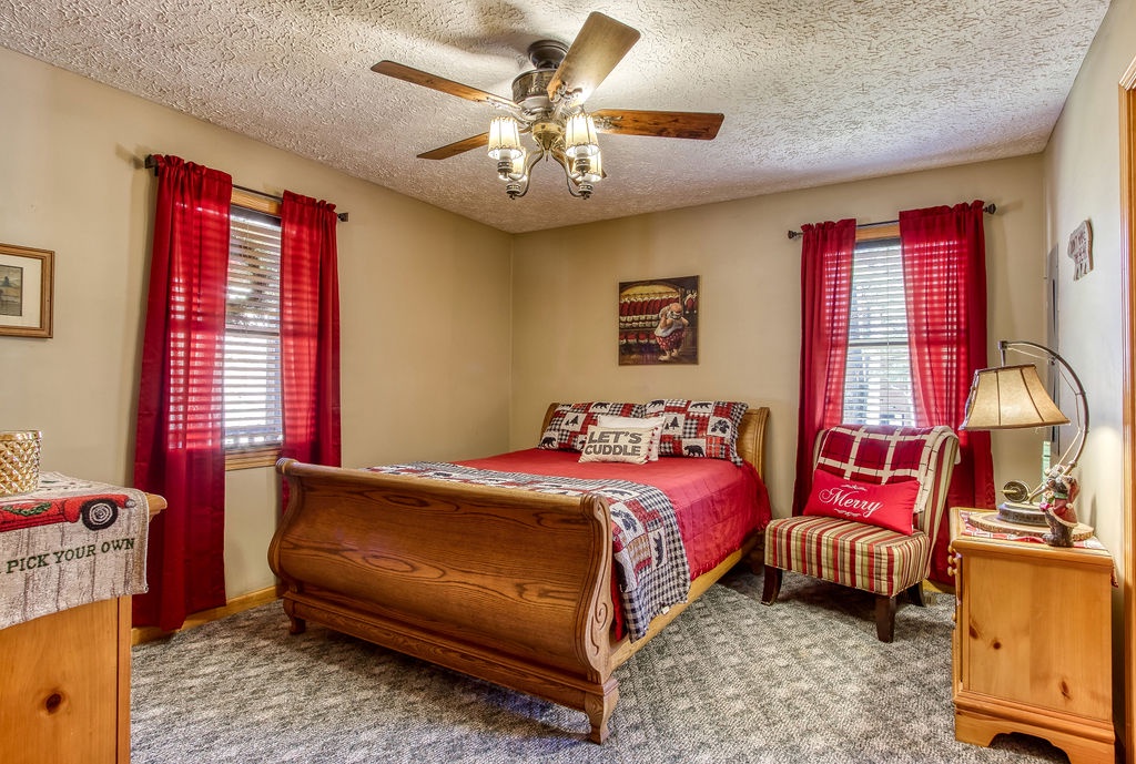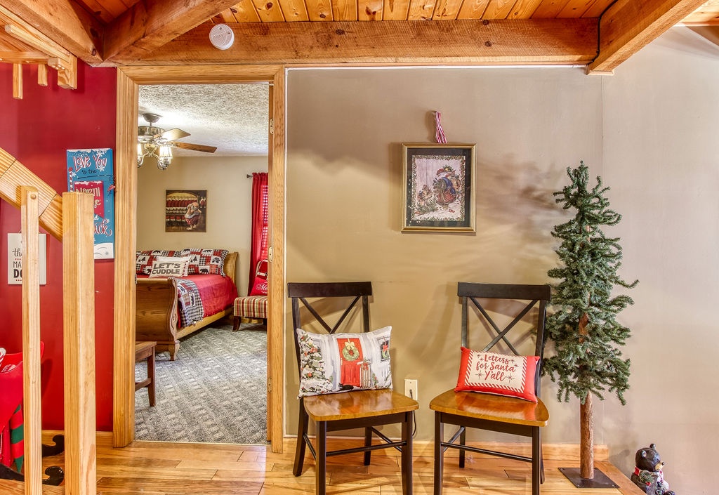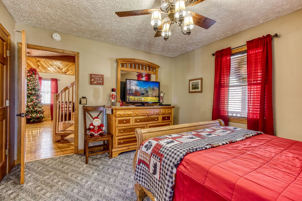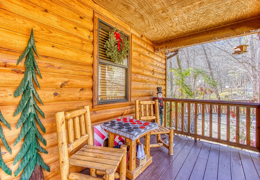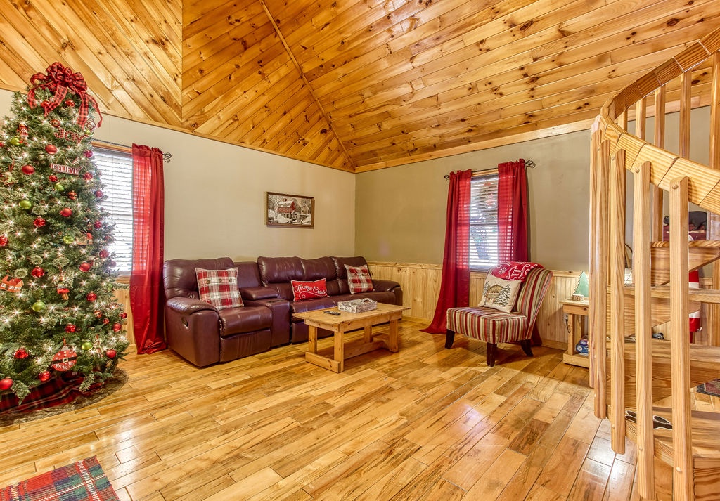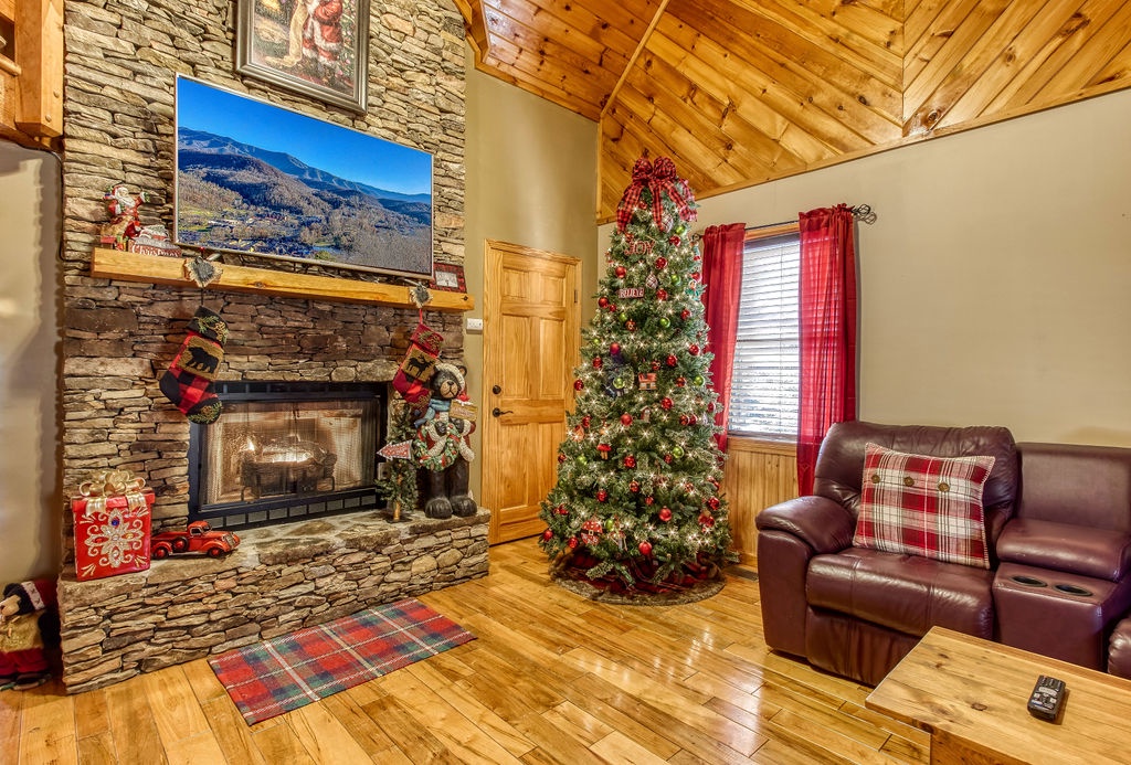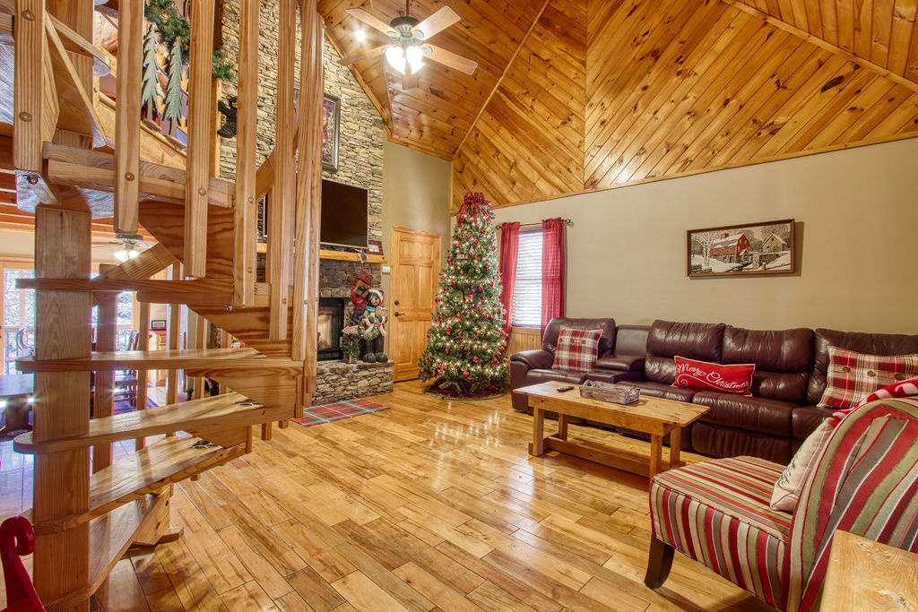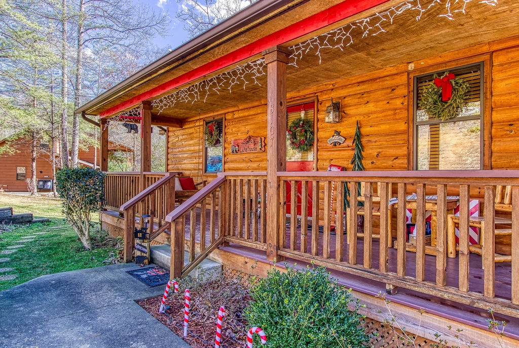 This cheerful property is a two bedroom two and a half bath that sleeps 10 with plenty of extra space. It is about 15 minutes from Pigeon Forge and 25 from Gatlinburg. You will have an easy drive, not hitting gravel until you are on the road just before the cabin. You will be pulled in by all the joy the cabin exudes, with its stunning views outside, and the warm Christmas décor inside.