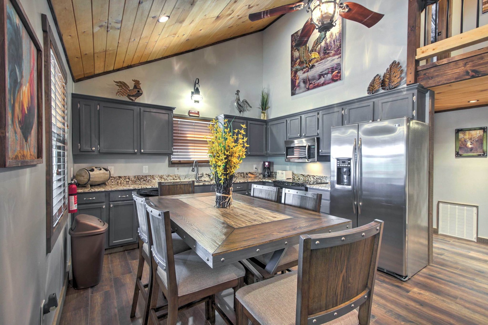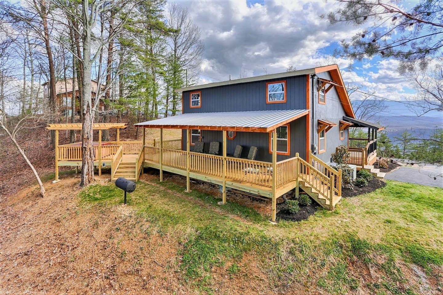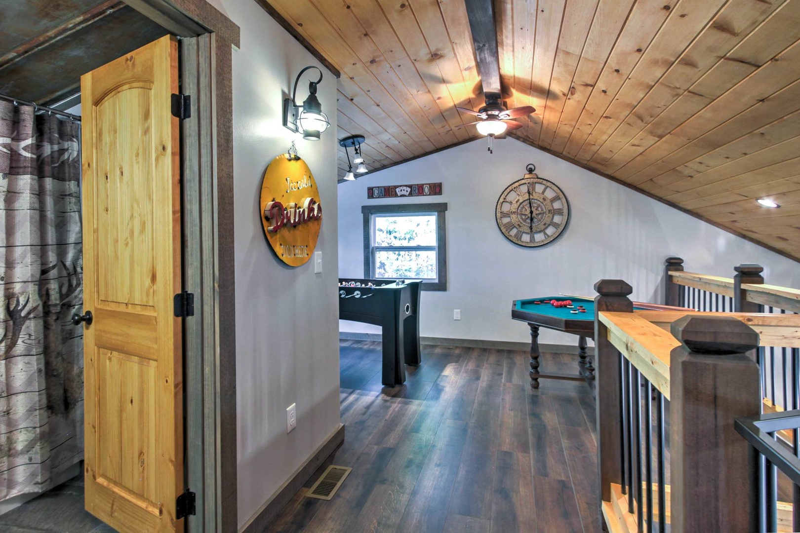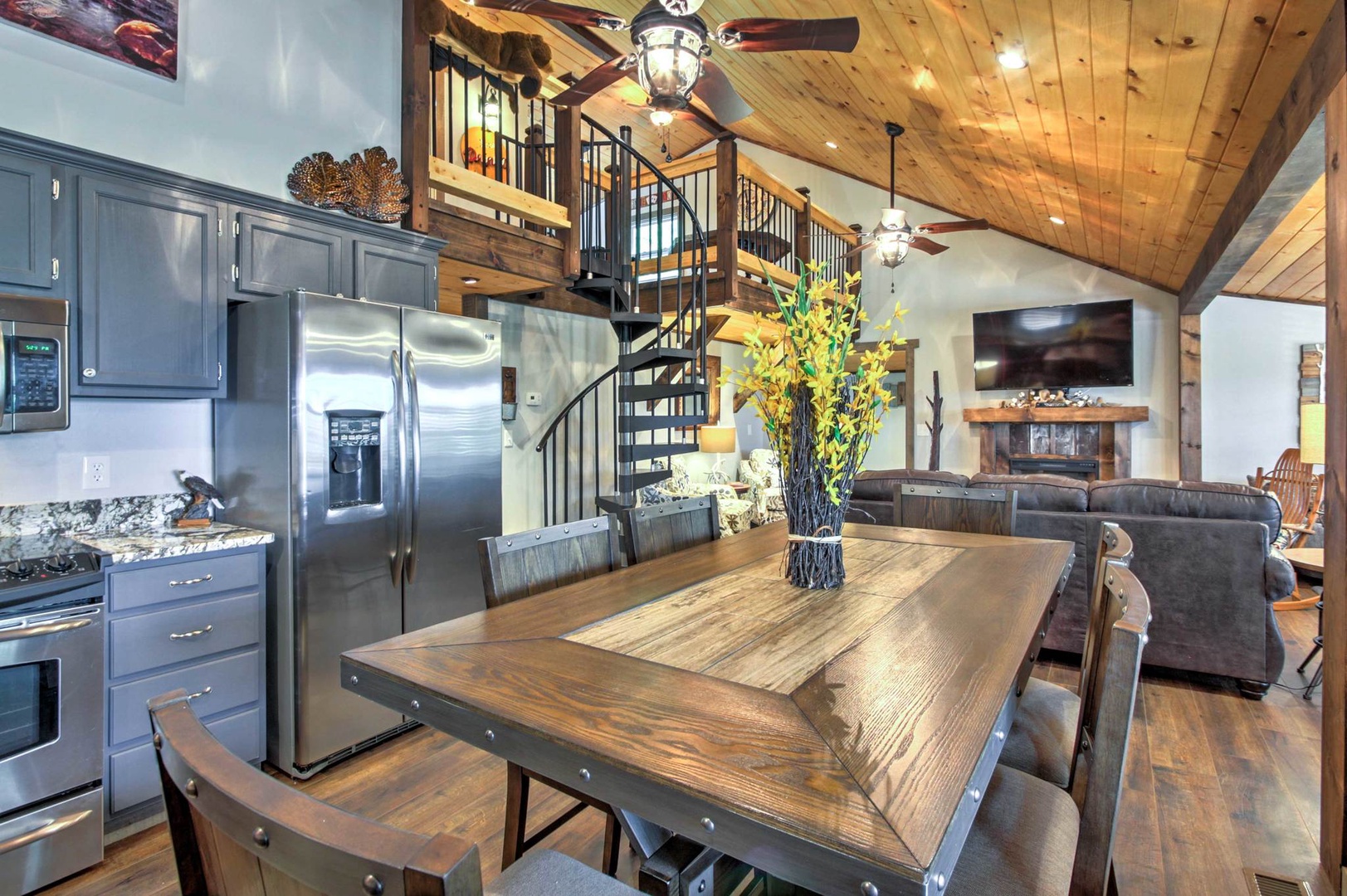 Smoky Mountain Loft....Relax in luxury! Enjoy this Rustic Chic, 3 bed 2 bath Loft Near Dollywood & Gatlinburg. This two story house has a beautiful porch, perfect for lazy days to relax in the rocking chairs while overlooking the mountains, and a fire pit to enjoy at night, which will seat 4 perectly! When you enter the house, it’s designed in this beautiful rustic farm style and offers a beautiful open floor plan to the Living room and Kitchen. The Kitchen is fully equipped and offers granite counter tops, stainless appliances, and is centered around this gorgeous wood stained dinning table that will seat 6 comfortably. The Living area has a beautiful electric fireplace with a flat screen TV, with top of the line furnishings and decor. You can’t go wrong with the whole family siting around the TV, watching the game while the kids play tick tack toe! All the bedrooms come with custom vanities and wood work that makes this place stand out above the rest. The main level bedrooms are decorated separately in Moose and Cow styles, both come with Queen beds and flat screen TV’s. The main level also has a Washer and Dryer and a bathroom with a shower/ tub Jacuzzi combo with a stone sink & waterfall faucet. As you walk up to the spiral staircase to the second floor, you will find the Master King room decorated in tribal print and arrows. A separate bathroom with a shower/ tub combo with no Jacuzzi, also has a stone sink with a waterfall faucet. The upstairs also has a table football, bumper pool table, and a basketball goal with mini basketballs. You’ll get amazing views from the front and back decks. The back deck comes with a charcoal grill, corn hole, and yard dice game. Enjoy relaxing under the covered deck at night with rope lighting and plenty of seating for the whole family! Relax in the gazebo styled hot tub nestled in the woods while overlooking the mountains. VIEWS from every room. Sleeps up to 8 people. Smoky Mountain Serenity, Smoky Mountain Hideout.. all within walking distance. "Smoky Mountain Loft" rests on the outskirts of Pigeon Forge, located just minutes away from great restaurants, shopping, and entertainment! You'll be delighted to discover the most popular attractions of Dollywood and Splash Country are 6 miles away for endless family fun and thrills. Take a 10-minute drive to Pigeon Forge, where you'll visit the Smoky Mountain Alpine Coaster or The Island in Pigeon Forge - an all encompassing entertainment complex with shops, casual eateries, and a few rides. Be sure to taste some local favorites at The Old Mill Restaurant, Jimmy Buffet's Margarita or Paula Deen's Family Kitchen. For groups of adults traveling together, check out top-rated Tennessee Legend Distillery to try delicious whiskeys and unique flavors of moonshine. Wine lovers will want to get straight to Hillside Winery, offering free tours and tastings of their Italian-style wines! A 30-minute drive northeast will take you to Forbidden Caverns, where you'll discover underground trails that lead to sparkling cave formations. Nature enthusiasts will also love ziplining through the aerial adventure park at Firefox Mountain, or day-tripping to Great Smoky Mountain National Park to explore one of the many scenic hiking trails. For delicious restaurants, dazzling entertainment, and unique shopping opportunities, spend a day along the strip in downtown Gatlinburg 20 minutes away. While you’re in the area, stop by Ober Gatlinburg which offers snow skiing, ice skating, a mountain roller coaster, snow tubing, water raft rides, kiddie land, and wildlife encounters, all year long! We also have 2 other cabins within short walking distance. Smoky Mountain Loft 3 bed 2 bath -sleeps 8 , Coming Soon...Smoky Mountain Hideout 3 bed, 3 bath sleeps 10. Getting around Uber, Trolley stop nearby at Patriot Park with transportation to Sevierville , Pigeon Forge, Gatlinburg,- Nearest Major Airport: McGhee Tyson Airport (~39 miles away)