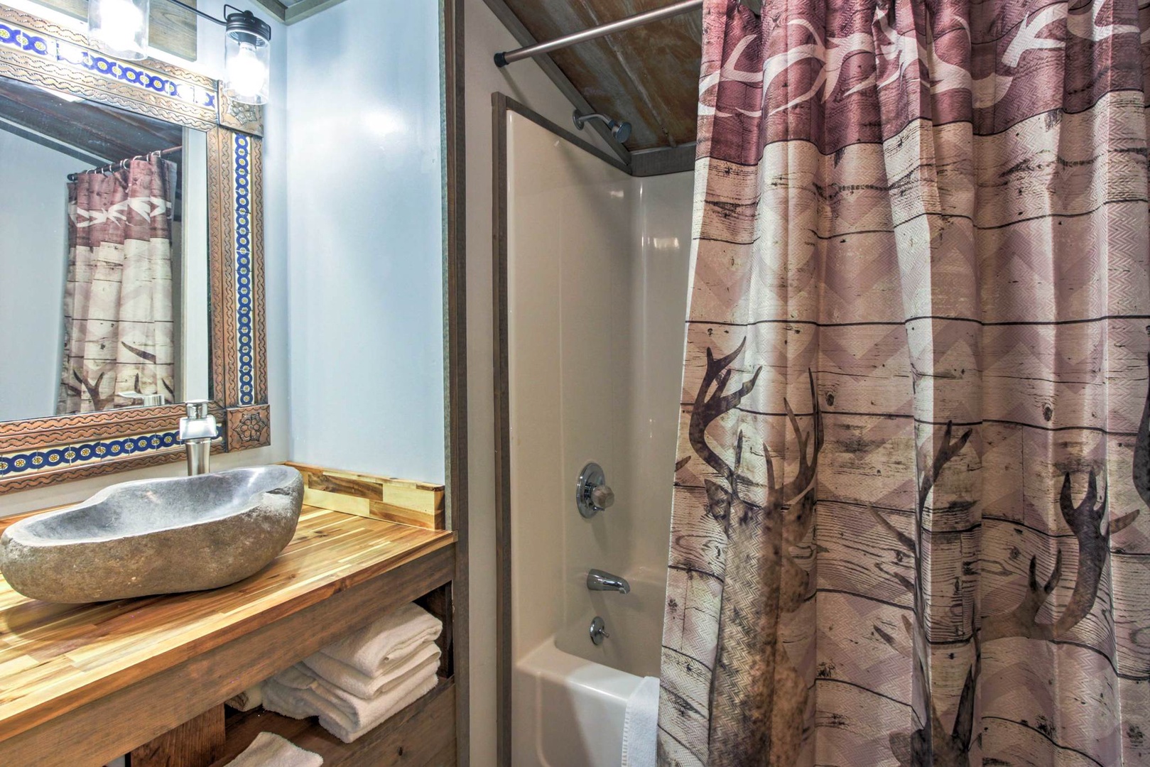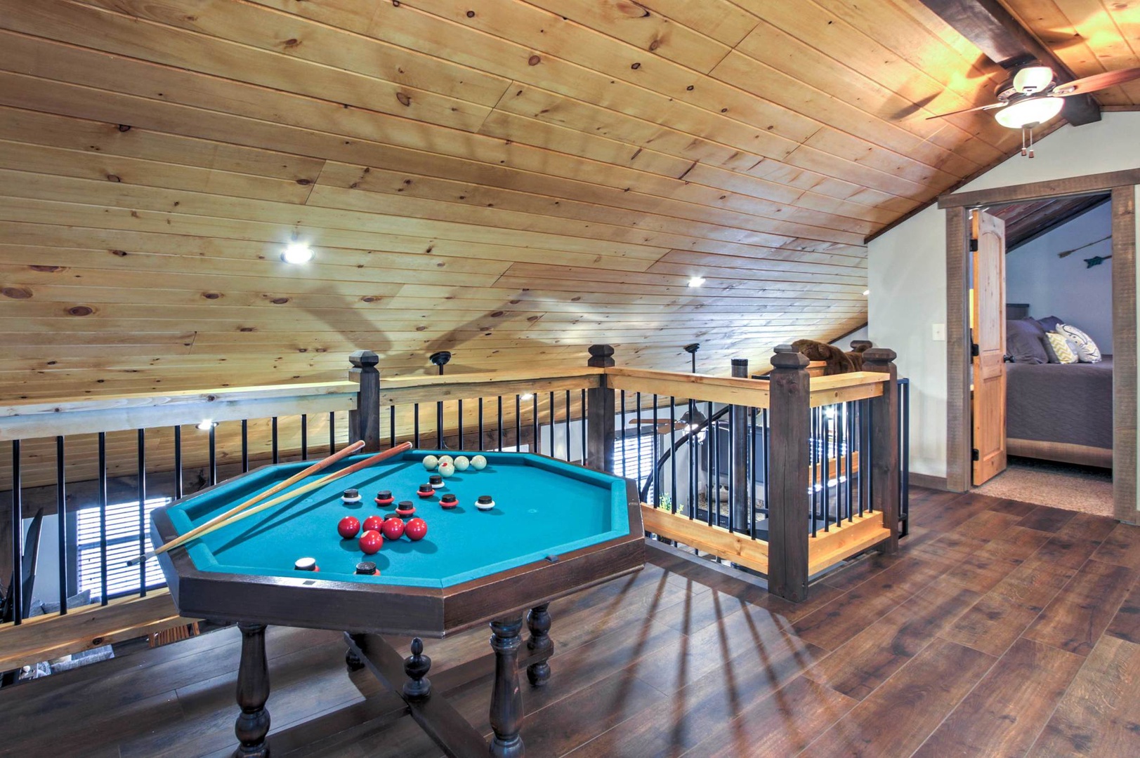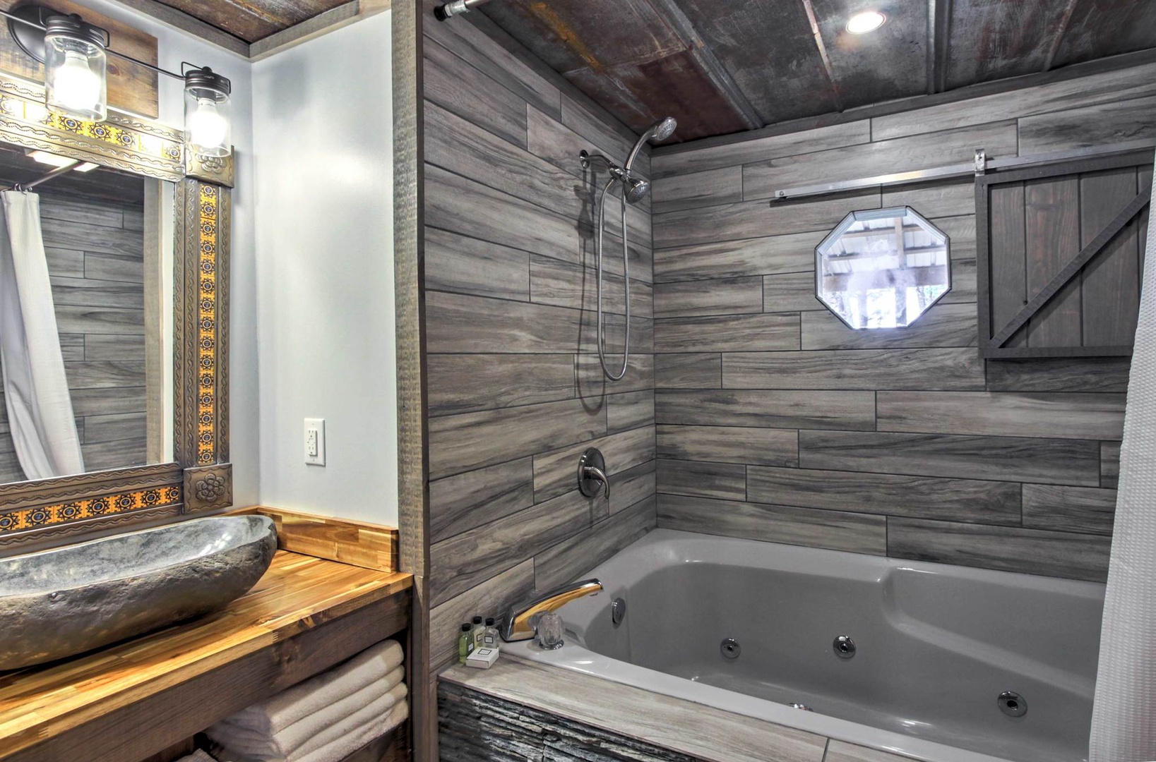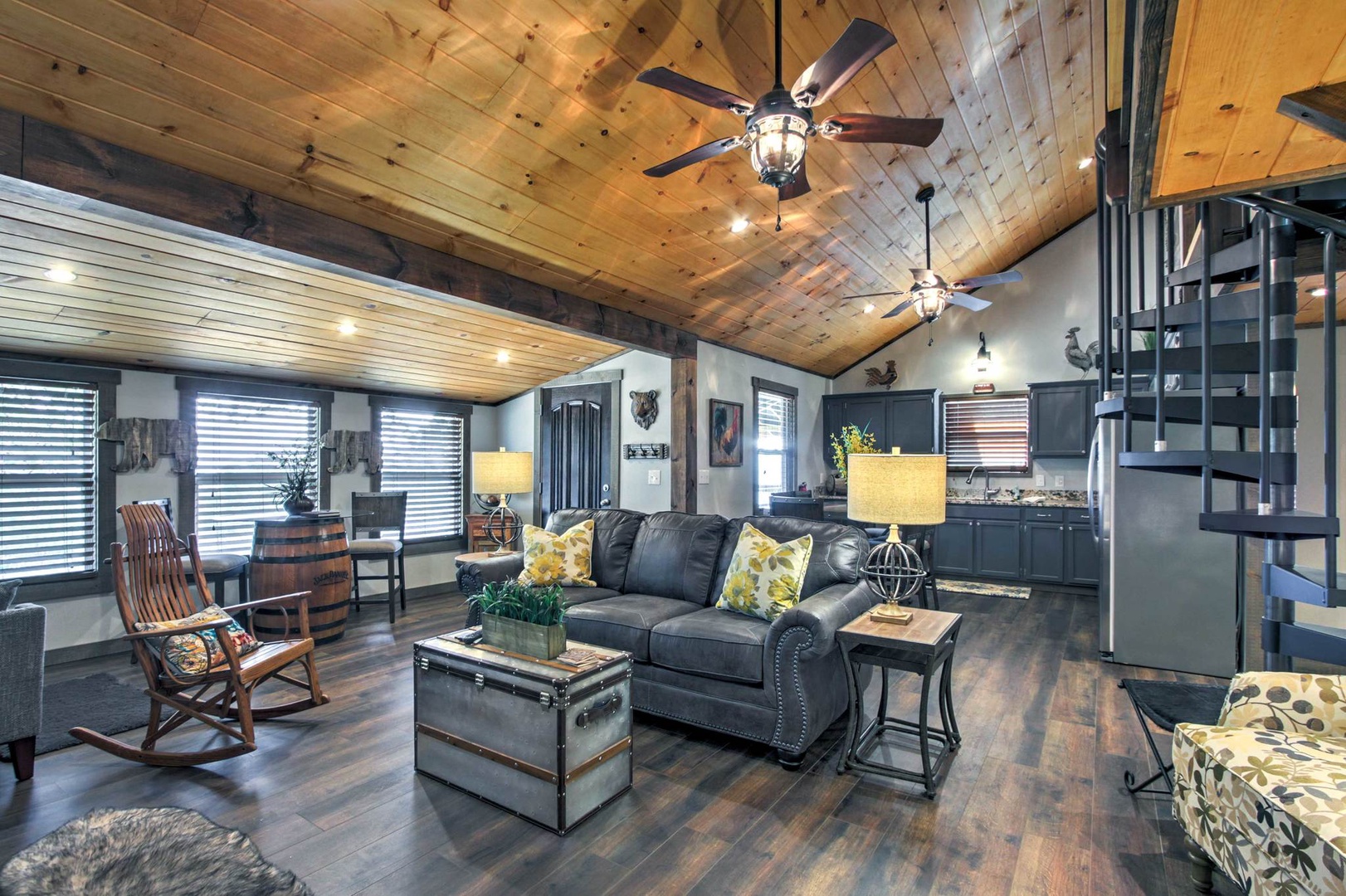 Smoky Mountain Loft....Relax in luxury! Enjoy this Rustic Chic, 3 bed 2 bath Loft Near Dollywood & Gatlinburg. This two story house has a beautiful porch, perfect for lazy days to relax in the rocking chairs while overlooking the mountains, and a fire pit to enjoy at night, which will seat 4 perectly! When you enter the house, it’s designed in this beautiful rustic farm style and offers a beautiful open floor plan to the Living room and Kitchen. The Kitchen is fully equipped and offers granite counter tops, stainless appliances, and is centered around this gorgeous wood stained dinning table that will seat 6 comfortably. The Living area has a beautiful electric fireplace with a flat screen TV, with top of the line furnishings and decor. You can’t go wrong with the whole family siting around the TV, watching the game while the kids play tick tack toe! All the bedrooms come with custom vanities and wood work that makes this place stand out above the rest. The main level bedrooms are decorated separately in Moose and Cow styles, both come with Queen beds and flat screen TV’s. The main level also has a Washer and Dryer and a bathroom with a shower/ tub Jacuzzi combo with a stone sink & waterfall faucet. As you walk up to the spiral staircase to the second floor, you will find the Master King room decorated in tribal print and arrows. A separate bathroom with a shower/ tub combo with no Jacuzzi, also has a stone sink with a waterfall faucet. The upstairs also has a table football, bumper pool table, and a basketball goal with mini basketballs. You’ll get amazing views from the front and back decks. The back deck comes with a charcoal grill, corn hole, and yard dice game. Enjoy relaxing under the covered deck at night with rope lighting and plenty of seating for the whole family! Relax in the gazebo styled hot tub nestled in the woods while overlooking the mountains. VIEWS from every room. Sleeps up to 8 people. Smoky Mountain Serenity, Smoky Mountain Hideout.. all within walking distance. "Smoky Mountain Loft" rests on the outskirts of Pigeon Forge, located just minutes away from great restaurants, shopping, and entertainment! You'll be delighted to discover the most popular attractions of Dollywood and Splash Country are 6 miles away for endless family fun and thrills. Take a 10-minute drive to Pigeon Forge, where you'll visit the Smoky Mountain Alpine Coaster or The Island in Pigeon Forge - an all encompassing entertainment complex with shops, casual eateries, and a few rides. Be sure to taste some local favorites at The Old Mill Restaurant, Jimmy Buffet's Margarita or Paula Deen's Family Kitchen. For groups of adults traveling together, check out top-rated Tennessee Legend Distillery to try delicious whiskeys and unique flavors of moonshine. Wine lovers will want to get straight to Hillside Winery, offering free tours and tastings of their Italian-style wines! A 30-minute drive northeast will take you to Forbidden Caverns, where you'll discover underground trails that lead to sparkling cave formations. Nature enthusiasts will also love ziplining through the aerial adventure park at Firefox Mountain, or day-tripping to Great Smoky Mountain National Park to explore one of the many scenic hiking trails. For delicious restaurants, dazzling entertainment, and unique shopping opportunities, spend a day along the strip in downtown Gatlinburg 20 minutes away. While you’re in the area, stop by Ober Gatlinburg which offers snow skiing, ice skating, a mountain roller coaster, snow tubing, water raft rides, kiddie land, and wildlife encounters, all year long! We also have 2 other cabins within short walking distance. Smoky Mountain Loft 3 bed 2 bath -sleeps 8 , Coming Soon...Smoky Mountain Hideout 3 bed, 3 bath sleeps 10. Getting around Uber, Trolley stop nearby at Patriot Park with transportation to Sevierville , Pigeon Forge, Gatlinburg,- Nearest Major Airport: McGhee Tyson Airport (~39 miles away)