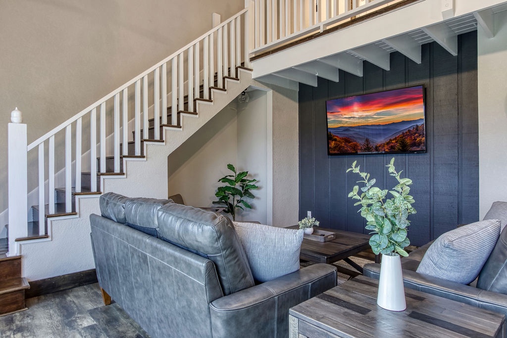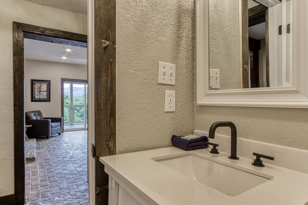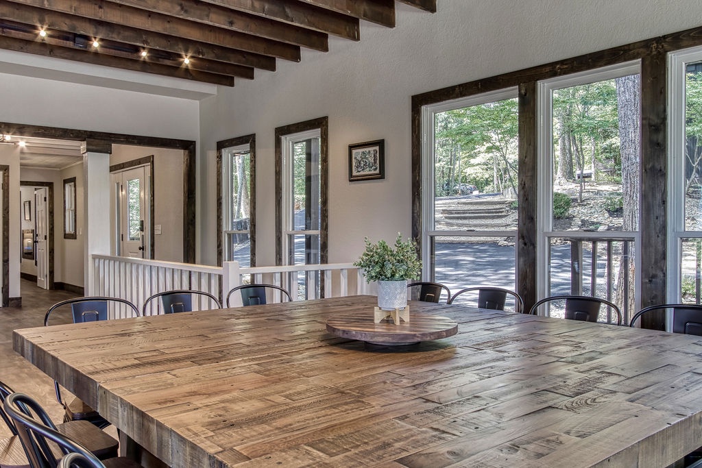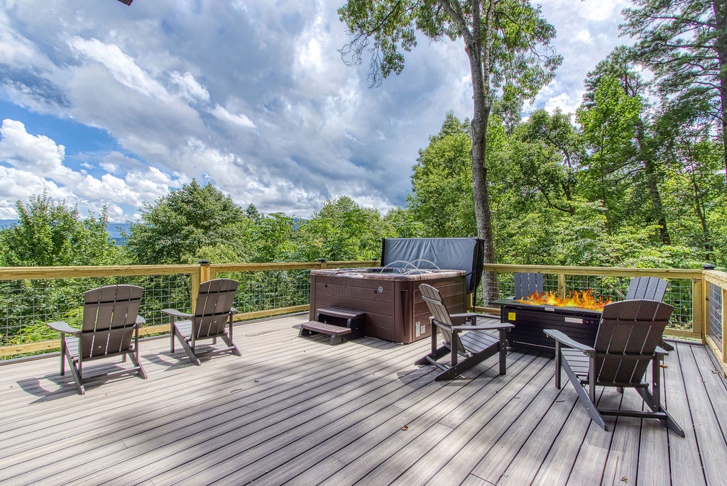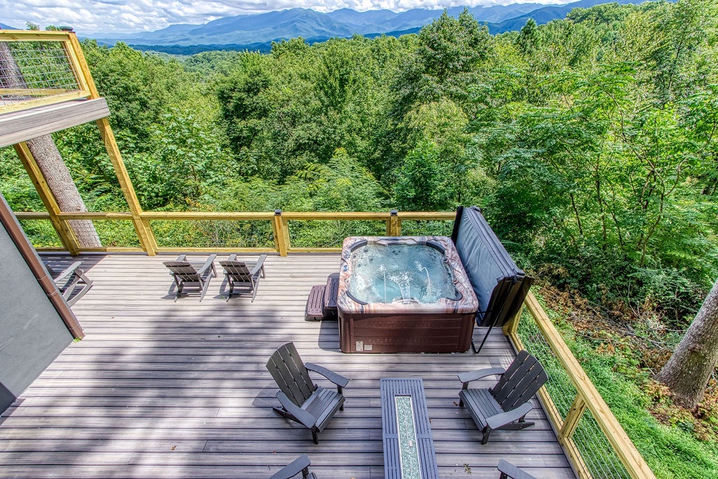 Just 5 minutes from the Gatlinburg Arts & Crafts district, relax in our beautifully restored, luxurious, and spacious Smoky Vista Lodge. Completely renovated in 2022, the Smoky Vista Lodge is a spacious, modern, and inviting vacation home that retains some of the old-world charm with the restored wooden beams and brick basement floor. Situated atop a ridge, this gorgeous Lodge offers plenty of room for the whole family, while providing easy access to both Gatlinburg and Pigeon Forge. With over 4,500 square feet of living space, plus breathtaking year-round views of the Smoky Mountains, your biggest decision will be whether to spend your time indoors relaxing or outdoors soaking up the views. This 6 bedroom, 5-1/2 bath home has something to offer for everyone. Arriving at the property, you’ll appreciate the abundance of paved parking and be drawn to the manicured landscaping. Please note the parking area is shared with the neighboring properties Smoky Vista Cottage & Smoky Vista Lodge. Breathtaking mountain views, including Mount LeConte, can be seen year-round, and as you approach the home you will be drawn by the inviting cat walks and tree house situated just to the side of the lodge. The outdoor living space of this home is truly unequaled and captivating. As you enter the home, you will feel the attention to detail in this well decorated, spacious, yet cozy home. You will immediately be drawn to the expansive living area, featuring a wall of windows framing the picturesque mountain views. It offers two seating areas, one whose focal point is a converted electric fireplace utilizing the original, stately stone wall and the other a 65” smart TV. Just off to the left of the entry is the well-stocked kitchen with new stainless-steel appliances and a large, attached dining area with seating for 29. The awe-inspiring views seen from the kitchen will invite you out to the 2 adjoining outdoor spaces, one a dining deck with 5 large picnic tables and the other a deck running the length of the home overlooking the mountains with high top tables and seating, perfect for enjoying your morning coffee or an evening libation. To the right of the entrance is a stand-alone bathroom with a tiled shower and a king bedroom. This welcoming space offers an electric fireplace, smart tv and French doors leading you to the home’s treehouse. Just up the beautifully restored staircase you will find two king suites that share a jack-and-jill bathroom. Both rooms feature smart TVs, electric fireplaces and access to the decks located on the front of the lodge. At the end of the hall is the Lodge’s stately master suite. This massive space features access to the beautiful decks on either side of the house, one being your own private deck for 2, extended at the highest level of the home. There are 2 inviting sitting areas, one with a sleeper sofa, smart tv and 60” electric fireplace, making this room perfect for parents with small children. Through restored French doors you will find the luxurious master bathroom, whose focal point is a gorgeous tiled walk-in shower perfect for washing the day away. Head to the lowest level of Smoky Vista Lodge to find another beautiful master king suite with its own private deck, smart TV and electric fireplace. On this level is a large two-room game room featuring restored brick floors, 3 large smart TVs, a brand-new Olhausen pool table, air hockey table, 2 full-size arcade games, 12-ft shuffleboard, professional poker table, additional seating and more of the home’s incredible views. Just through the game room you will find an additional full bath and beautiful bunk room featuring two sets of twin bunks as well as the laundry room. Off the game room you will find another massive deck featuring a brand new large hot tub and fire pit, the perfect space for relaxing at the end of the day.