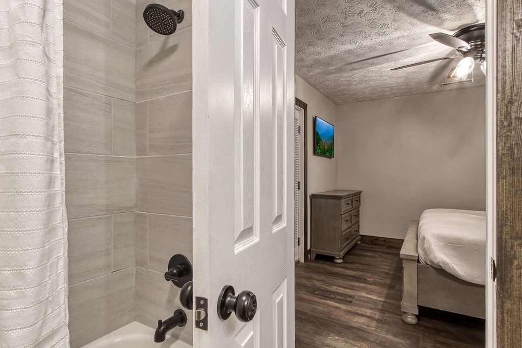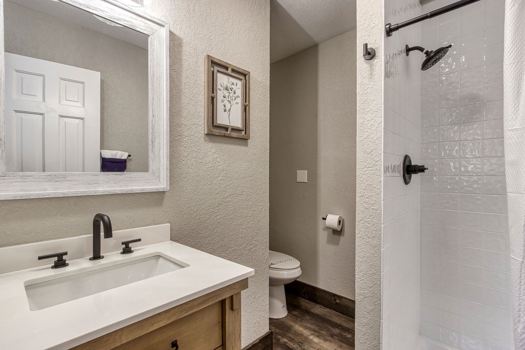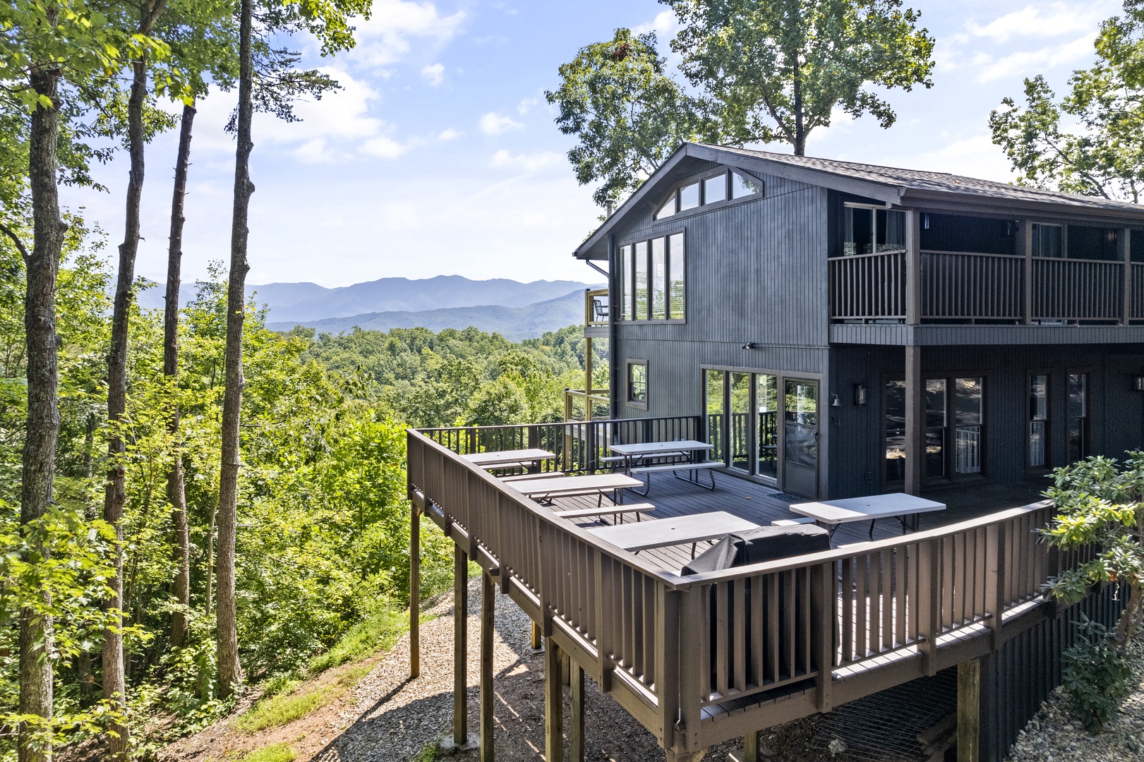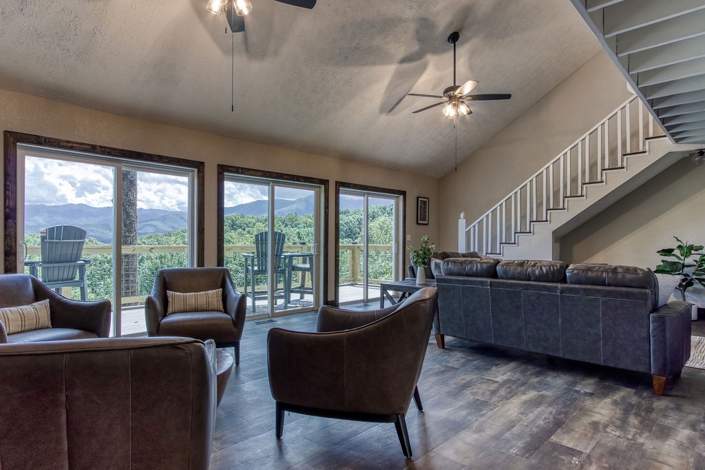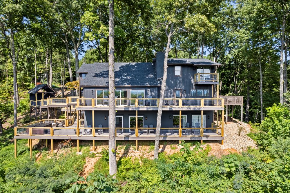 Just 5 minutes from the Gatlinburg Arts & Crafts district, relax in our beautifully restored, luxurious, and spacious Smoky Vista Lodge. Completely renovated in 2022, the Smoky Vista Lodge is a spacious, modern, and inviting vacation home that retains some of the old-world charm with the restored wooden beams and brick basement floor. Situated atop a ridge, this gorgeous Lodge offers plenty of room for the whole family, while providing easy access to both Gatlinburg and Pigeon Forge. With over 4,500 square feet of living space, plus breathtaking year-round views of the Smoky Mountains, your biggest decision will be whether to spend your time indoors relaxing or outdoors soaking up the views. This 6 bedroom, 5-1/2 bath home has something to offer for everyone. Arriving at the property, you’ll appreciate the abundance of paved parking and be drawn to the manicured landscaping. Please note the parking area is shared with the neighboring properties Smoky Vista Cottage & Smoky Vista Lodge. Breathtaking mountain views, including Mount LeConte, can be seen year-round, and as you approach the home you will be drawn by the inviting cat walks and tree house situated just to the side of the lodge. The outdoor living space of this home is truly unequaled and captivating. As you enter the home, you will feel the attention to detail in this well decorated, spacious, yet cozy home. You will immediately be drawn to the expansive living area, featuring a wall of windows framing the picturesque mountain views. It offers two seating areas, one whose focal point is a converted electric fireplace utilizing the original, stately stone wall and the other a 65” smart TV. Just off to the left of the entry is the well-stocked kitchen with new stainless-steel appliances and a large, attached dining area with seating for 29. The awe-inspiring views seen from the kitchen will invite you out to the 2 adjoining outdoor spaces, one a dining deck with 5 large picnic tables and the other a deck running the length of the home overlooking the mountains with high top tables and seating, perfect for enjoying your morning coffee or an evening libation. To the right of the entrance is a stand-alone bathroom with a tiled shower and a king bedroom. This welcoming space offers an electric fireplace, smart tv and French doors leading you to the home’s treehouse. Just up the beautifully restored staircase you will find two king suites that share a jack-and-jill bathroom. Both rooms feature smart TVs, electric fireplaces and access to the decks located on the front of the lodge. At the end of the hall is the Lodge’s stately master suite. This massive space features access to the beautiful decks on either side of the house, one being your own private deck for 2, extended at the highest level of the home. There are 2 inviting sitting areas, one with a sleeper sofa, smart tv and 60” electric fireplace, making this room perfect for parents with small children. Through restored French doors you will find the luxurious master bathroom, whose focal point is a gorgeous tiled walk-in shower perfect for washing the day away. Head to the lowest level of Smoky Vista Lodge to find another beautiful master king suite with its own private deck, smart TV and electric fireplace. On this level is a large two-room game room featuring restored brick floors, 3 large smart TVs, a brand-new Olhausen pool table, air hockey table, 2 full-size arcade games, 12-ft shuffleboard, professional poker table, additional seating and more of the home’s incredible views. Just through the game room you will find an additional full bath and beautiful bunk room featuring two sets of twin bunks as well as the laundry room. Off the game room you will find another massive deck featuring a brand new large hot tub and fire pit, the perfect space for relaxing at the end of the day.