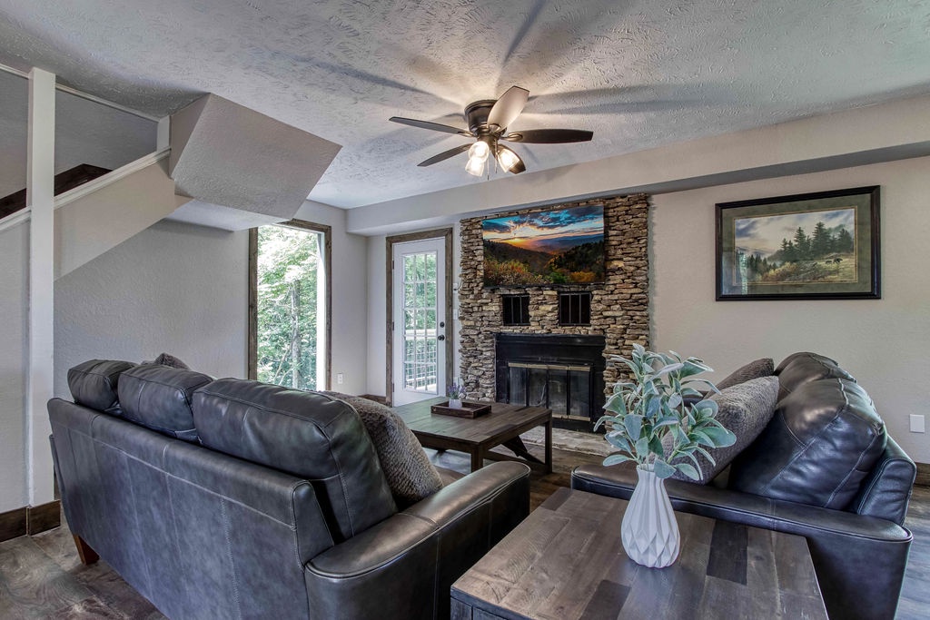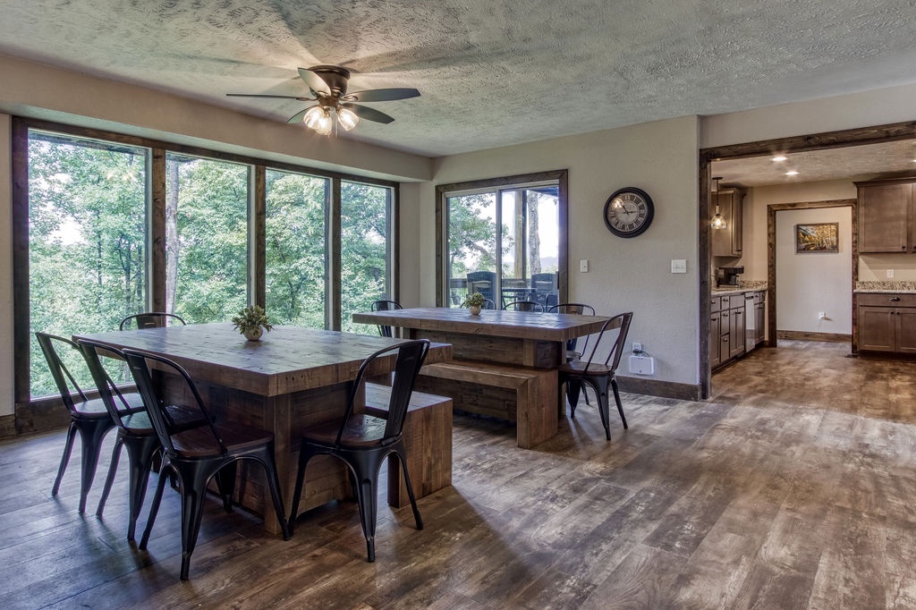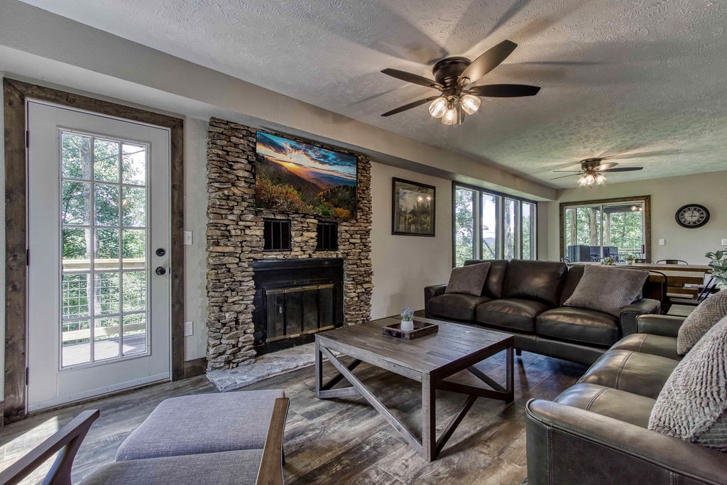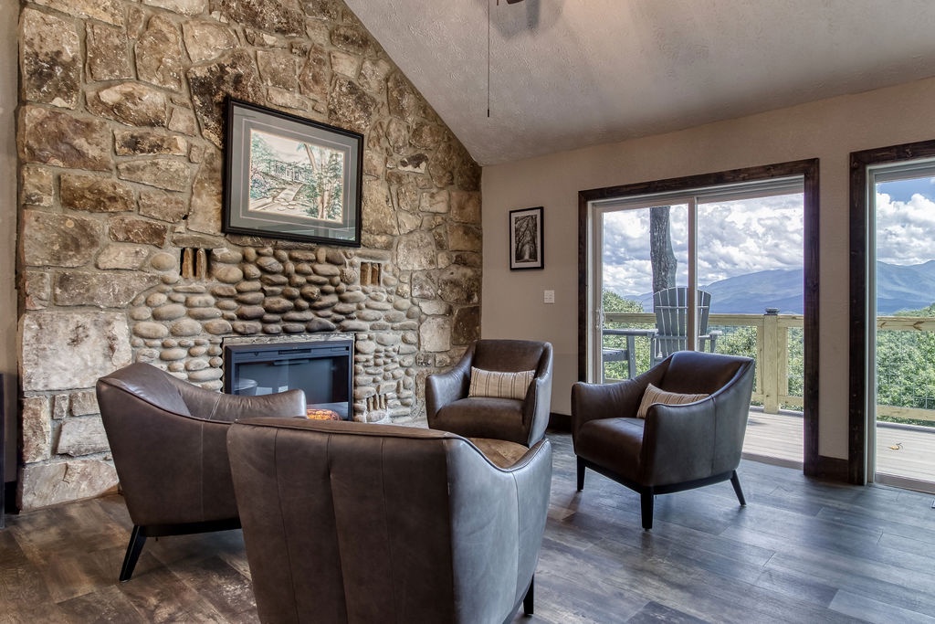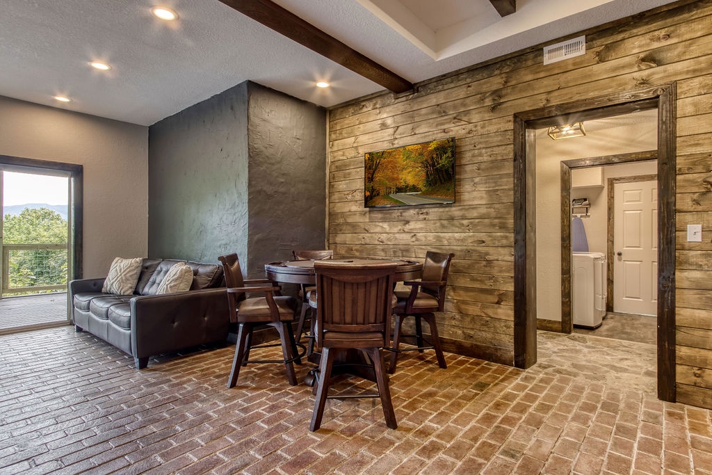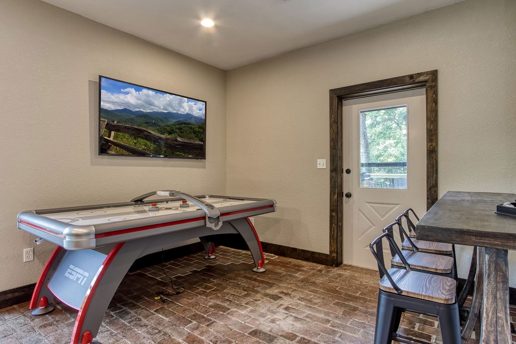 Planning your next family reunion or corporate retreat? If you want to veer away from the typical local park and backyard cookout, come create the most memorable vacation ever. From the breathtaking views to the very spacious accommodations. Along with the calming and relaxing setting of the mountains. Welcome to Planning your next family reunion or corporate retreat? If you want to veer away from the typical local park and backyard cookout, come create the most memorable vacation ever. From the breathtaking views to the very spacious accommodations. Along with the calming and relaxing setting of the mountains. Welcome to Smoky Vista Resort. Sitting atop the treetops of Gatlinburg, you won't want to spend another big family get together anywhere else. Smoky Vista Resort is comprised of three beautifully renovated homes. Smoky Vista Retreat , Smoky Vista Cottage and Smoky Vista Lodge. When you pull up into the level driveway with ample space for parking you will see Smoky Vista Retreat directly in front of you. Smoky Vista Retreat is a 6 bedroom, 6 bathroom home with ample decking and space to be enjoyed by all. It has a lower level exterior entry only double king suite with a shared convenience center that includes a mini fridge and coffee bar. Just a few steps from the entry of the lower level you will find the brand new, covered hot tub with a bar and seating for 2. Inside on the main level you will find the fully equipped kitchen with brand new stainless steel appliances, the large dining & living area, a bathroom nestled at the end of the hall, a master suite with bathroom and a king bedroom. Just a short climb up the stairs to the top floor you will find the laundry room, another king master suite, the large game room with an electric fireplace equipped with a pool table, a multicade and enough TV’s to catch all the game day feats, another full bathroom and the bunk room which house two sets of twin bunk beds. There is also a deck with an outdoor firepit to enjoy a libation around during half time. Nestled between Smoky Vista Retreat and Smoky Vista Lodge is the gorgeous one bedroom Smoky Vista Cottage. Equipped with its own rotund hot tub, this little cottage will meet the needs of a family of 4 with a King bed and a queen sleeper sofa in the living area. Smoky Vista Cottage is equipped with a full kitchen and dining area as well. The perfect little space for newlyweds or grandparents for your family reunion or the CEO for your executive retreat. To the right of the cottage is the incredibly restored Smoky Vista Lodge. This home is spectacular to say the least. It is a 6 bedroom, 6 bathroom home with 3 stories featuring exposed wood beams, restored original brick flooring in the game room and so much decking to enjoy the endless views of the Great Smoky Mountains. Walking in the front door of the lodge you will be greeted with beautiful views just through the sitting room glass doors. To the left you will find the dining room with ample seating for the whole crew, the modern mountain home kitchen equipped with everything you will need to prepare meals, just off the dining room there is a huge dining deck equipped with 5 large resin picnic tables and a gas grill. Back inside on the main level you will find a king bedroom with electric fireplace and doors to the deck, a full bathroom, a sitting area in front of the fireplace as well as a sitting area in front of the tv. Upstairs you will find two king bedrooms with electric fireplaces and a jack and jill bathroom both having access to the deck facing the driveway. Just down the catwalk you will find the Rolls Royce of Master Suites with a sitting area with a sleeper sofa, a reading area, a beautiful walk in shower, and a private deck on each side of the room, one with an impeccable view of the mountains. Head down to the bottom level to find another king suite with electric fireplace and mountain views just off the gameroom with an electric fireplace equipped with shuffleboard, a pool table, a poker table, multicade and enough TV’s to catch all the game day goodness. You will also find the laundry room on this floor, a full bathroom and the bunkroom equipped with two sets of twin bunk beds. It’s time to play your getaway for Smoky Vista Resort in Gatlinburg, Tennessee!