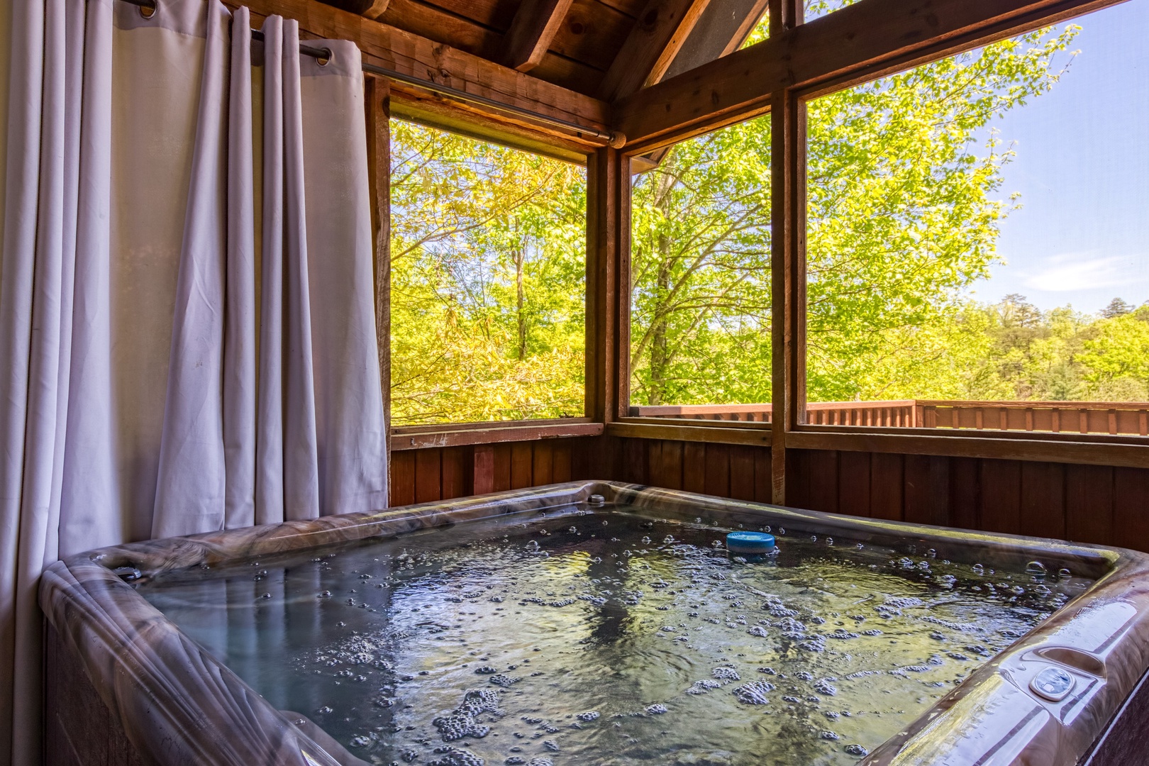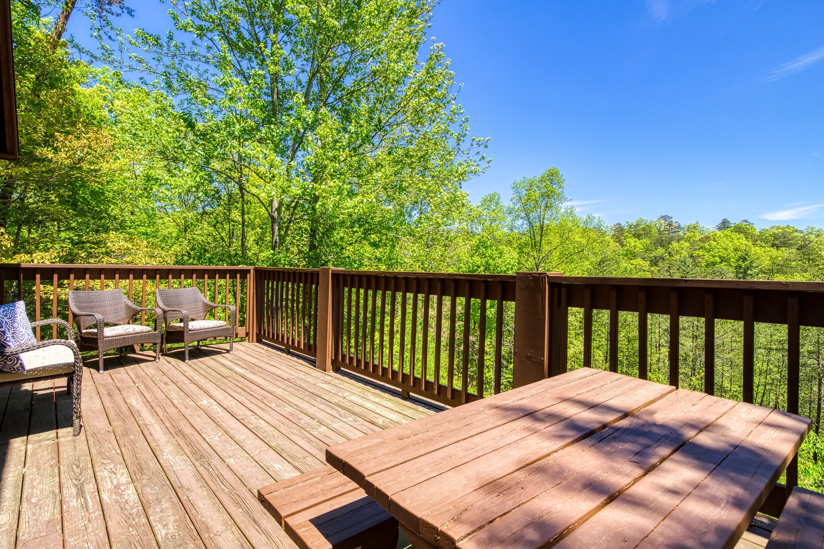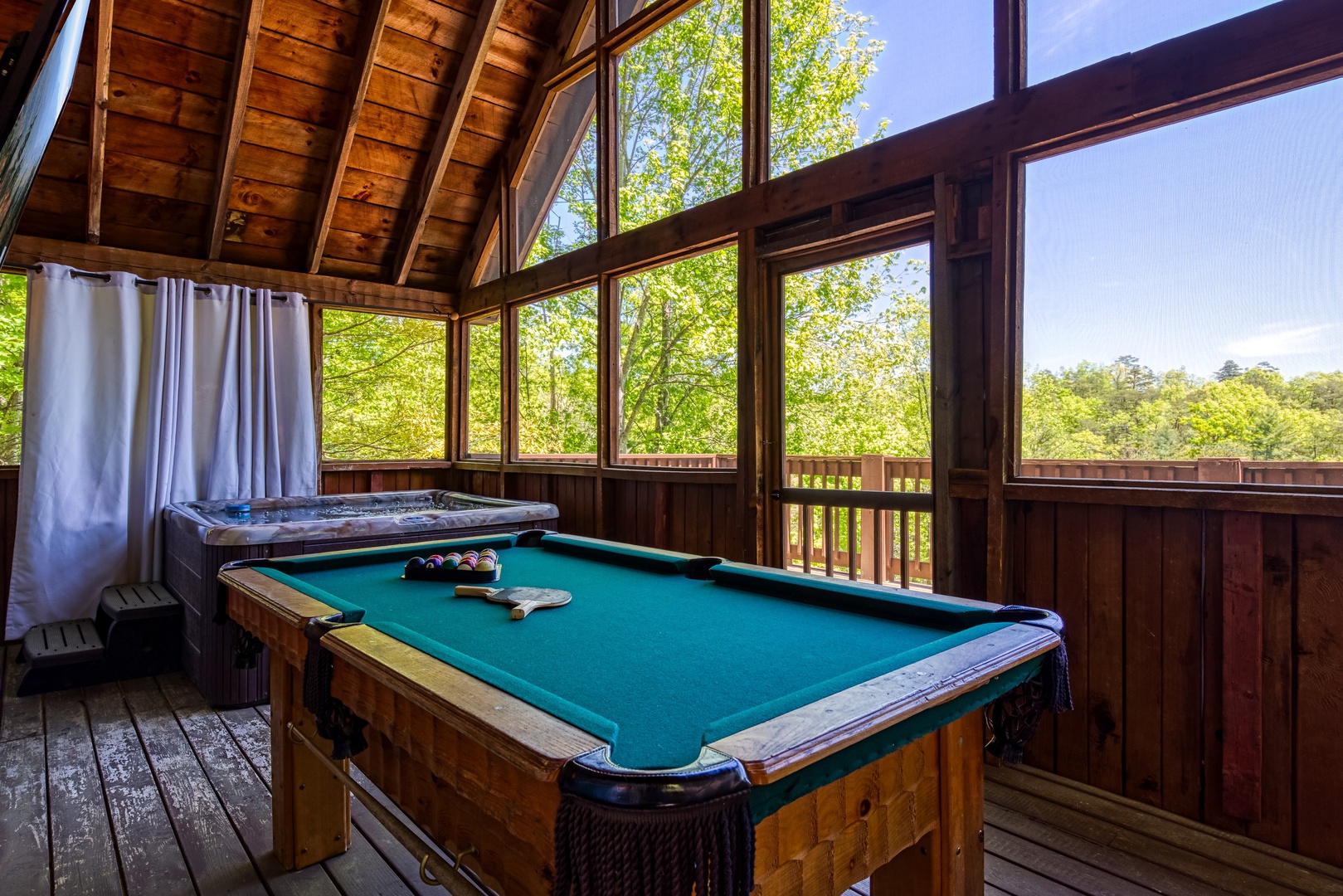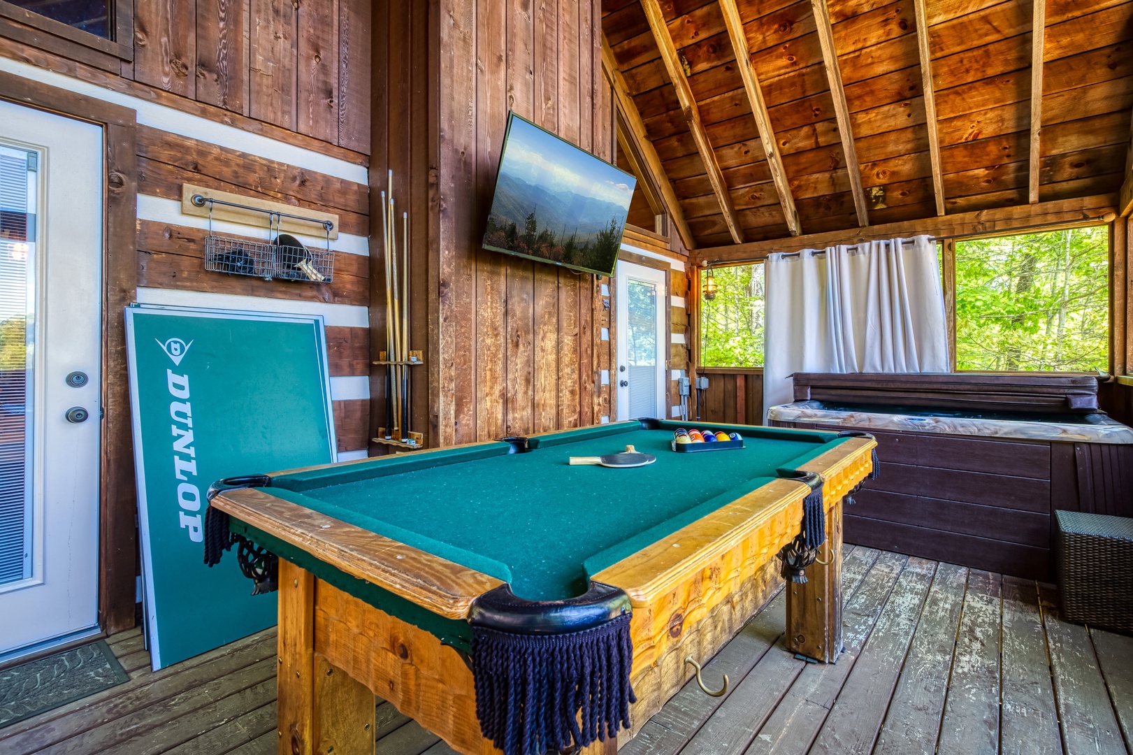 Outside, unwind in the bubbling hot tub on the screened-in porch, where the surrounding forest provides a serene backdrop. Challenge your companions to a friendly game of pool on the outdoor table, or gather around the fire pit in the yard for s'mores under the starlit sky.