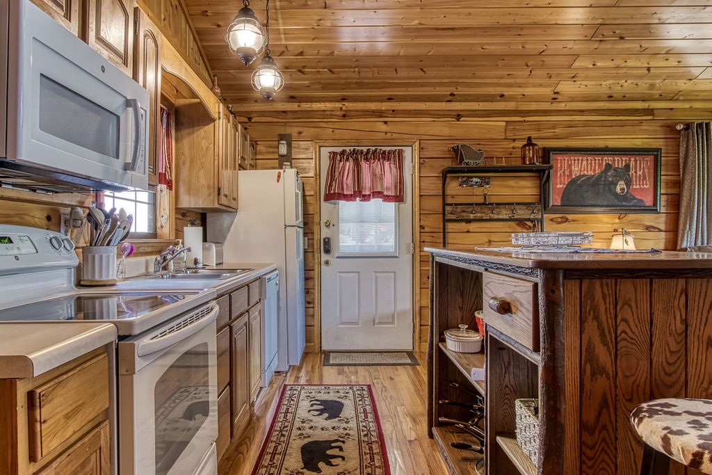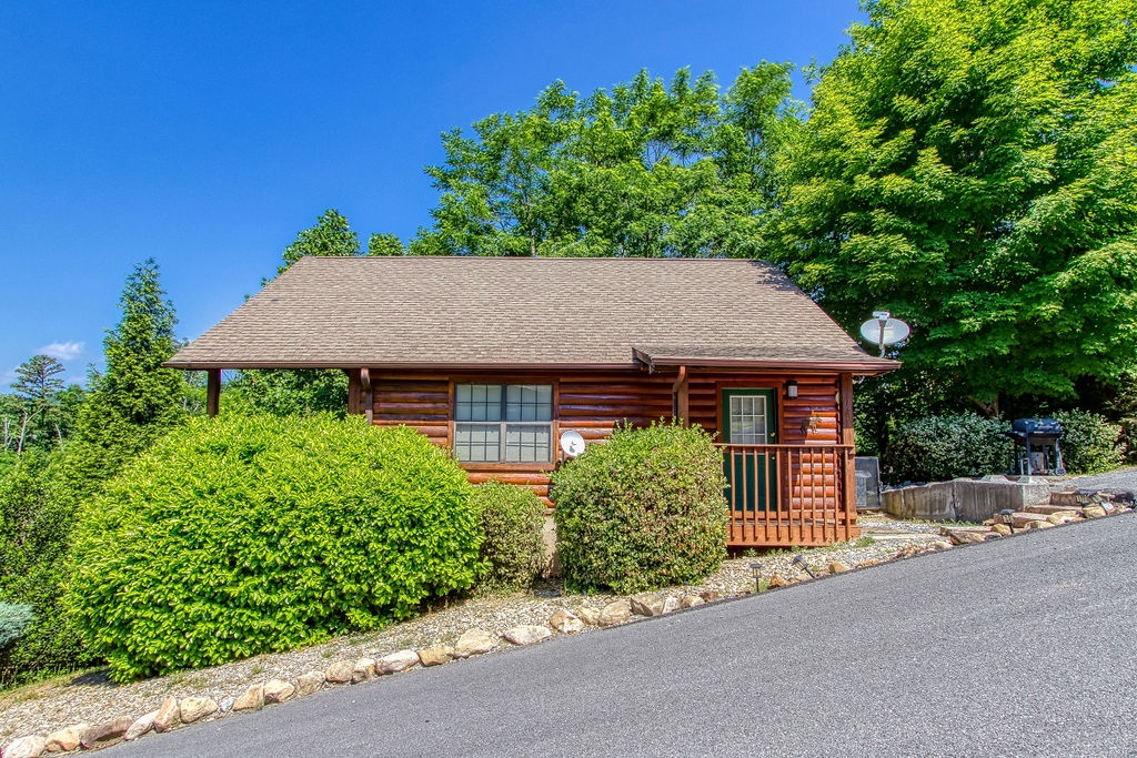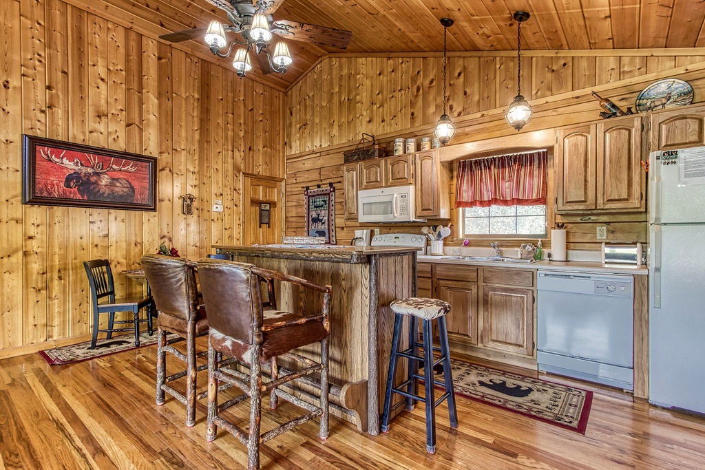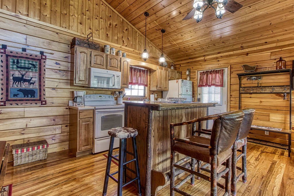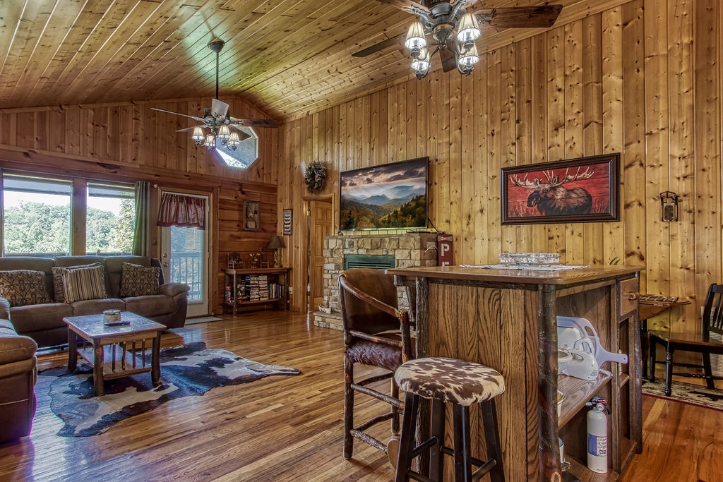 This cabin is a 1-bedroom cabin, which sleeps 2 and consists of an open floor plan. There is only 1 step to reach the cabin which is all 1 level. Offering high vaulted ceilings, this cabin is both spacious, cozy, and comforting all at the same time. There is a fully equipped kitchen that includes a dishwasher, and bar-style dining for 2. There are 2 reclining sofas in front of the large stone gas fireplace. There is a Queen bed, and a large jacuzzi tub, with a separate full bath including a shower/tub combo.