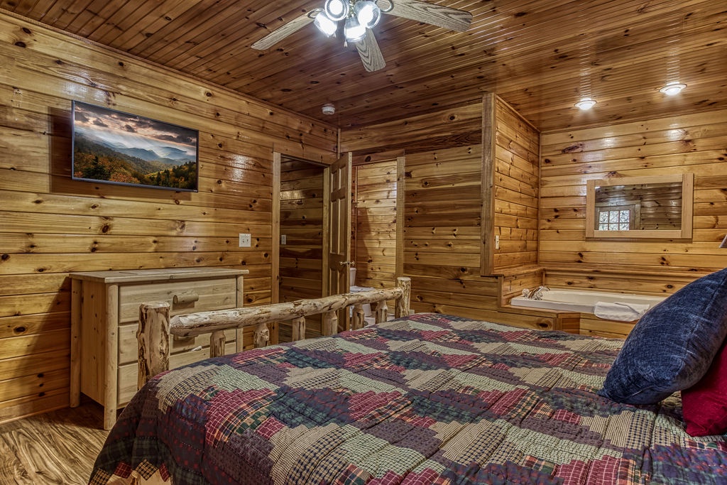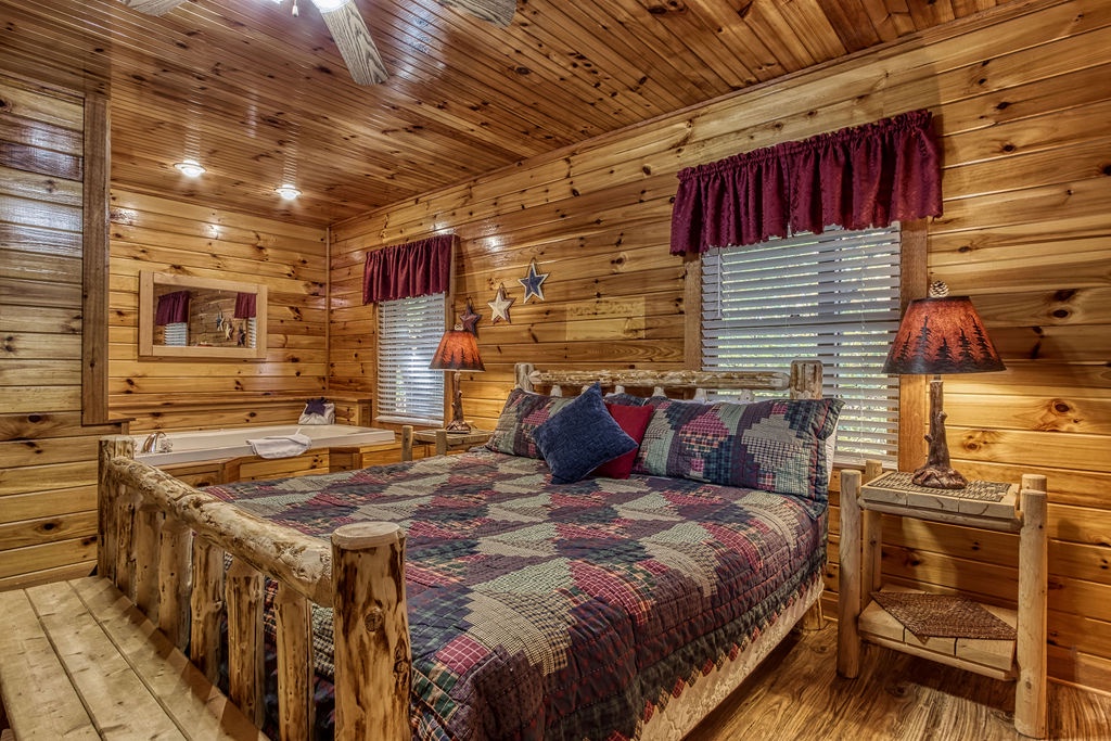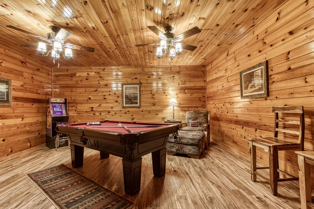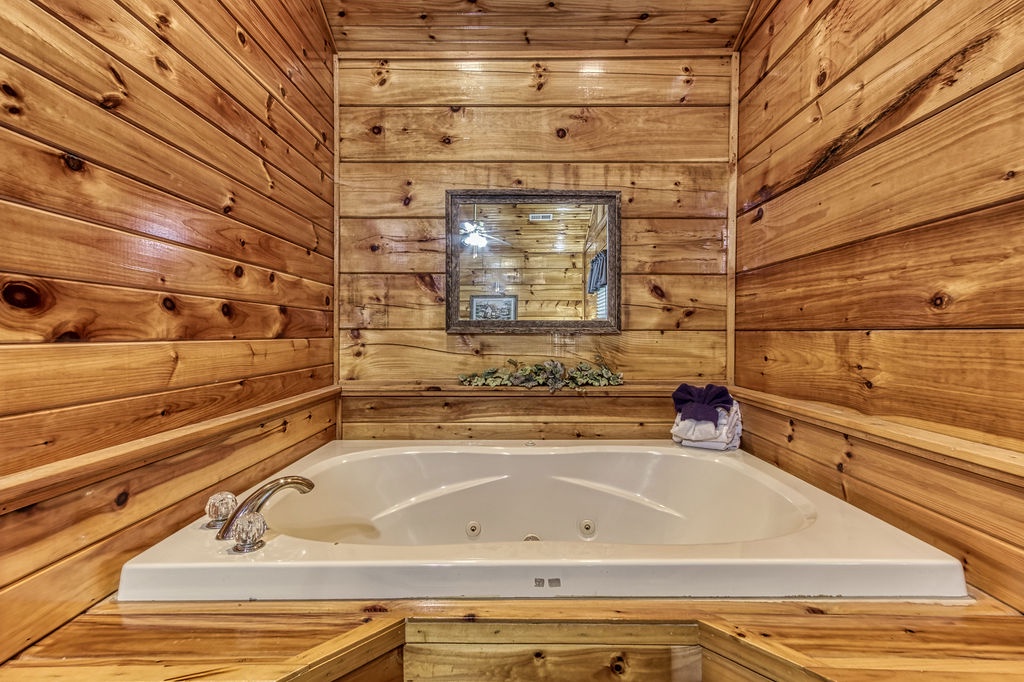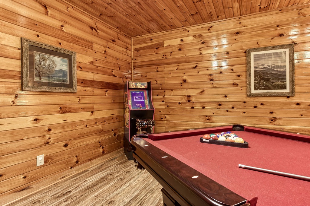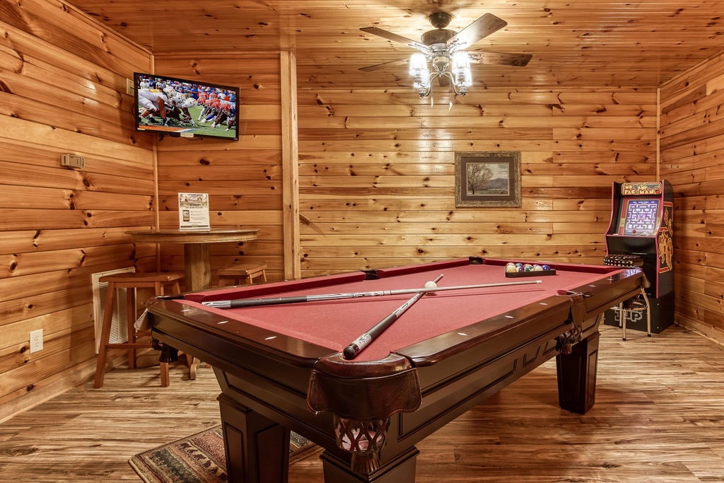 On the lower level, you will find the game room that includes a pool table, an additional TV, and the washer and dryer. There is also a King bedroom with a Jacuzzi tub and flat screen TV that has a full bathroom that has a combination shower & bathtub.