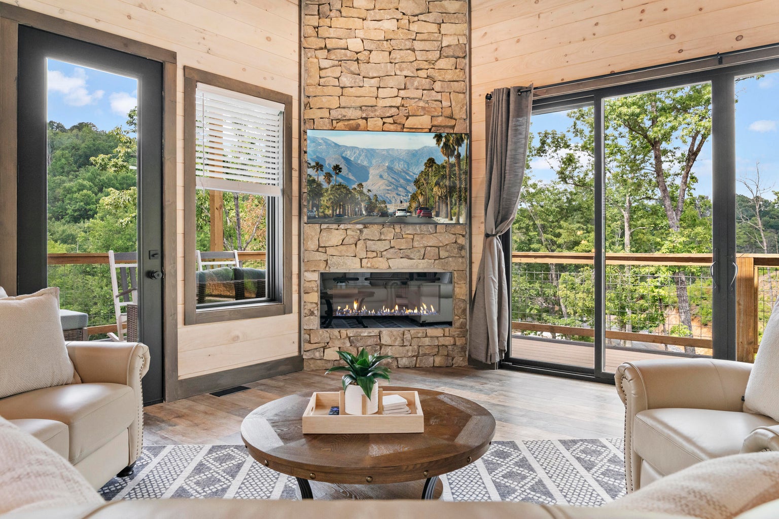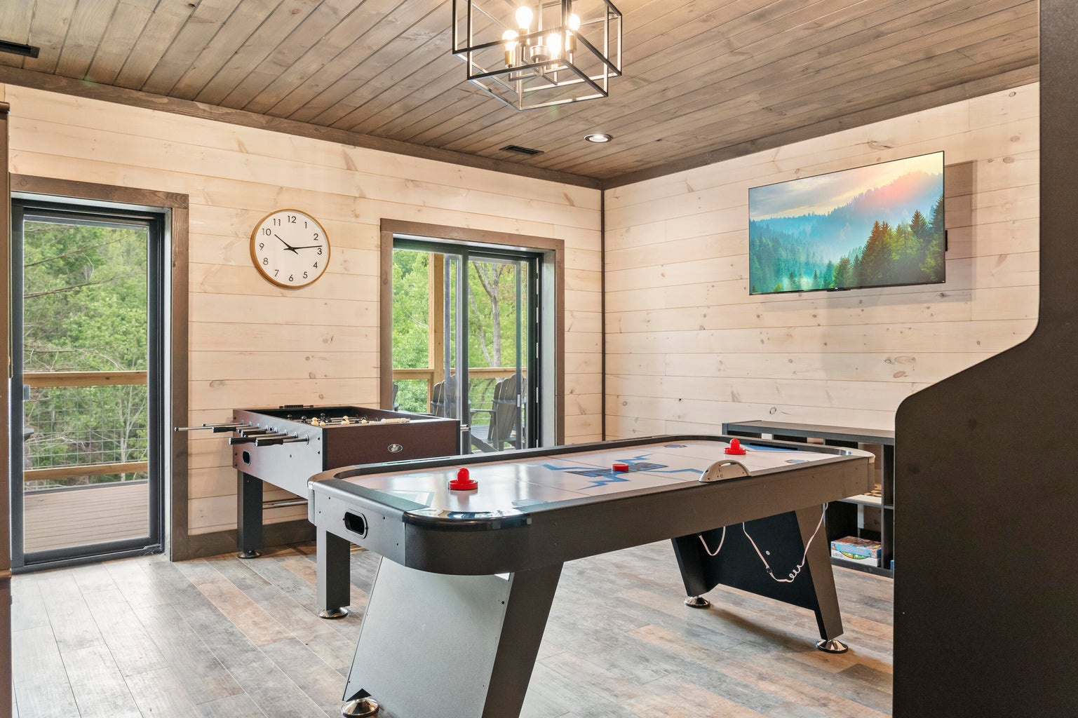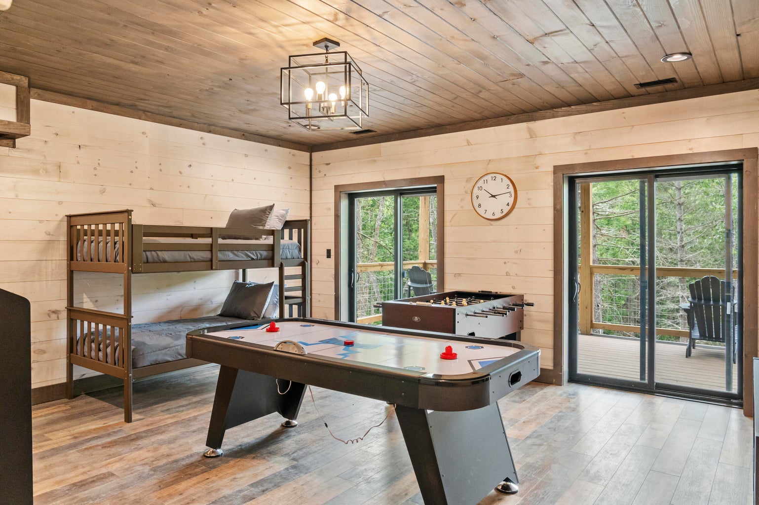 Enjoy relaxing evenings by the fireplace in the inviting living area or head to the game room for some friendly competition. Step outside to find a private hot tub and a fire pit, perfect for stargazing or sharing stories under the night sky. For nature lovers, a nearby walking trail leads to a breathtaking 75-foot cascading waterfall, offering an unforgettable adventure right at your doorstep.