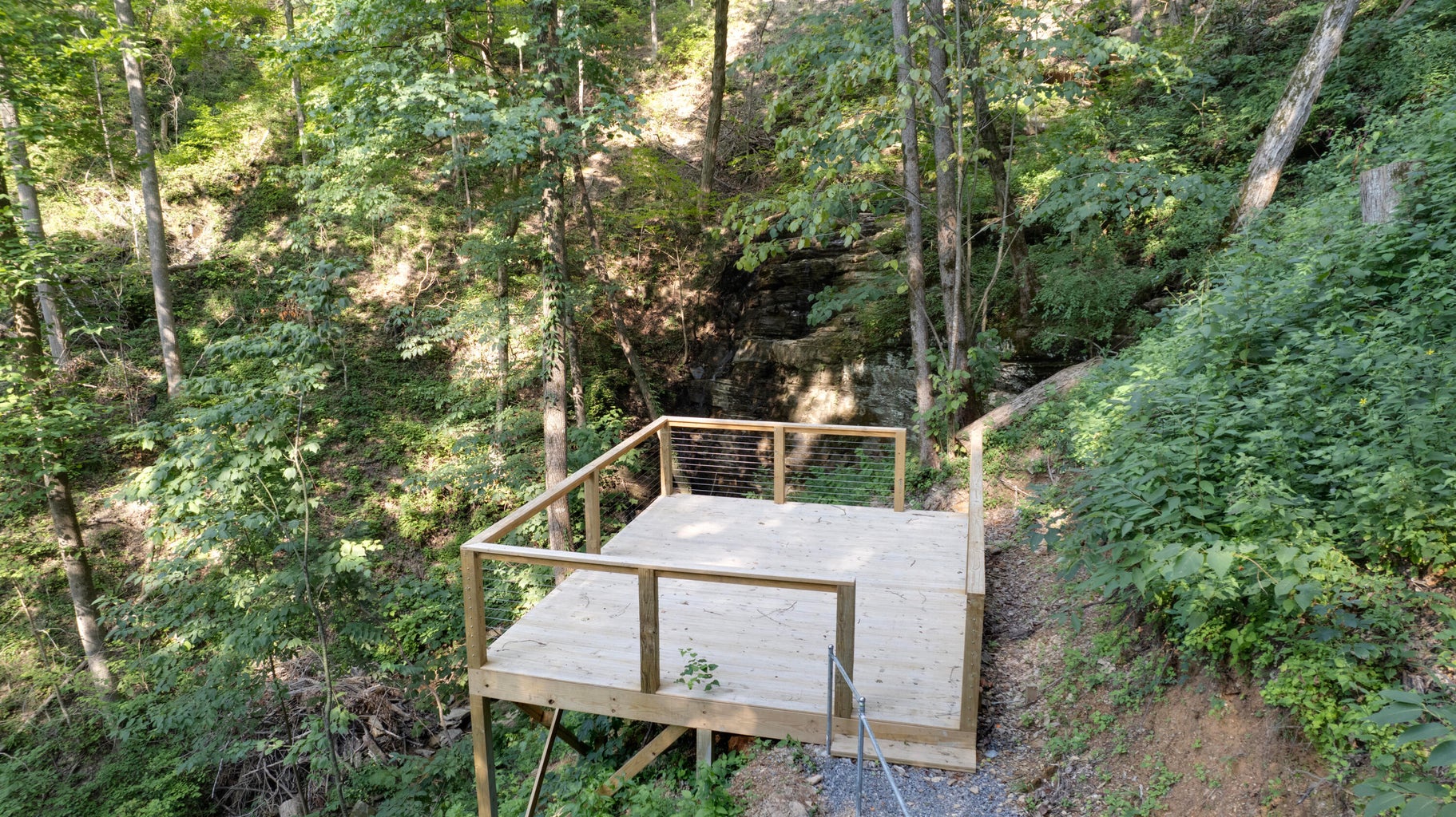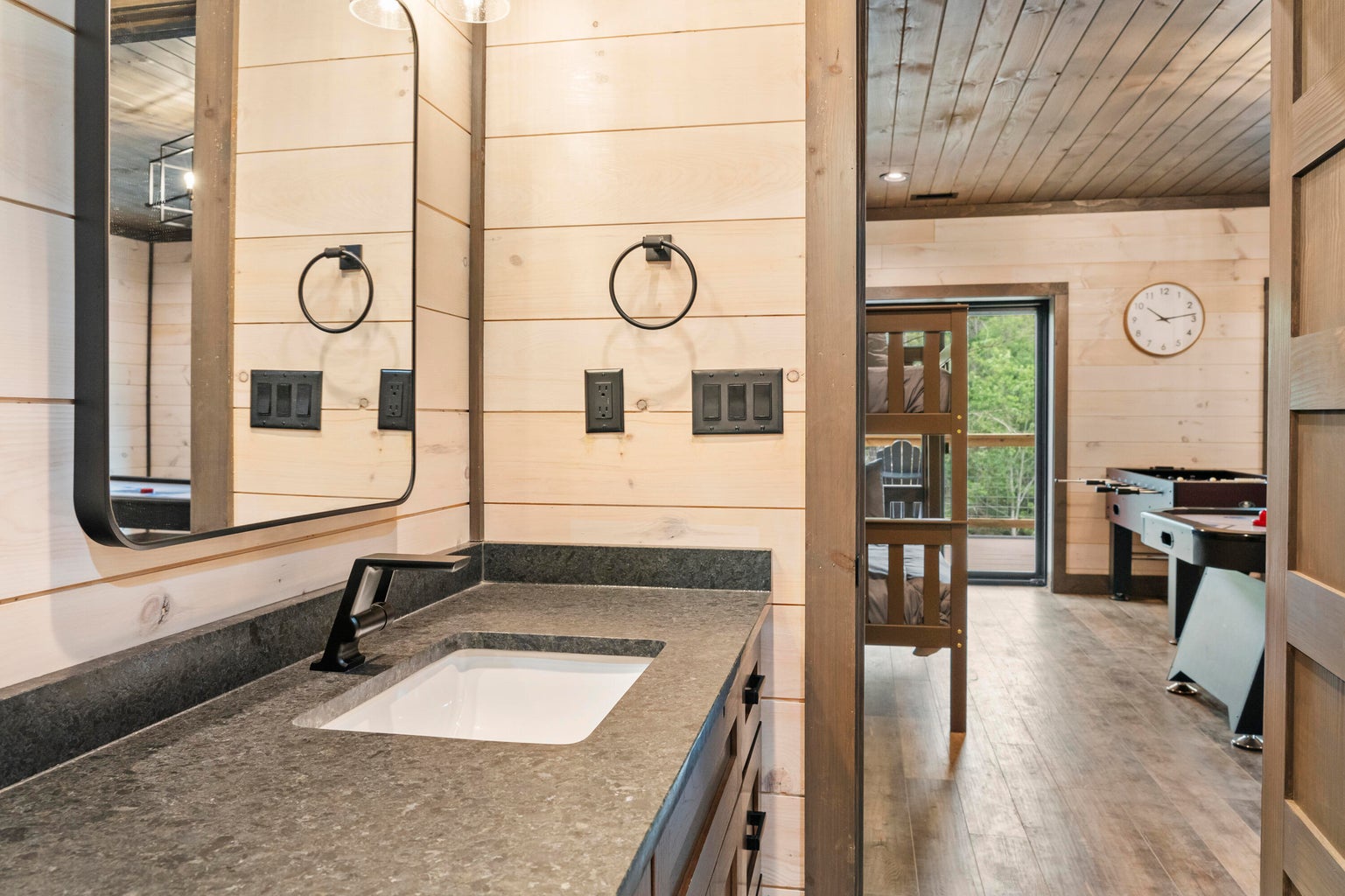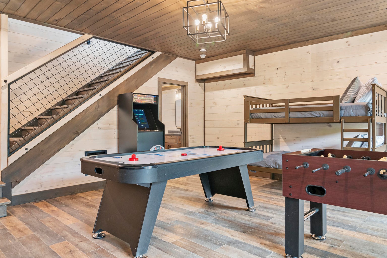 Enjoy relaxing evenings by the fireplace in the inviting living area or head to the game room for some friendly competition. Step outside to find a private hot tub and a fire pit, perfect for stargazing or sharing stories under the night sky. For nature lovers, a nearby walking trail leads to a breathtaking 75-foot cascading waterfall, offering an unforgettable adventure right at your doorstep.